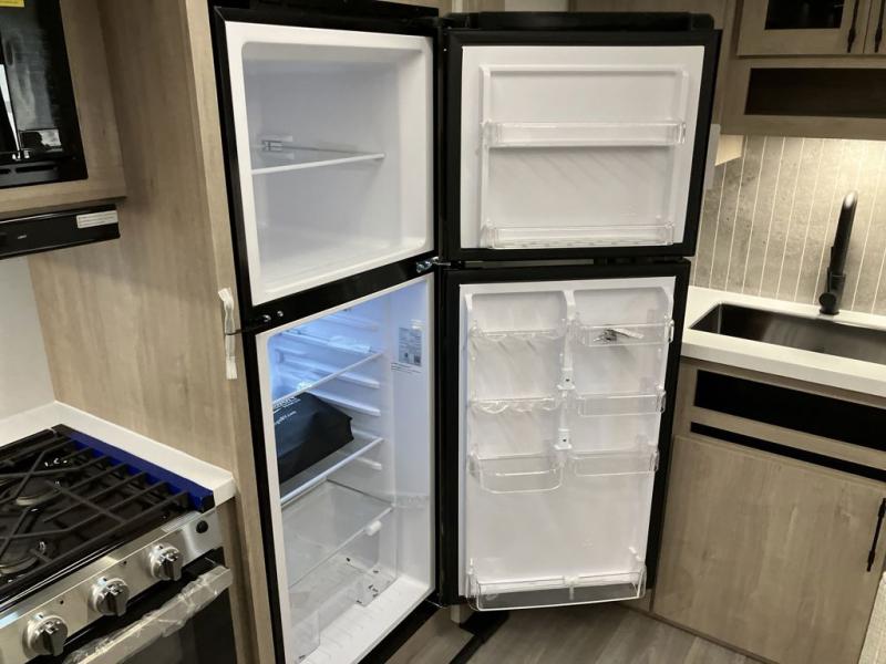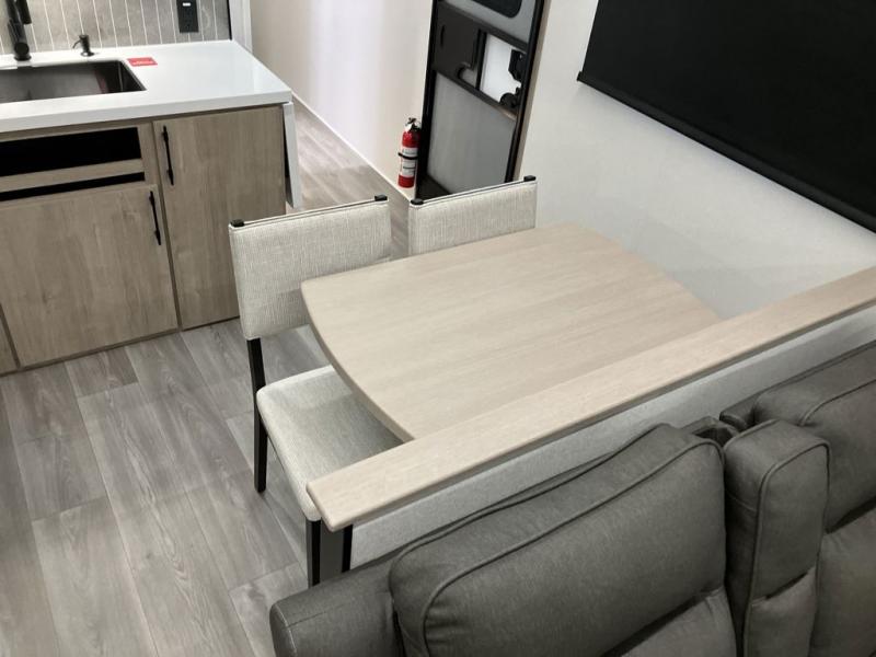 The rear living room on this Imagine travel trailer is just what you'll want when you're looking for a little down time. This room has opposing tri-fold sofas within slides, theater seating, and a TV. Another place that you can sit down at is the free-standing adjustable dinette. You can sit here with a fresh cup of coffee in the afternoon as you map out your hike for tomorrow. The kitchen offers you a flip-up countertop extension, a microwave, a three-burner range with oven, a 10-cubic foot 12V refrigerator, and pantry to help you make meals, and there is a private bedroom with a 60" x 80" bed to rest on at the end of the day.