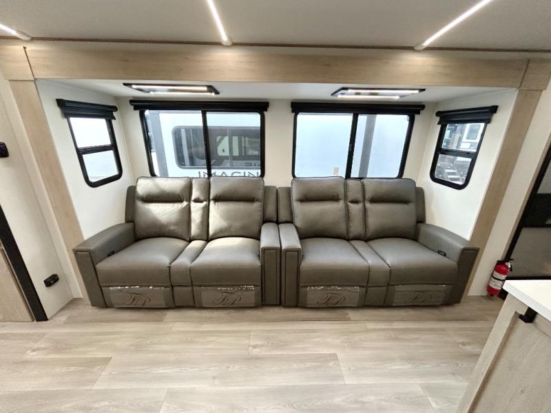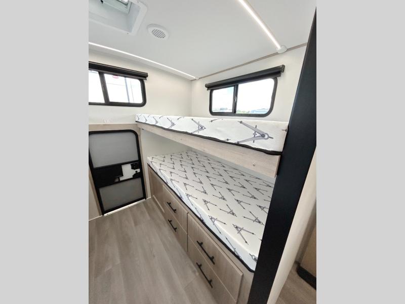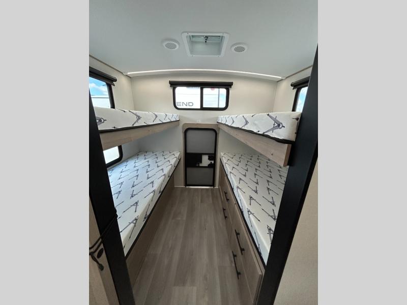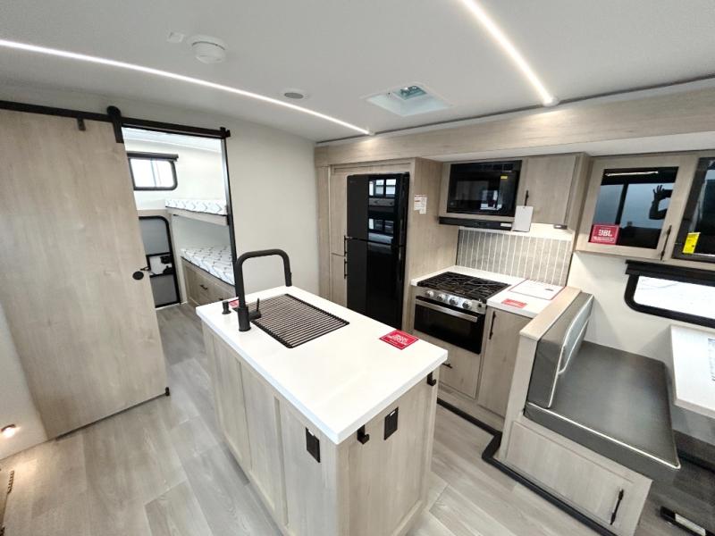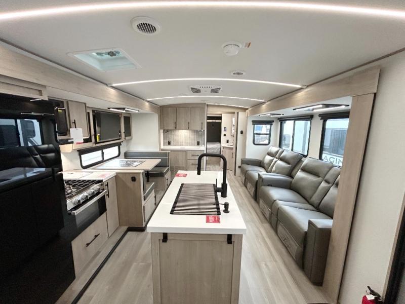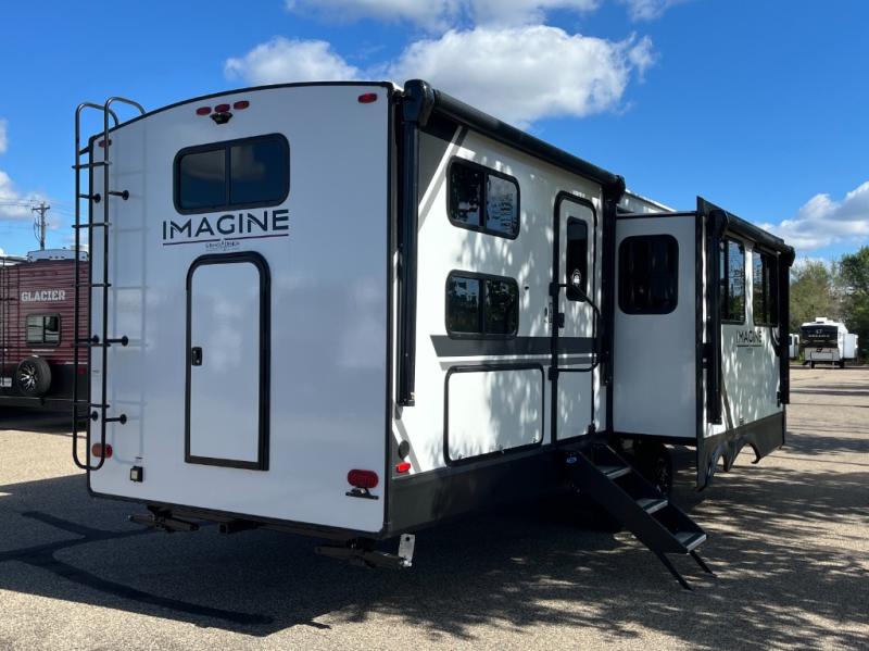 A great travel trailer for larger families or those that enjoy traveling with a few friends! This Imagine quad bunk model features two private bedrooms, with the master up front including a private entry/exit door just beyond a spacious walk-through bathroom that features a 30" x 36" shower with skylight to bring in more natural lighting each day, plus a toilet, sink and linen storage. In the kitchen, a nice island for food prep and cleaning up makes it easy to be part of the conversation in the room while you get meals ready for everyone. Speaking of food prep, how about the outside griddle and 1.6 cu. ft. refrigerator which is perfect for cooking outside, or for making late night snacks when all are enjoying the evening under the stars or in lawn chairs under one of two 9' 6" awnings with LED lighting. Your kids can bring along extra guests with the added sleeping that a quad bunk model provides!