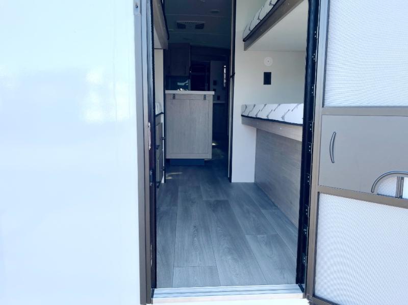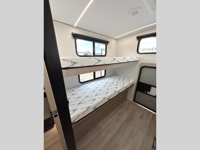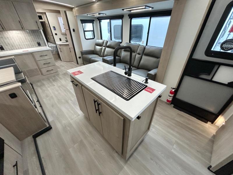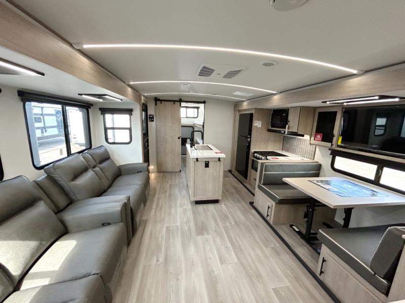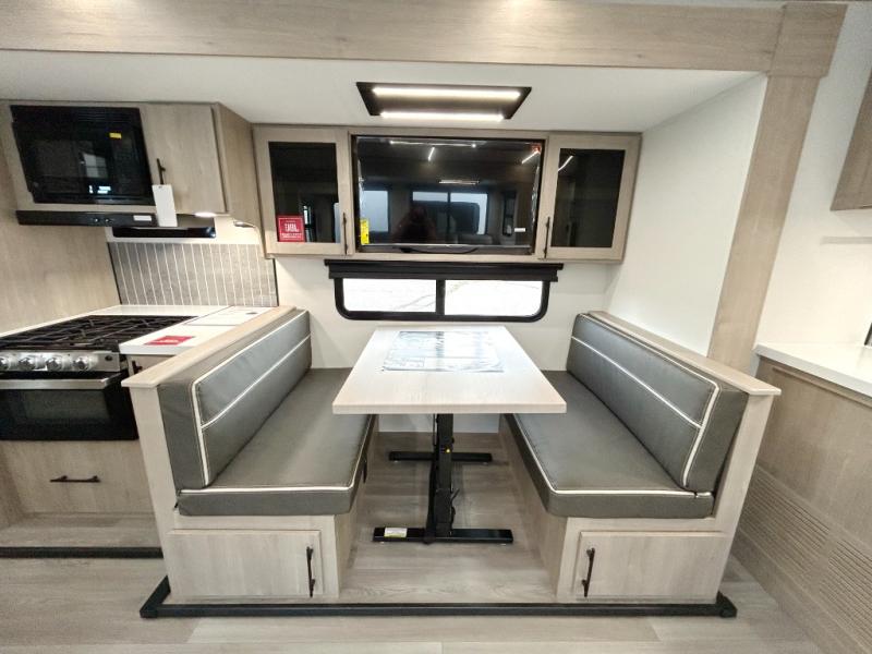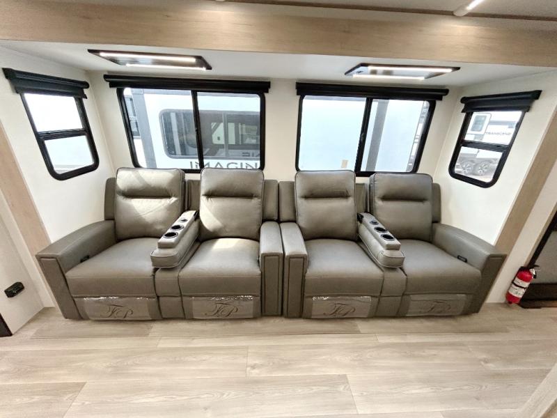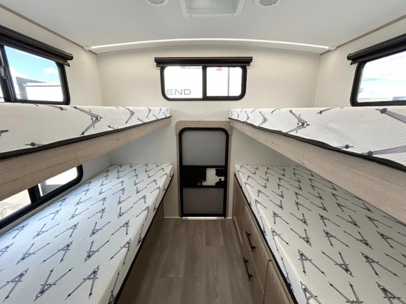 A great travel trailer for larger families or those that enjoy traveling with a few friends! This Imagine quad bunk model features two private bedrooms, with the master up front including a private entry/exit door just beyond a spacious walk-through bathroom that features a 30" x 36" shower with skylight to bring in more natural lighting each day, plus a toilet, sink and linen storage. In the kitchen, a nice island for food prep and cleaning up makes it easy to be part of the conversation in the room while you get meals ready for everyone. Speaking of food prep, how about the outside griddle and 1.6 cu. ft. refrigerator which is perfect for cooking outside, or for making late night snacks when all are enjoying the evening under the stars or in lawn chairs under one of two 9' 6" awnings with LED lighting. Your kids can bring along extra guests with the added sleeping that a quad bunk model provides!