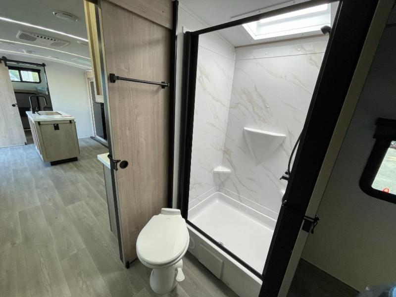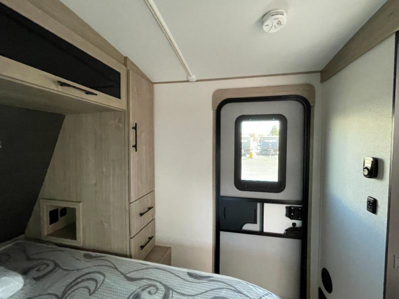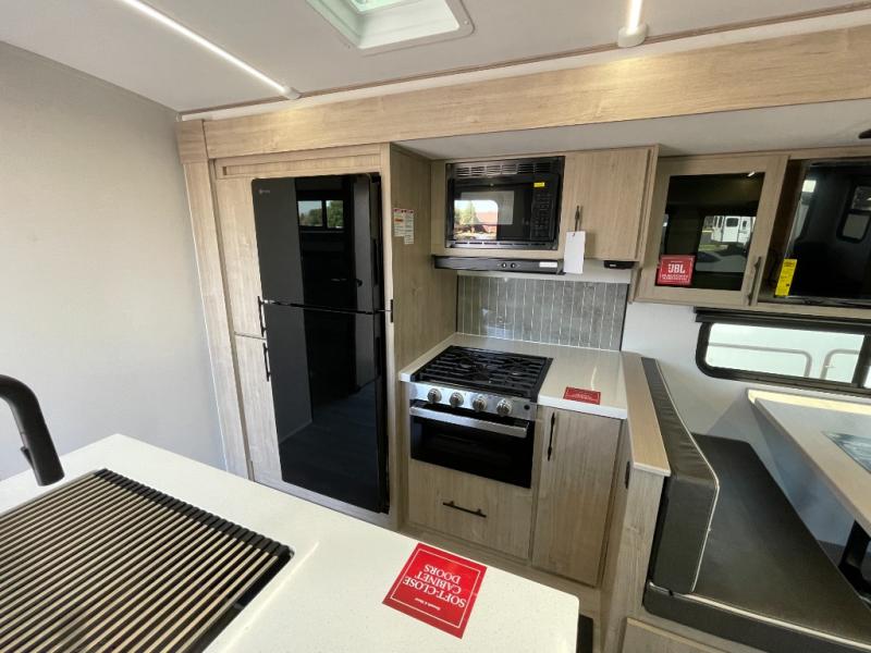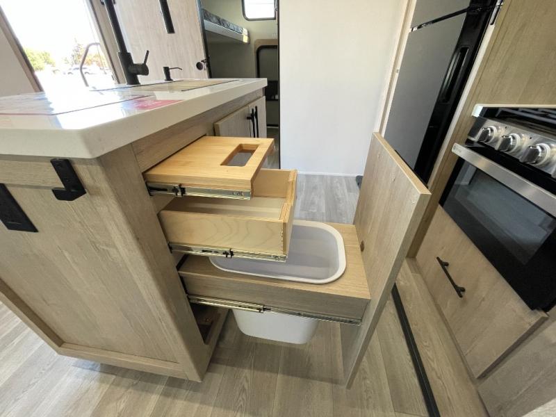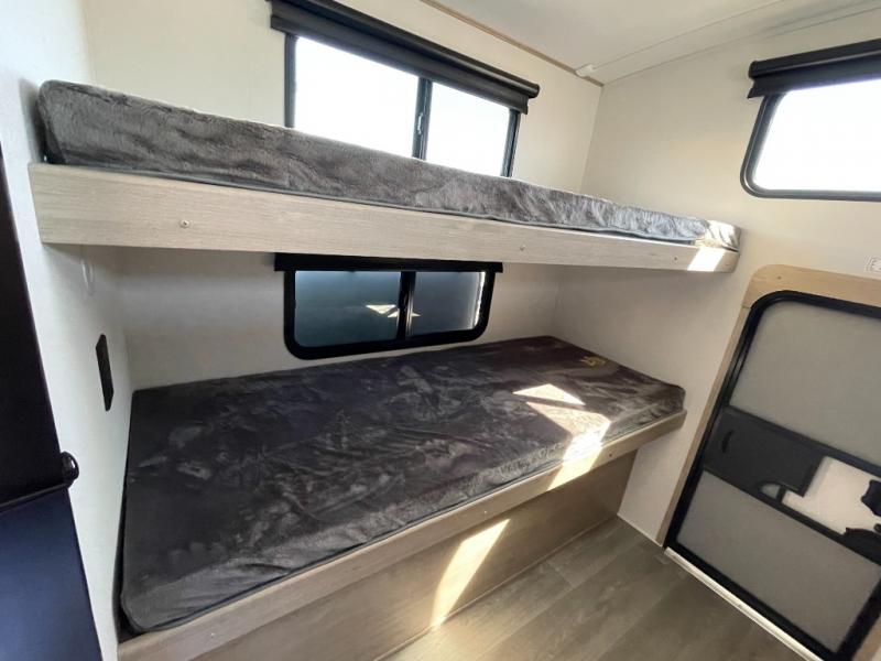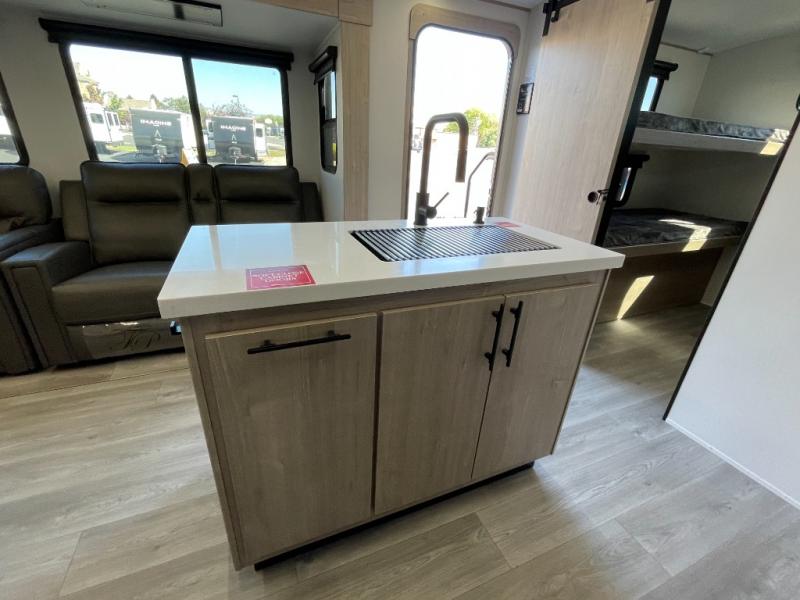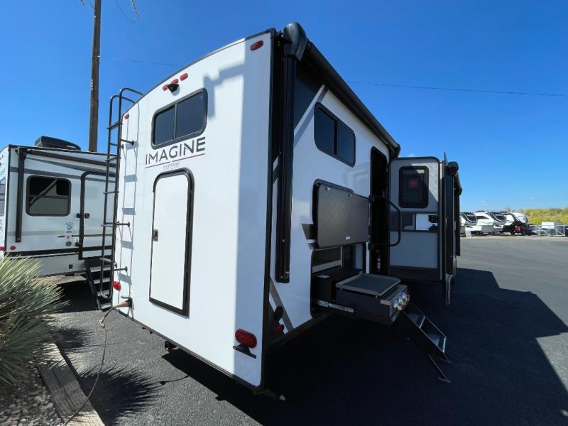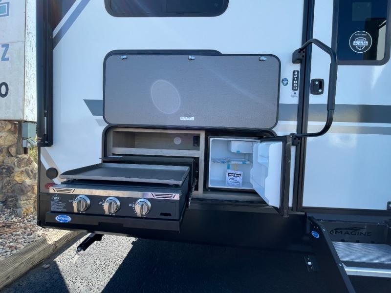 A great travel trailer for larger families or those that enjoy traveling with a few friends! This Imagine quad bunk model features two private bedrooms, with the master up front including a private entry/exit door just beyond a spacious walk-through bathroom that features a 30" x 36" shower with skylight to bring in more natural lighting each day, plus a toilet, sink and linen storage. In the kitchen, a nice island for food prep and cleaning up makes it easy to be part of the conversation in the room while you get meals ready for everyone. Speaking of food prep, how about the outside griddle and 1.6 cu. ft. refrigerator which is perfect for cooking outside, or for making late night snacks when all are enjoying the evening under the stars or in lawn chairs under one of two 9' 6" awnings with LED lighting. Your kids can bring along extra guests with the added sleeping that a quad bunk model provides!