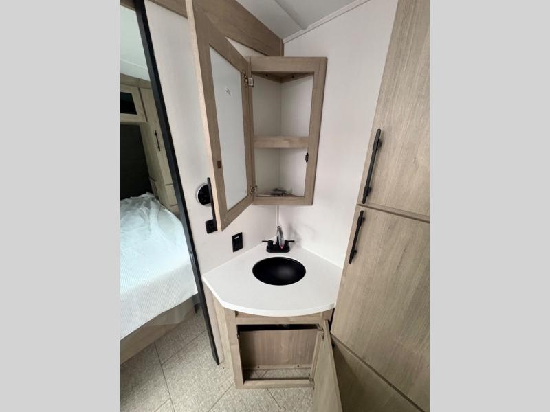 One of the highlights of the Imagine 3210BH is the fully equipped kitchen, built with real-world travel in mind. A three-burner range, oven, microwave, deep sink, and residential-style refrigerator give you everything needed to prepare breakfasts, dinners, and snacks with ease. Ample countertop space and smart storage cabinets keep utensils, cookware, and pantry items organized and accessible.