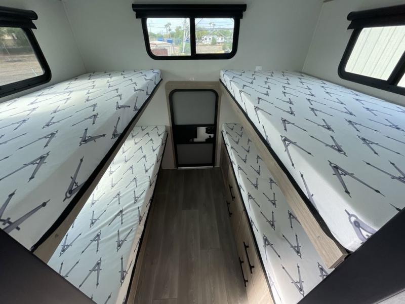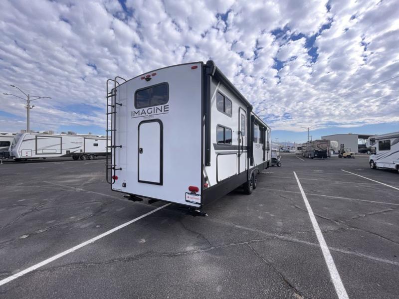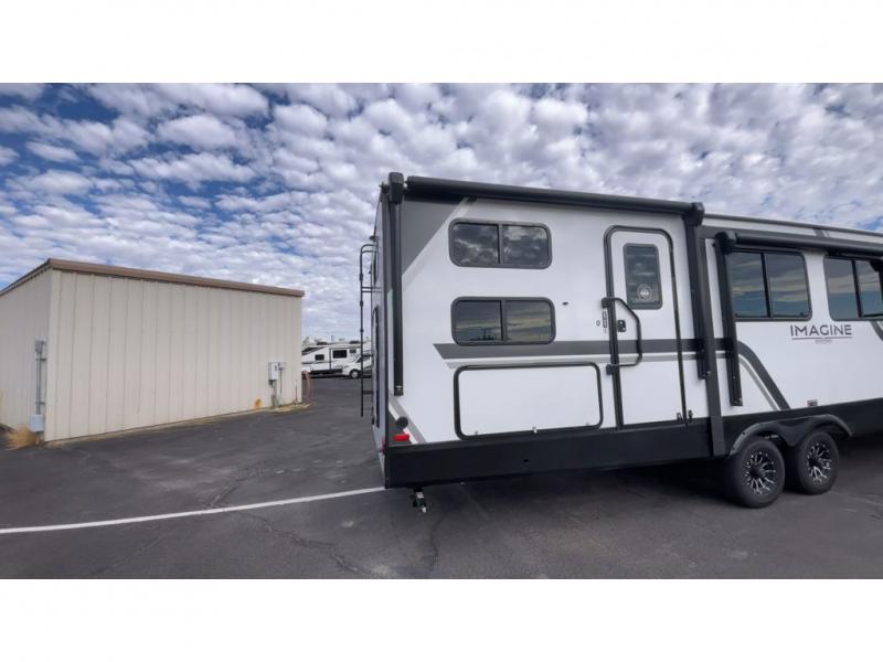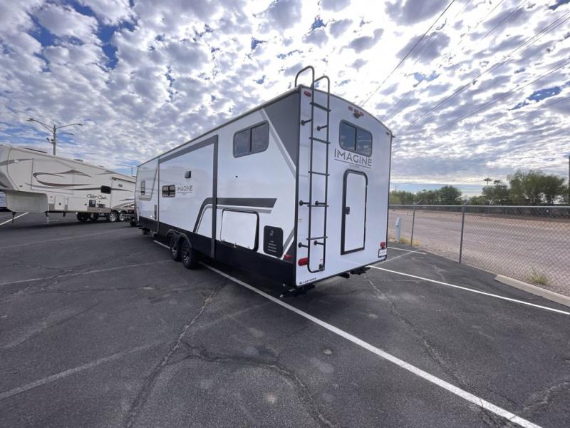 A great travel trailer for larger families or those that enjoy traveling with a few friends! This Imagine quad bunk model features two private bedrooms, with the master up front including a private entry/exit door just beyond a spacious walk-through bathroom that features a 30" x 36" walk-In shower with skylight to bring in more natural lighting each day, plus a toilet, sink and linen storage. In the kitchen, a nice island for food prep and cleaning up makes it easy to be part of the conversation in the room while you get meals ready for everyone. Speaking of food prep, how about the outside griddle and 1.6 cu. ft. refrigerator which is perfect for cooking outside, or for making late night snacks when all are enjoying the evening under the stars or in lawn chairs under one of two 9' 6" awnings with LED lighting. Your kids can bring along extra guests with the added space that a quad bunk model provides!