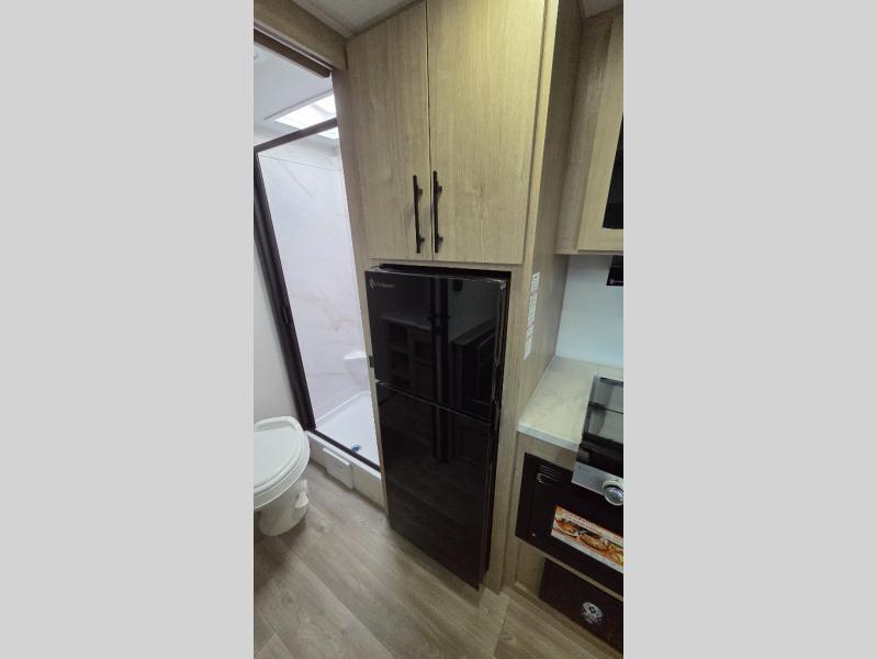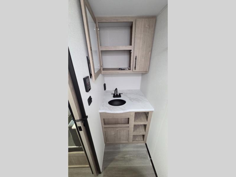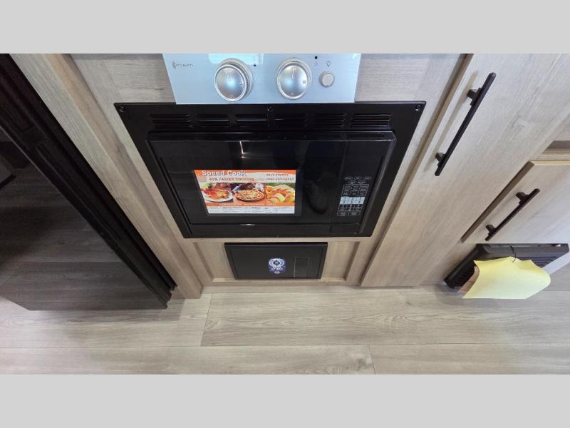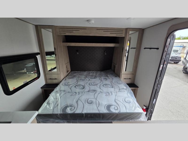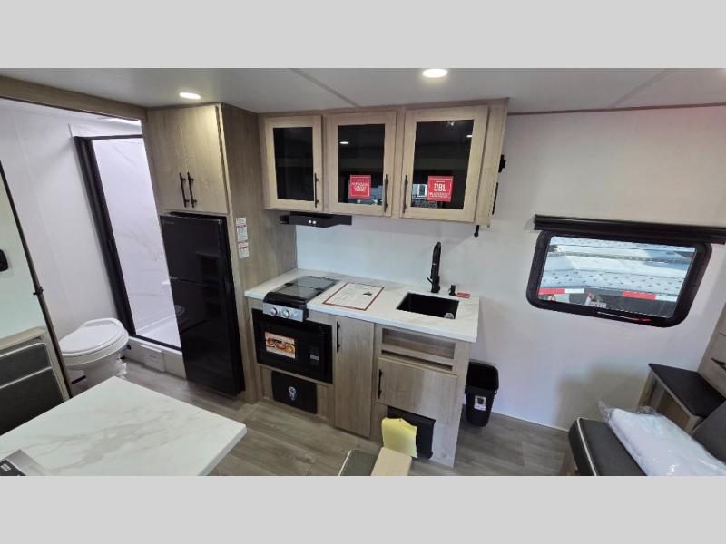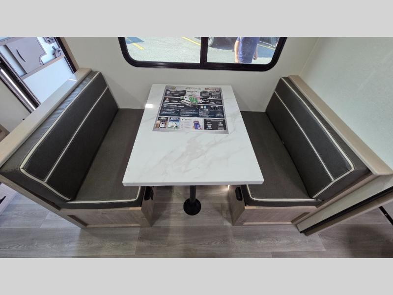Start looking for your favorite campground to take this travel trailer to! After a fun day at the beach, you can rinse the sand out of your hair with the walk-in shower with a skylight in the full rear bathroom. Depending on what time you enter the unit will determine whether you see the Murphy bed or sofa with drawers underneath and wardrobes on either side of it. The booth dinette is not only great for enjoying meals prepared with the two burner cooktop or outside griddle, but also for transforming into an extra sleeping space!