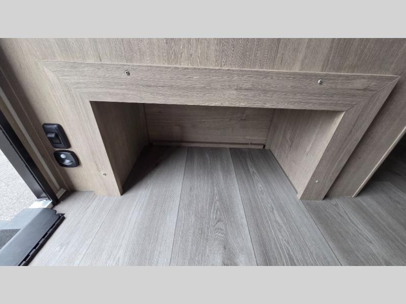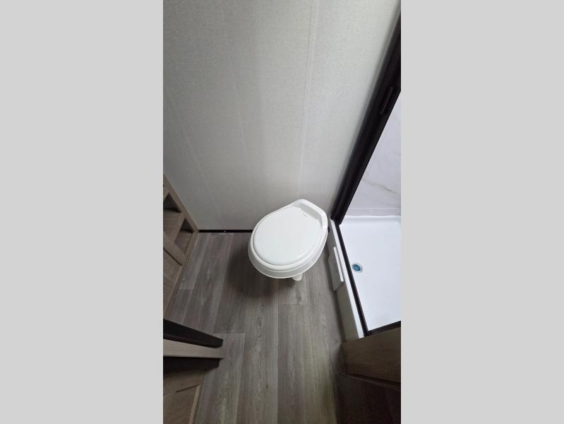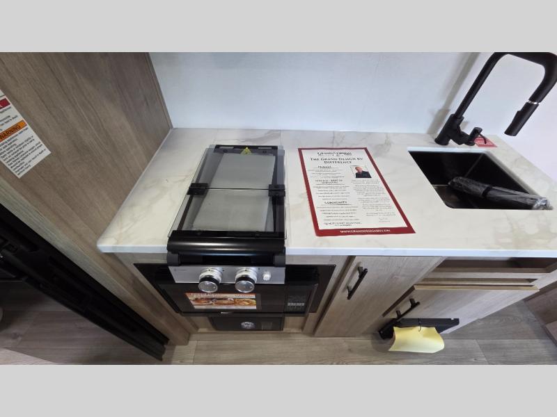 Start looking for your favorite campground to take this travel trailer to! After a fun day at the beach, you can rinse the sand out of your hair with the walk-in shower with a skylight in the full rear bathroom. Depending on what time you enter the unit will determine whether you see the Murphy bed or sofa with drawers underneath and wardrobes on either side of it. The booth dinette is not only great for enjoying meals prepared with the two burner cooktop or outside griddle, but also for transforming into an extra sleeping space!