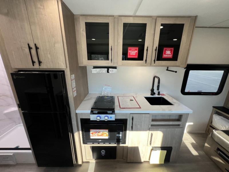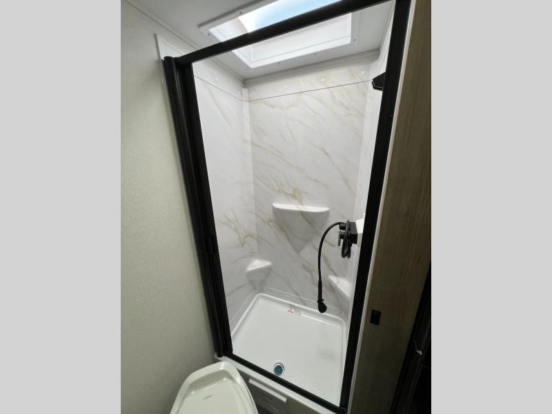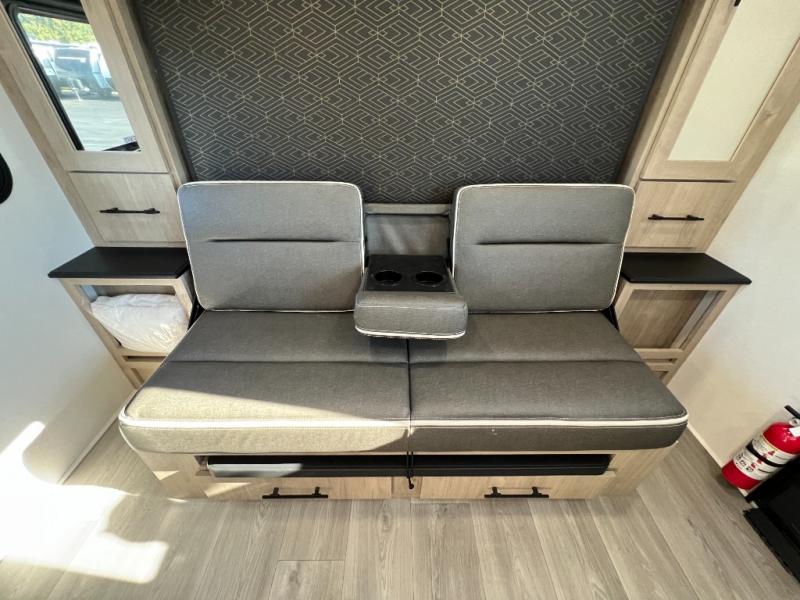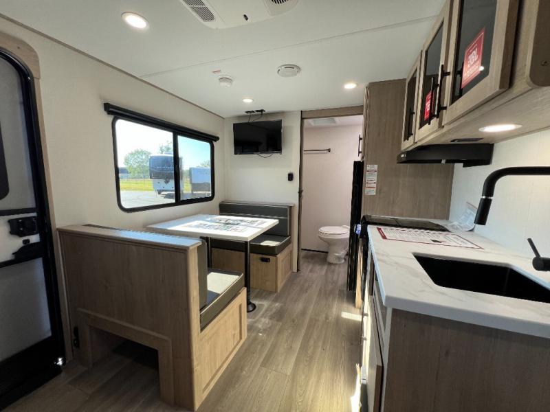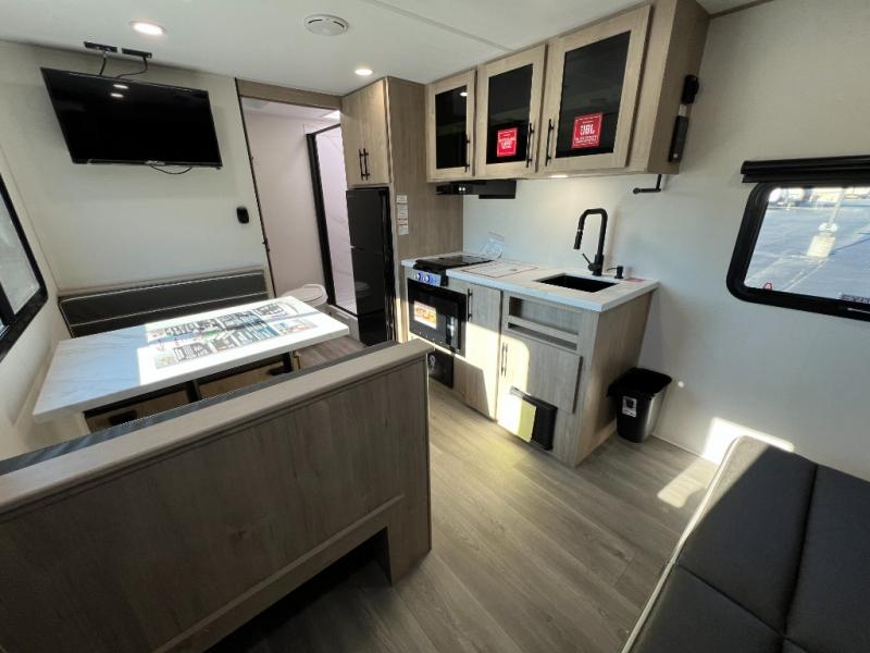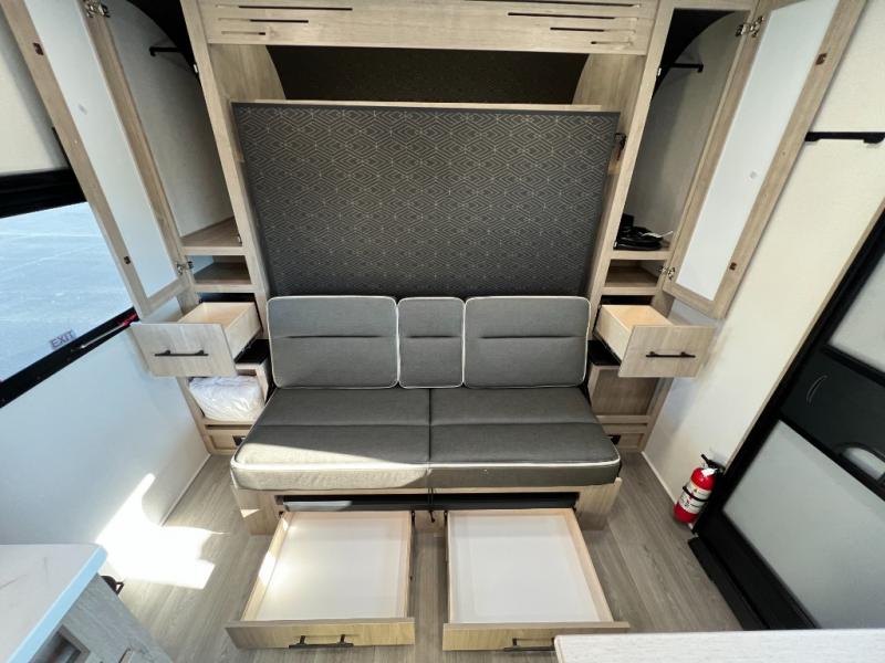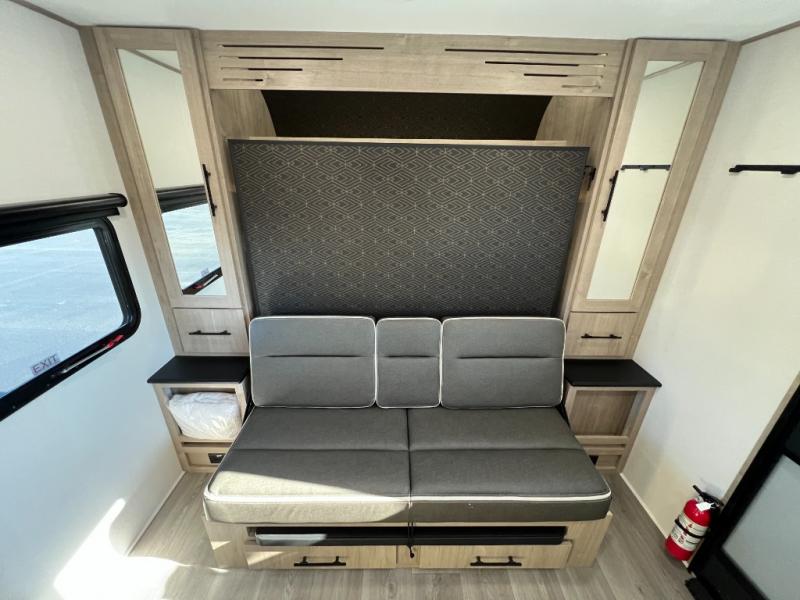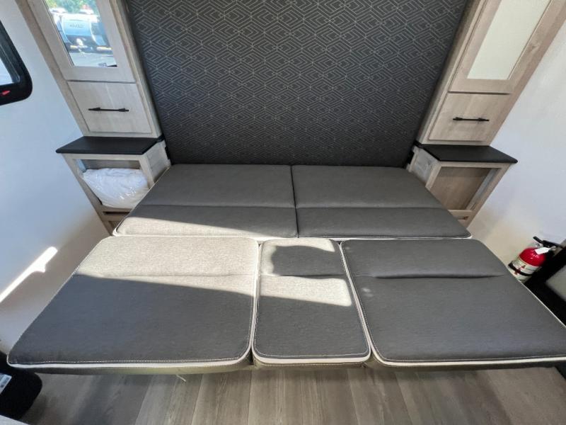 Start looking for your favorite campground to take this travel trailer to! After a fun day at the beach, you can rinse the sand out of your hair with the walk-in shower with a skylight in the full rear bathroom. Depending on what time you enter the unit will determine whether you see the Murphy bed or sofa with drawers underneath and wardrobes on either side of it. The booth dinette is not only great for enjoying meals prepared with the two burner cooktop or outside griddle, but also for transforming into an extra sleeping space!