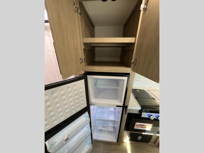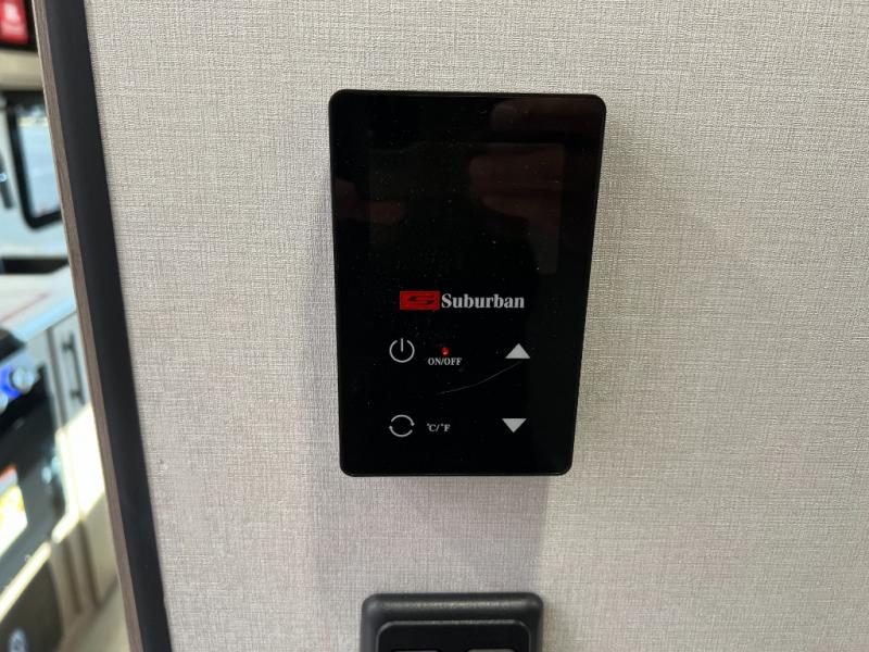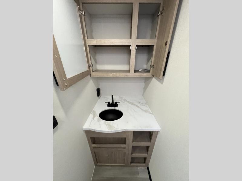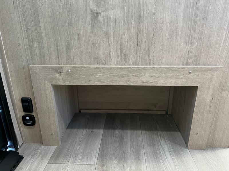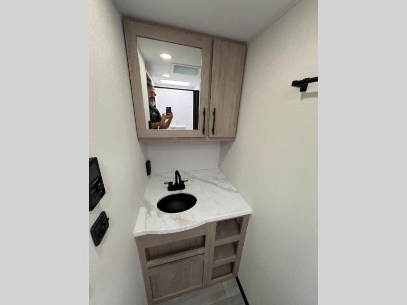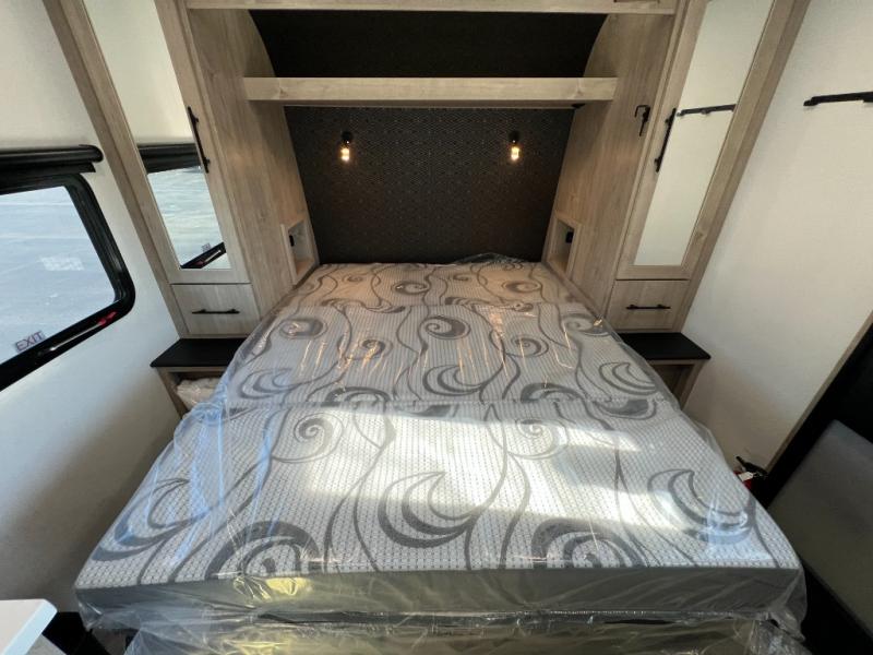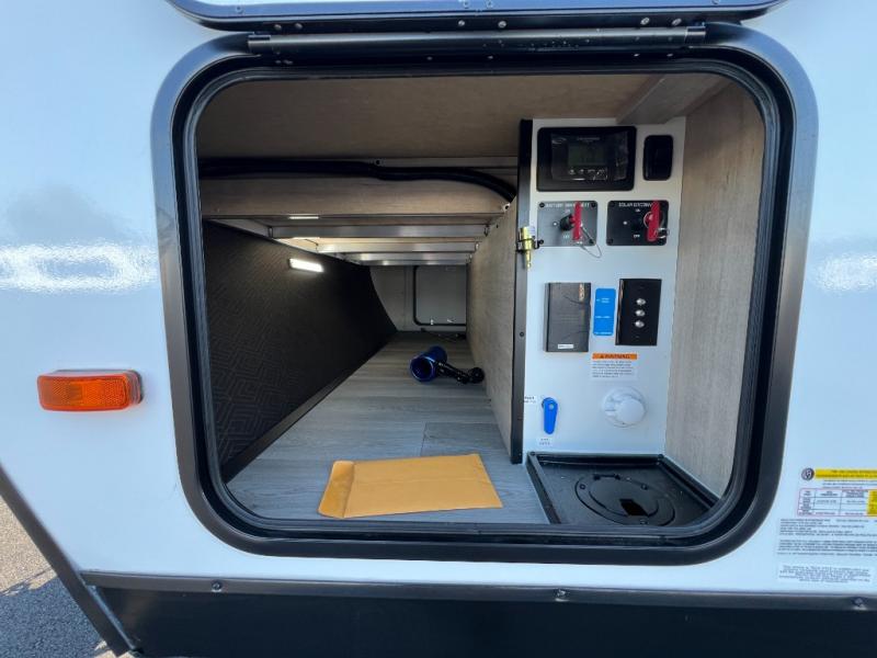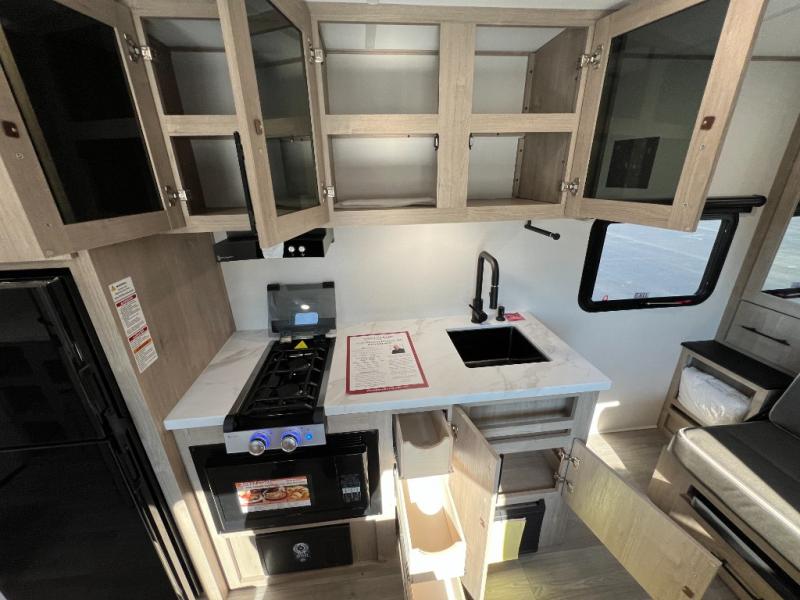 Start looking for your favorite campground to take this travel trailer to! After a fun day at the beach, you can rinse the sand out of your hair with the walk-in shower with a skylight in the full rear bathroom. Depending on what time you enter the unit will determine whether you see the Murphy bed or sofa with drawers underneath and wardrobes on either side of it. The booth dinette is not only great for enjoying meals prepared with the two burner cooktop or outside griddle, but also for transforming into an extra sleeping space!