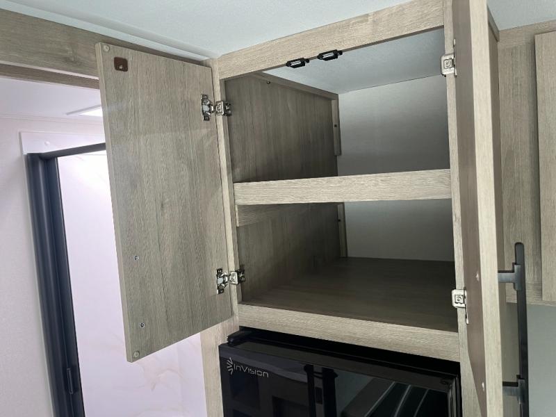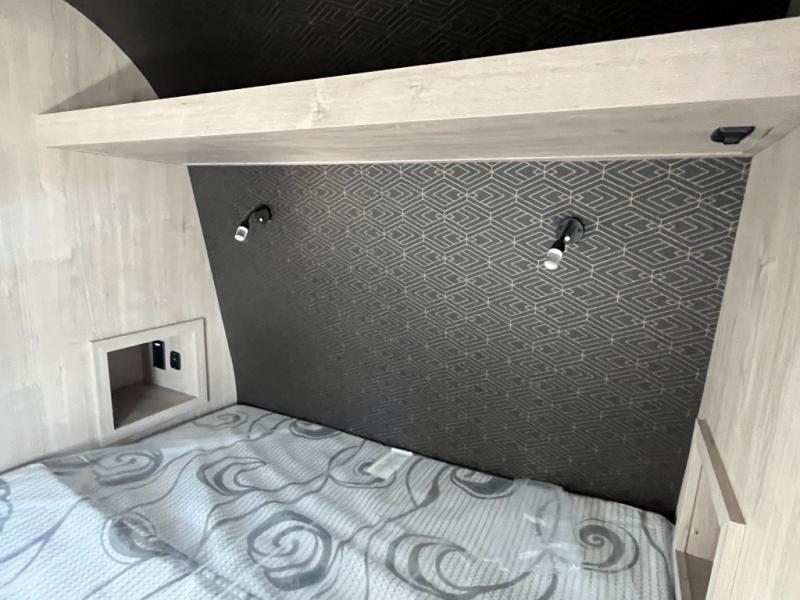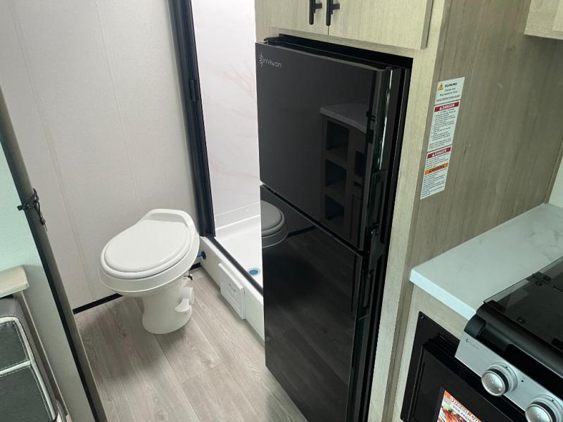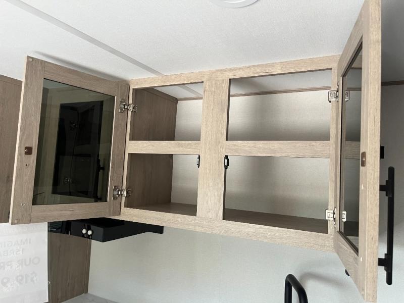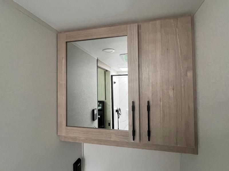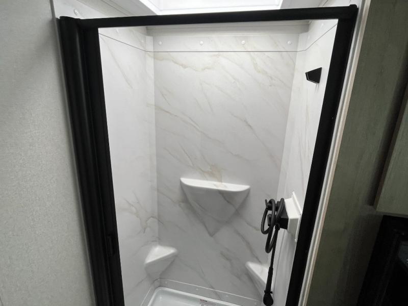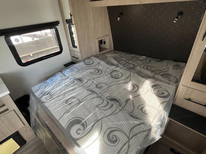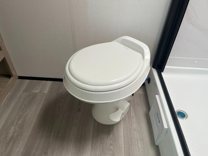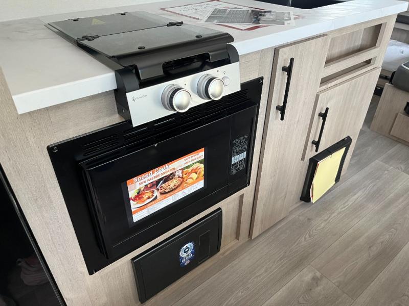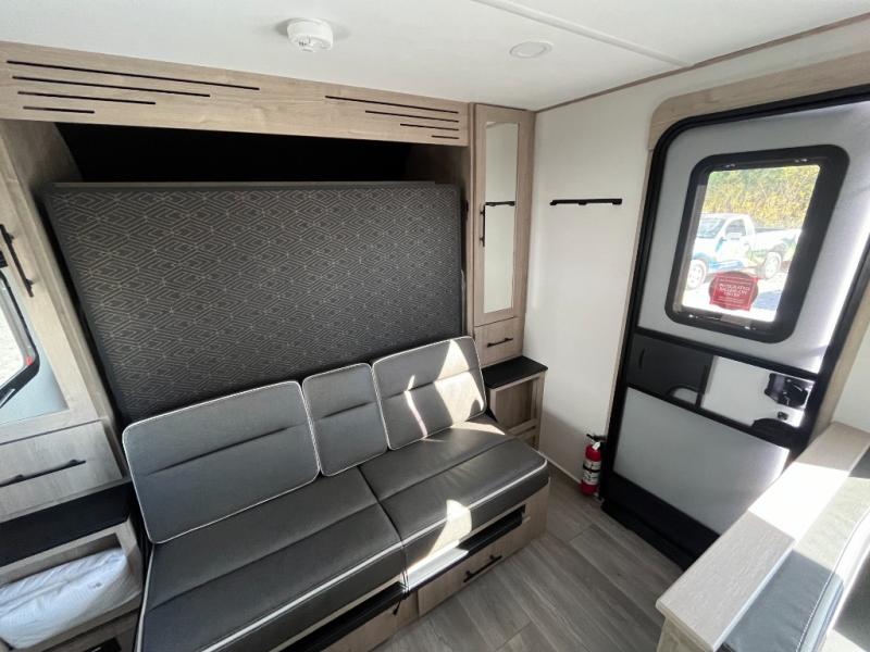 Start looking for your favorite campground to take this travel trailer to! After a fun day at the beach, you can rinse the sand out of your hair with the walk-in shower with a skylight in the full rear bathroom. Depending on what time you enter the unit will determine whether you see the Murphy bed or sofa with drawers underneath and wardrobes on either side of it. The booth dinette is not only great for enjoying meals prepared with the two burner cooktop or outside griddle, but also for transforming into an extra sleeping space!