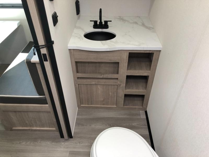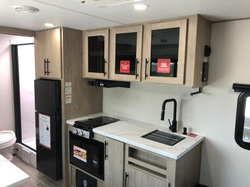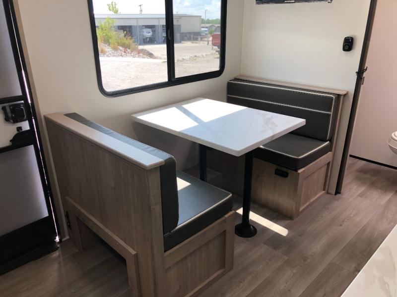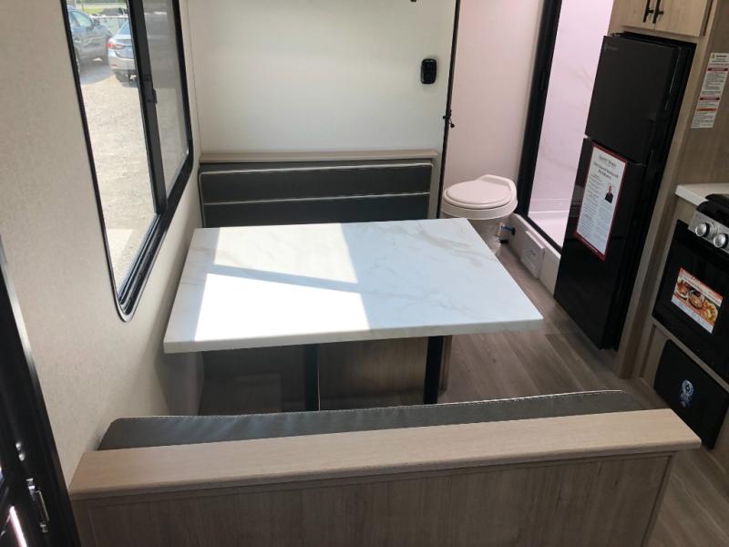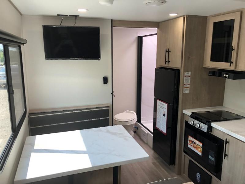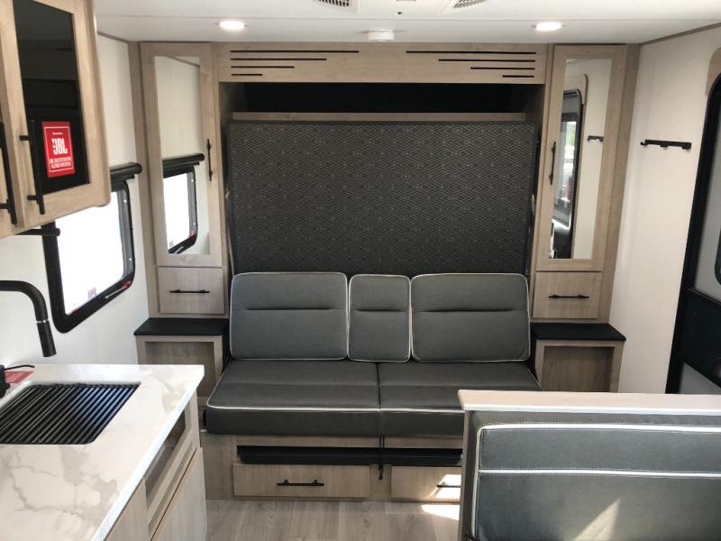 Start looking for your favorite campground to take this travel trailer to! After a fun day at the beach, you can rinse the sand out of your hair with the walk-in shower with a skylight in the full rear bathroom. Depending on what time you enter the unit will determine whether you see the Murphy bed or sofa with drawers underneath and wardrobes on either side of it. The booth dinette is not only great for enjoying meals prepared with the two burner cooktop or outside griddle, but also for transforming into an extra sleeping space!