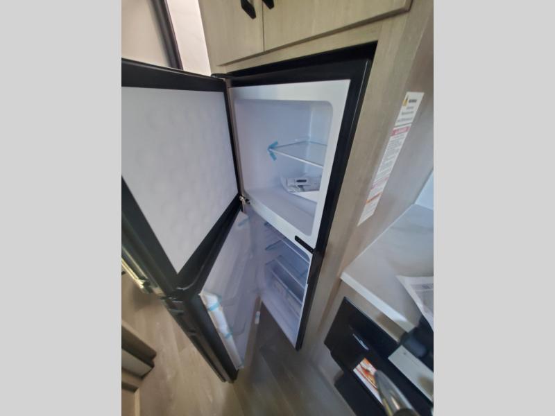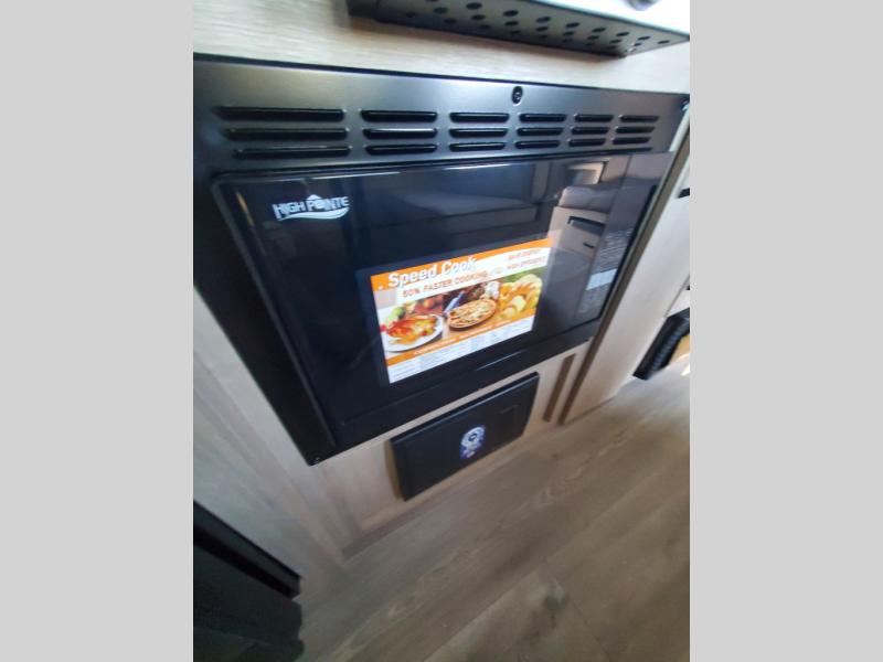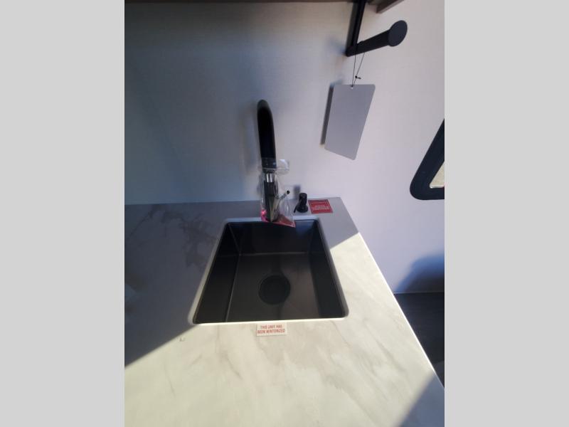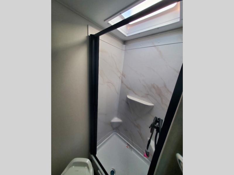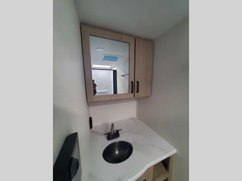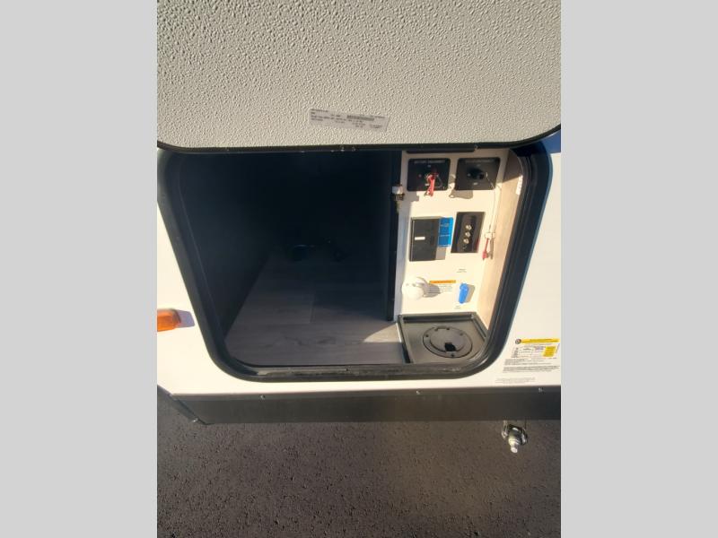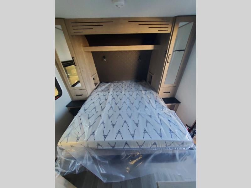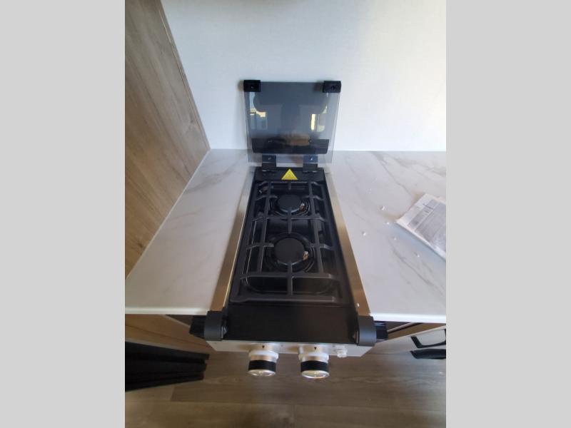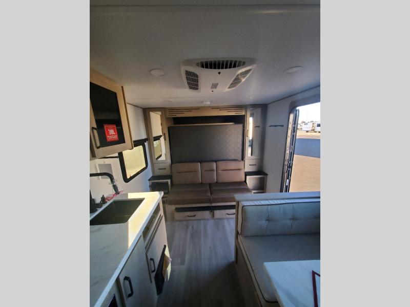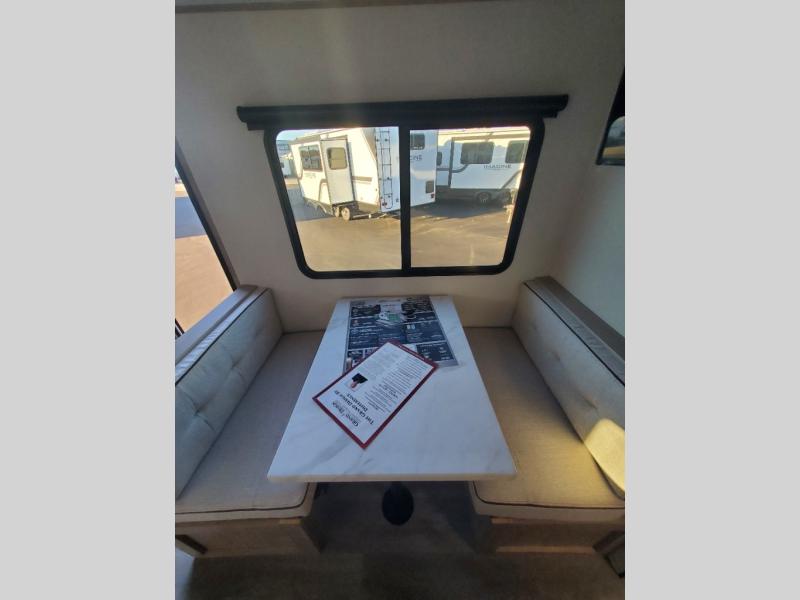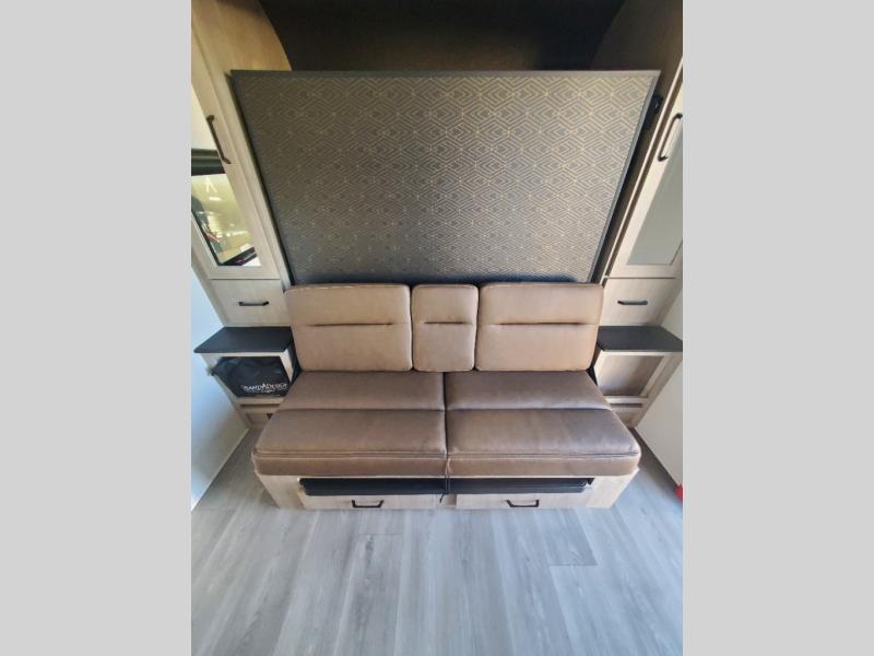 Start looking for your favorite campground to take this travel trailer to! After a fun day at the beach, you can rinse the sand out of your hair with the walk-in shower with a skylight in the full rear bathroom. Depending on what time you enter the unit will determine whether you see the Murphy bed or sofa with drawers underneath and wardrobes on either side of it. The booth dinette is not only great for enjoying meals prepared with the two burner cooktop or outside griddle, but also for transforming into an extra sleeping space!