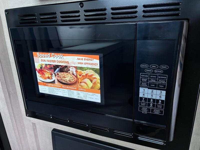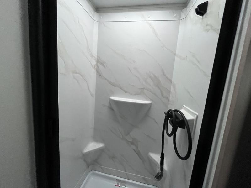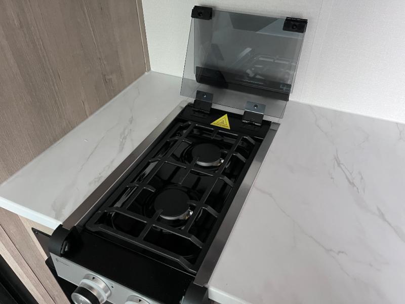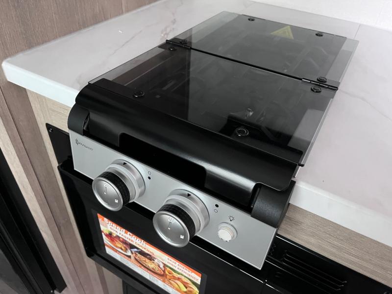 Start looking for your favorite campground to take this travel trailer to! After a fun day at the beach, you can rinse the sand out of your hair with the walk-in shower with a skylight in the full rear bathroom. Depending on what time you enter the unit will determine whether you see the Murphy bed or sofa with shoe storage underneath and wardrobes on either side of it. The booth dinette is not only great for enjoying meals prepared with the two-burner cooktop, but also for transforming into an extra sleeping space!