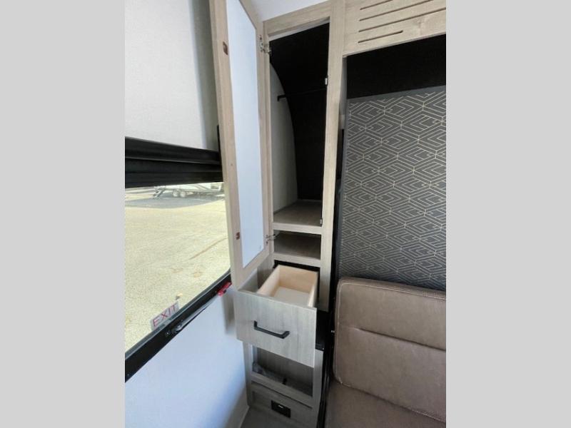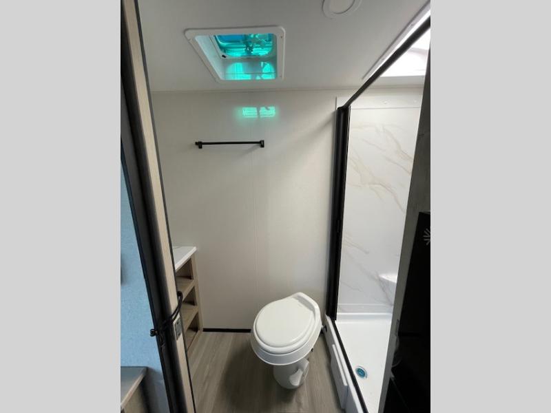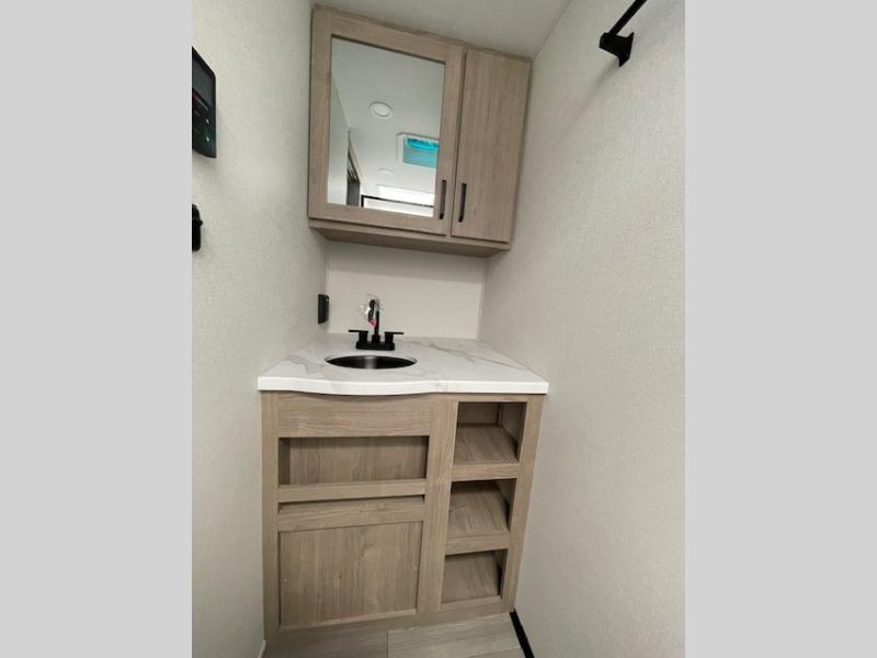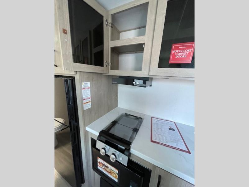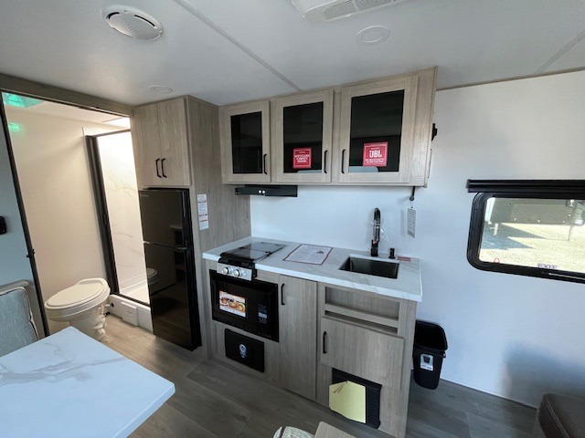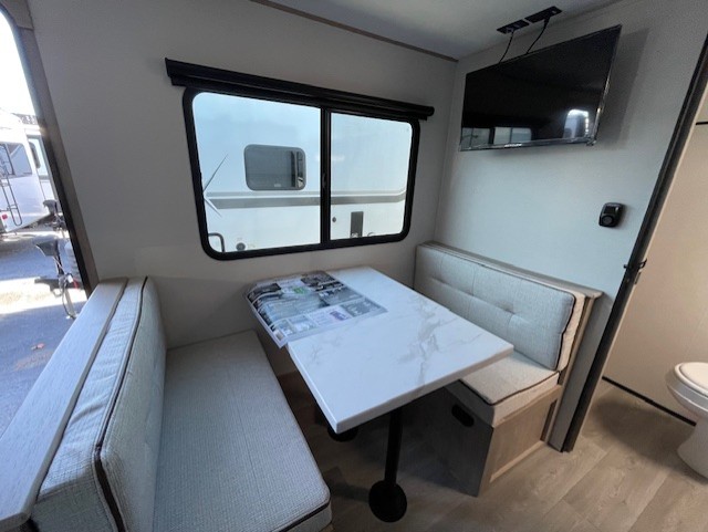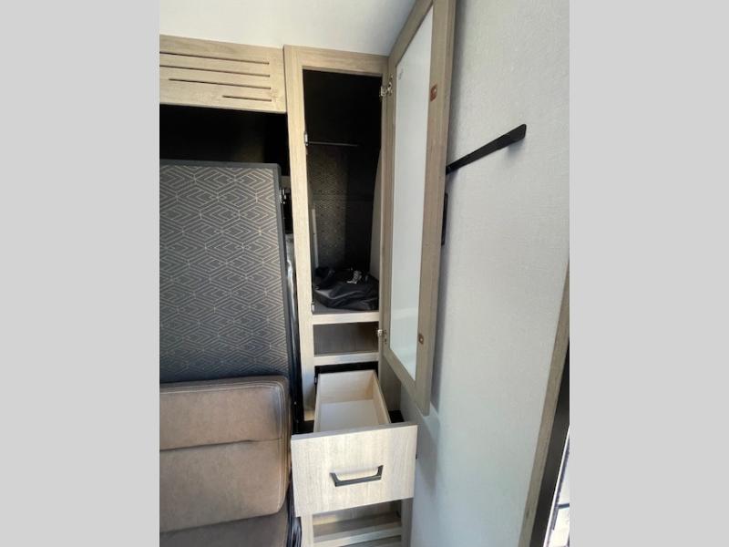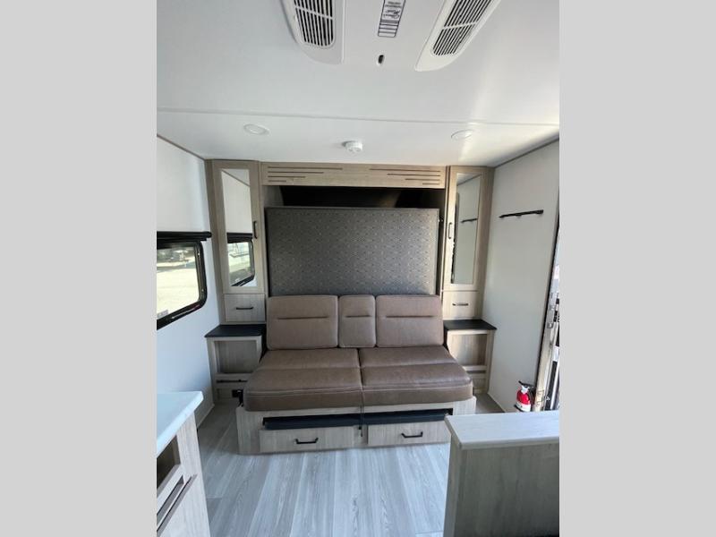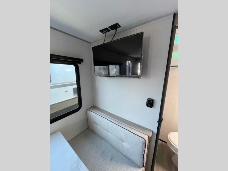 Start looking for your favorite campground to take this travel trailer to! After a fun day at the beach, you can rinse the sand out of your hair with the walk-in shower with a skylight in the full rear bathroom. Depending on what time you enter the unit will determine whether you see the Murphy bed or sofa with shoe storage underneath and wardrobes on either side of it. The booth dinette is not only great for enjoying meals prepared with the two-burner cooktop, but also for transforming into an extra sleeping space!