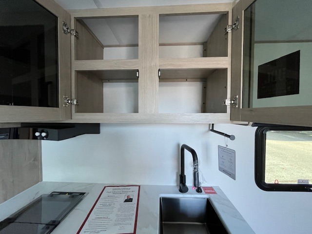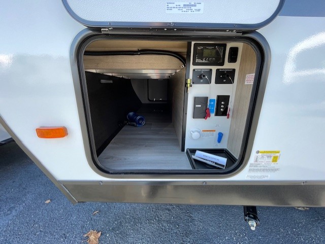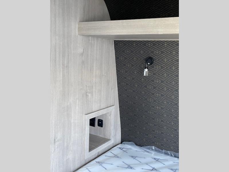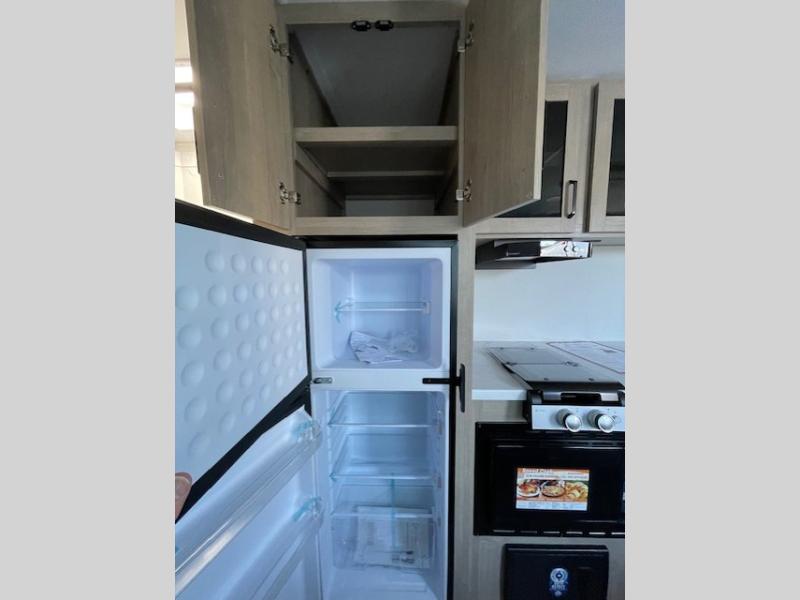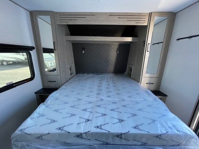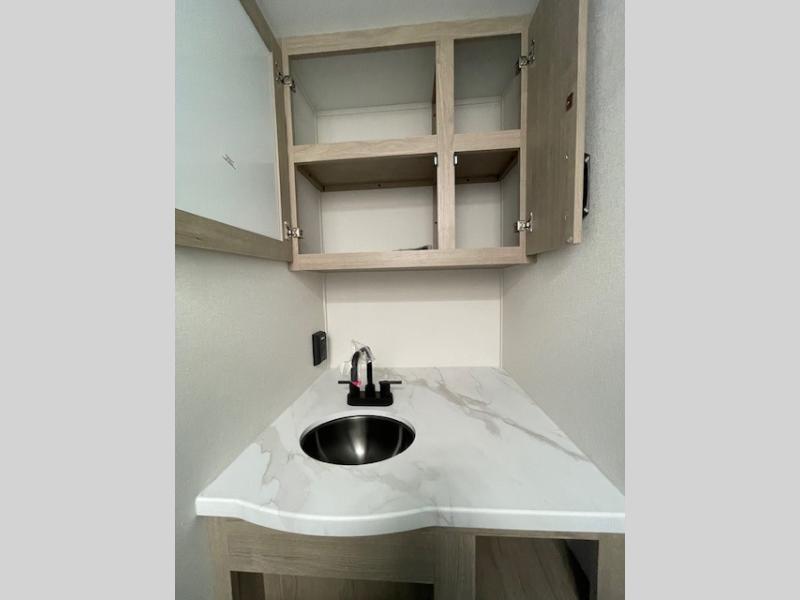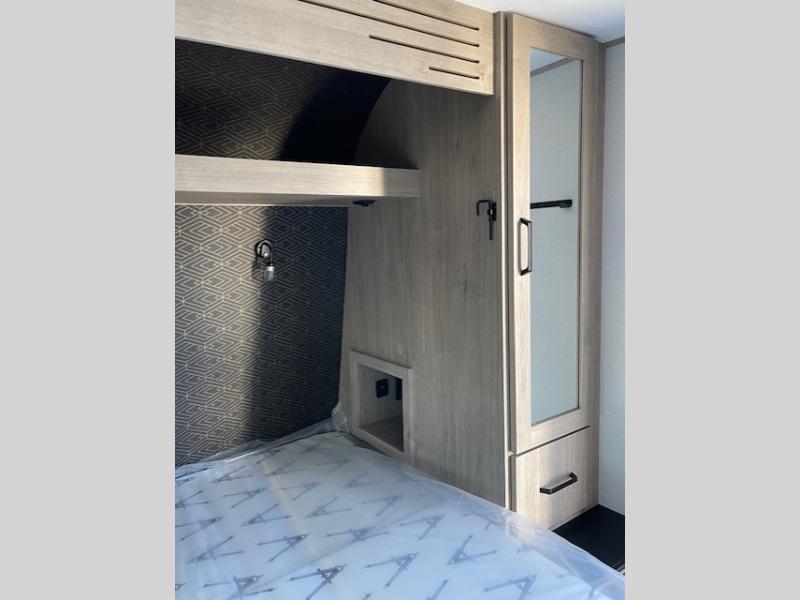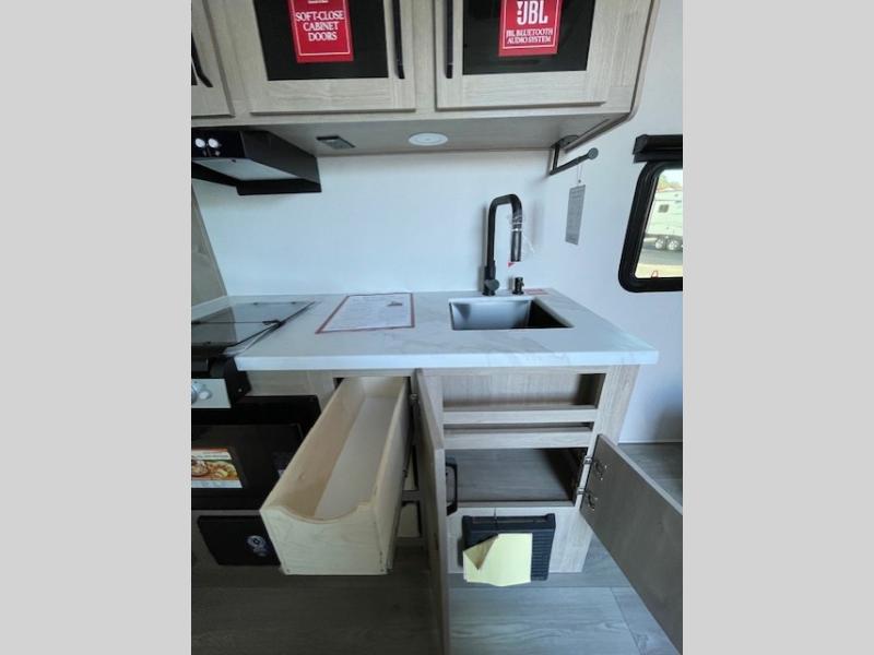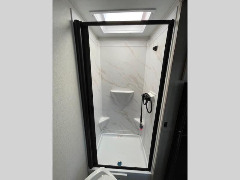 Start looking for your favorite campground to take this travel trailer to! After a fun day at the beach, you can rinse the sand out of your hair with the walk-in shower with a skylight in the full rear bathroom. Depending on what time you enter the unit will determine whether you see the Murphy bed or sofa with shoe storage underneath and wardrobes on either side of it. The booth dinette is not only great for enjoying meals prepared with the two-burner cooktop, but also for transforming into an extra sleeping space!