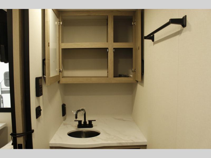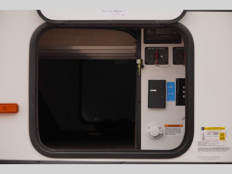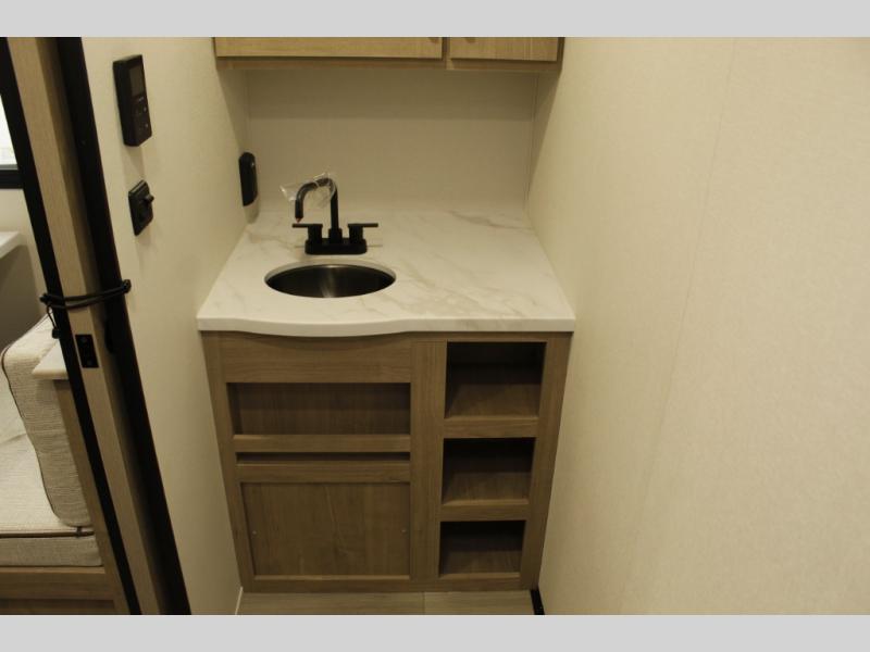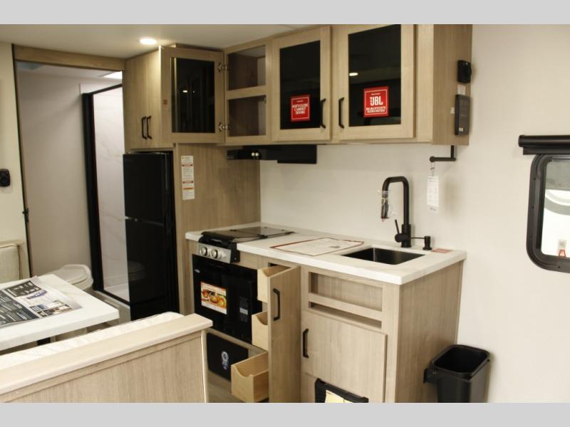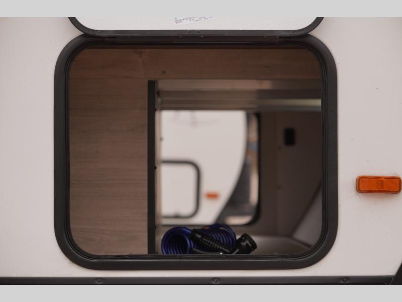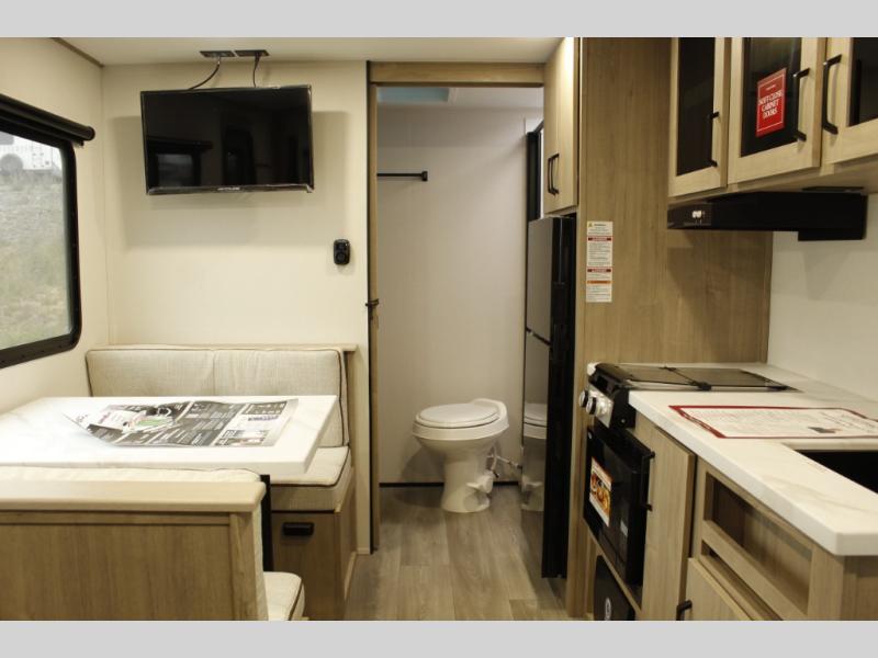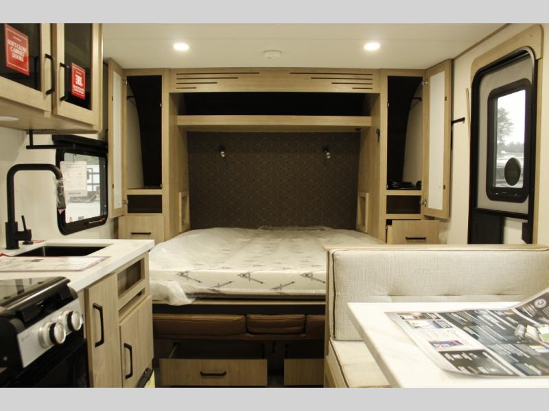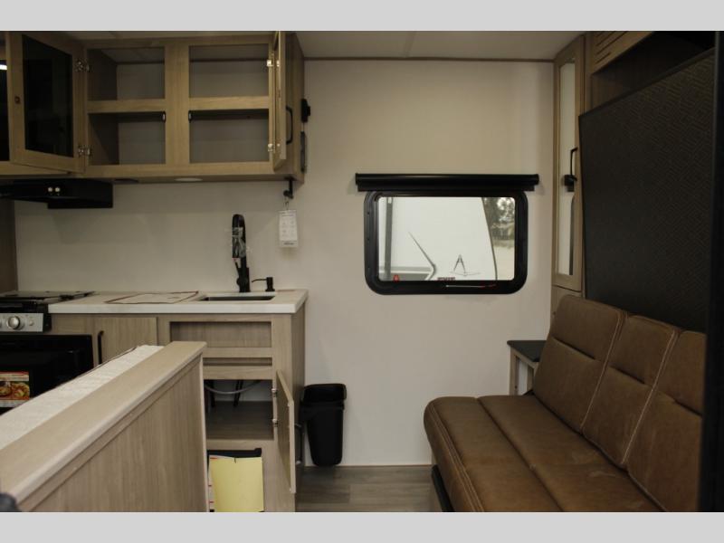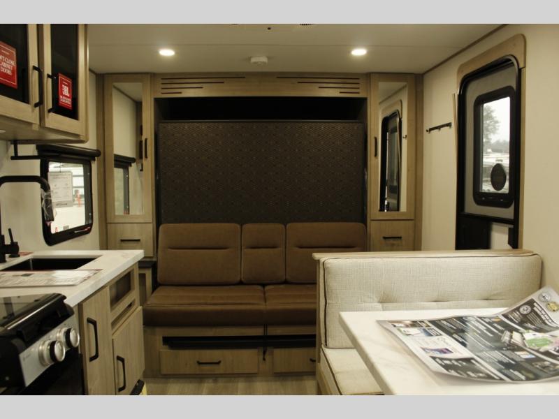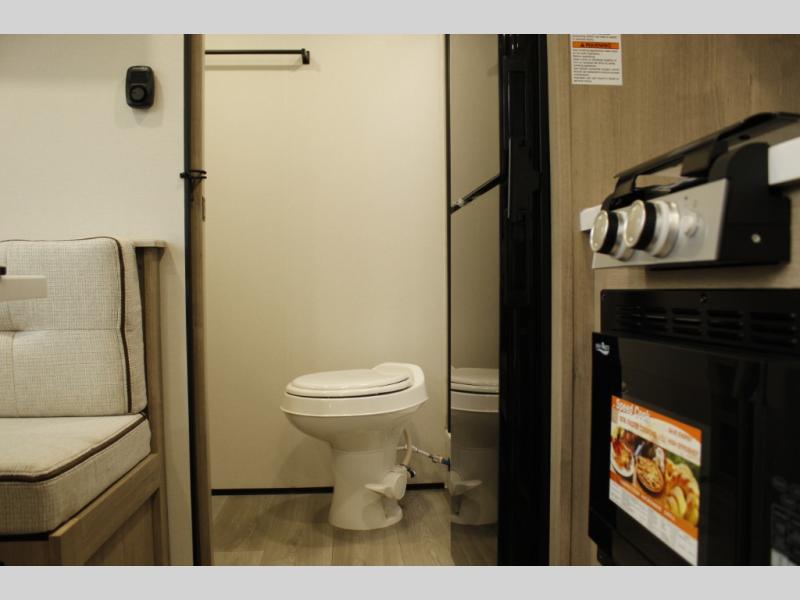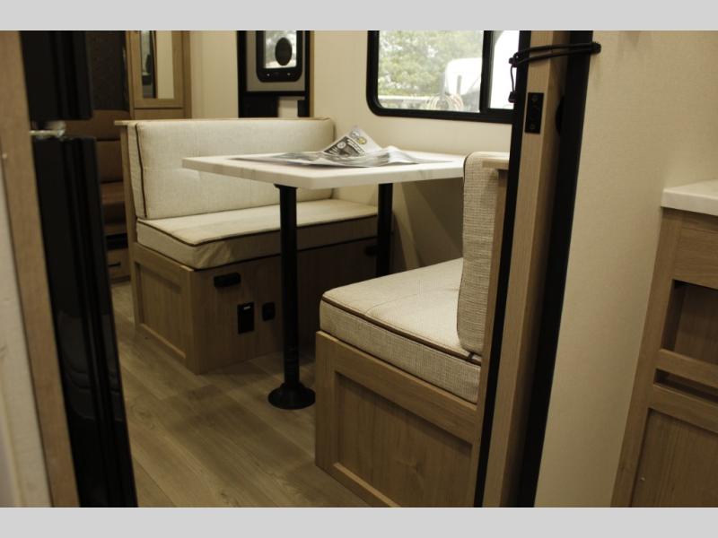 Start looking for your favorite campground to take this travel trailer to! After a fun day at the beach, you can rinse the sand out of your hair with the walk-in shower with a skylight in the full rear bathroom. Depending on what time you enter the unit will determine whether you see the Murphy bed or sofa with shoe storage underneath and wardrobes on either side of it. The booth dinette is not only great for enjoying meals prepared with the two-burner cooktop, but also for transforming into an extra sleeping space!