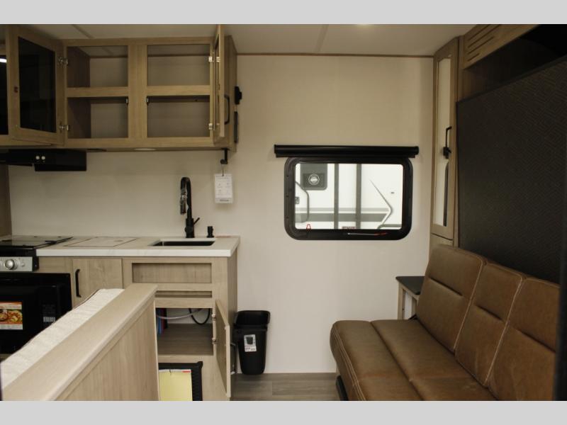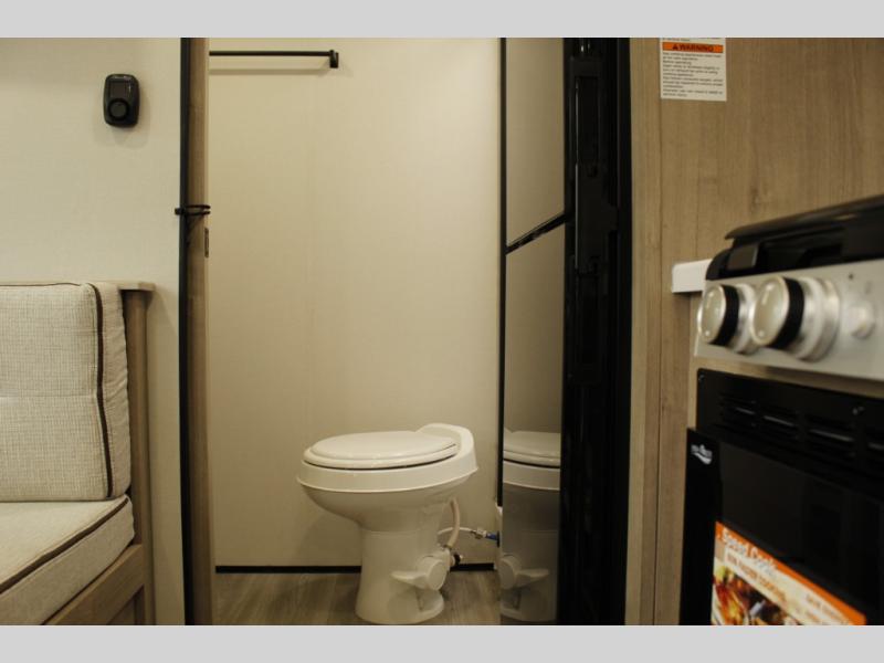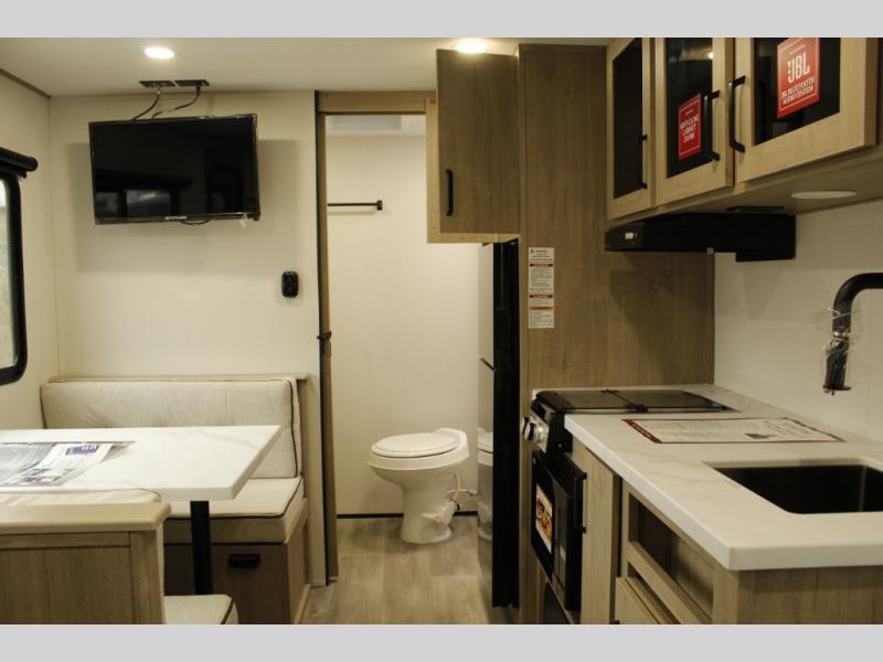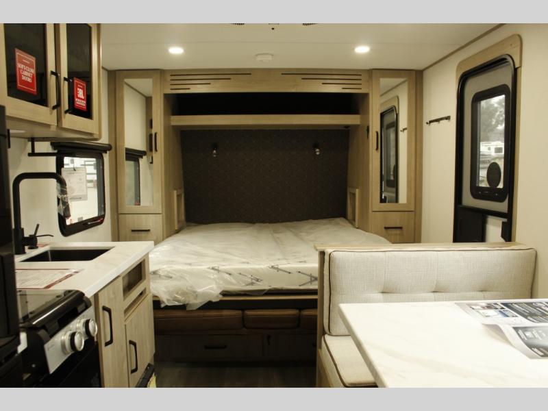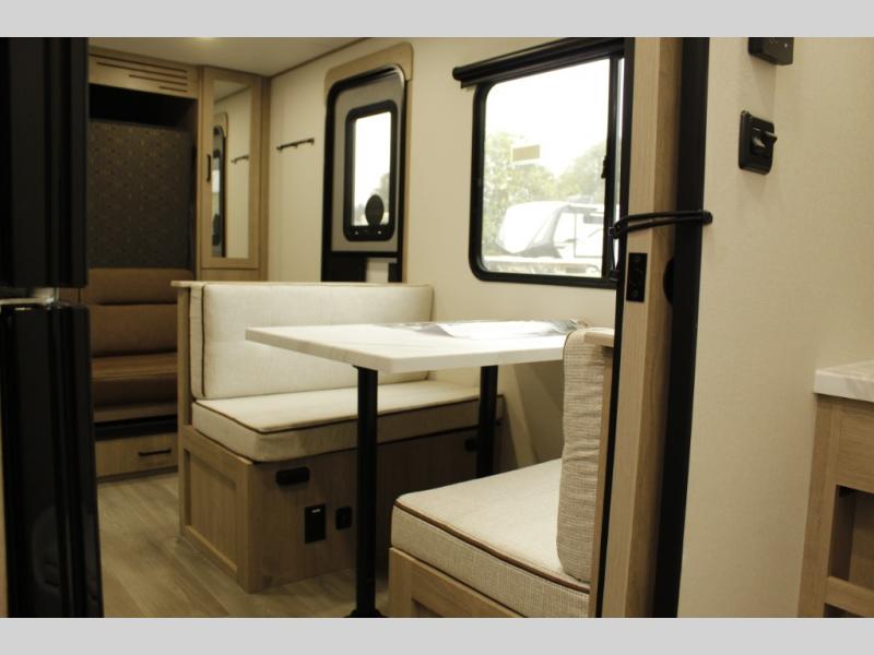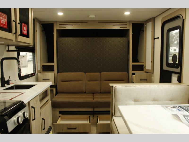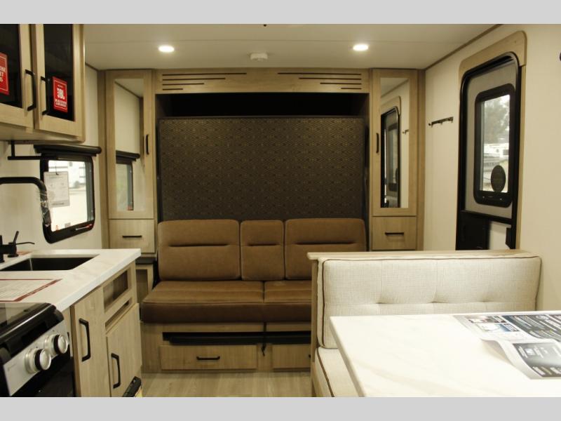 Start looking for your favorite campground to take this travel trailer to! After a fun day at the beach, you can rinse the sand out of your hair with the walk-in shower with a skylight in the full rear bathroom. Depending on what time you enter the unit will determine whether you see the Murphy bed or sofa with shoe storage underneath and wardrobes on either side of it. The booth dinette is not only great for enjoying meals prepared with the two-burner cooktop, but also for transforming into an extra sleeping space!