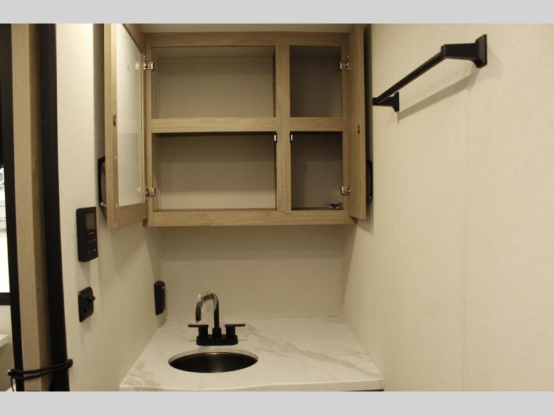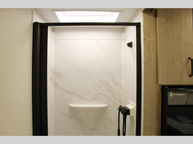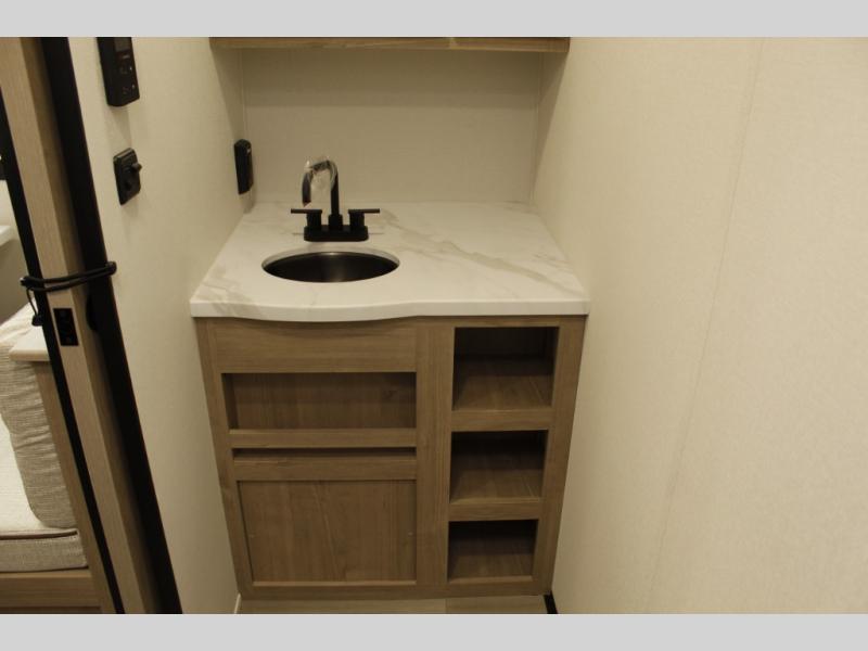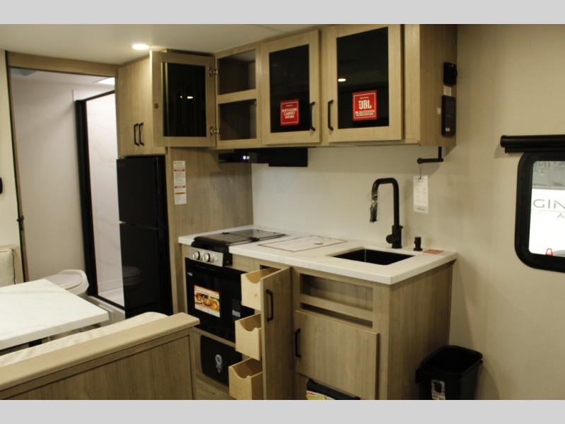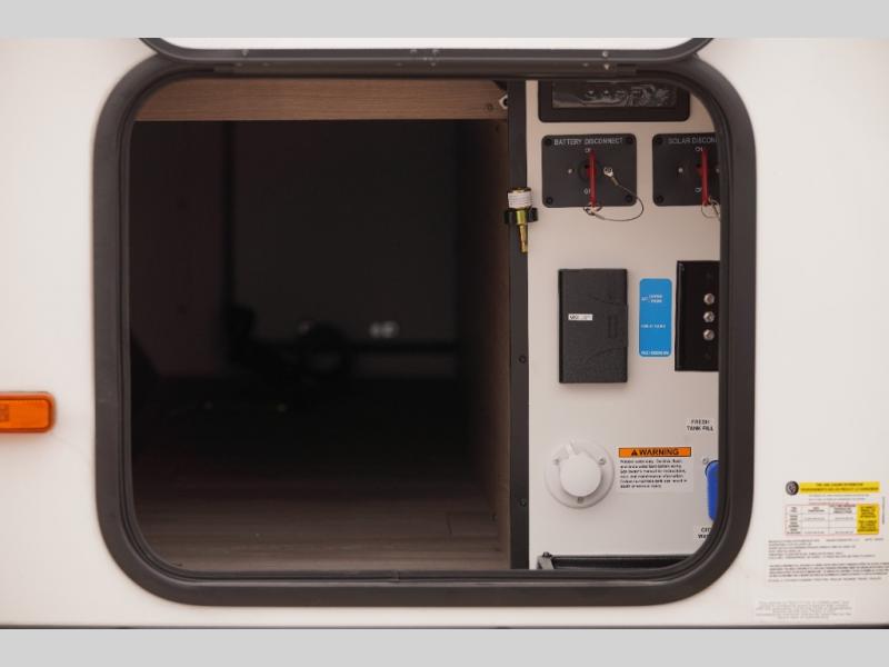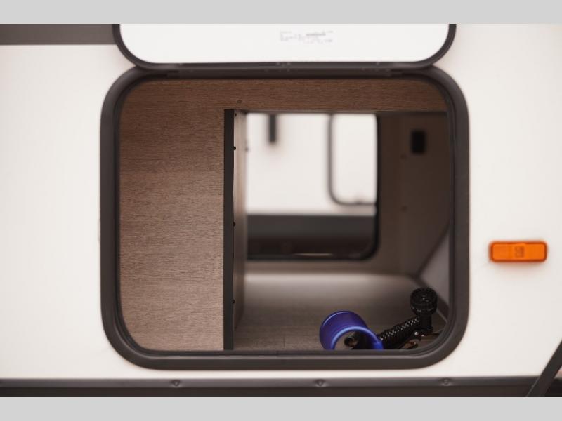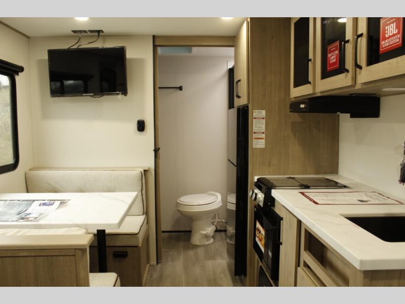 Start looking for your favorite campground to take this travel trailer to! After a fun day at the beach, you can rinse the sand out of your hair with the walk-in shower with a skylight in the full rear bathroom. Depending on what time you enter the unit will determine whether you see the Murphy bed or sofa with shoe storage underneath and wardrobes on either side of it. The booth dinette is not only great for enjoying meals prepared with the two-burner cooktop, but also for transforming into an extra sleeping space!