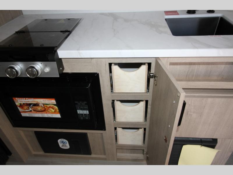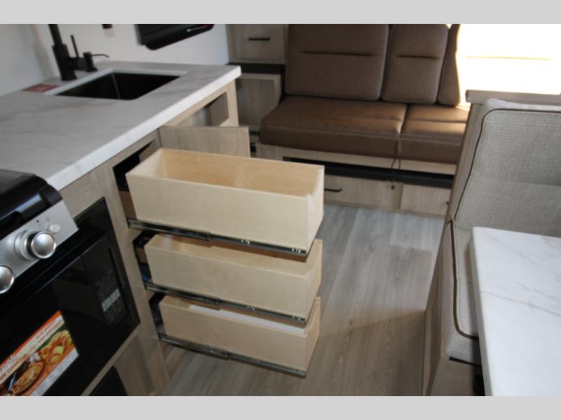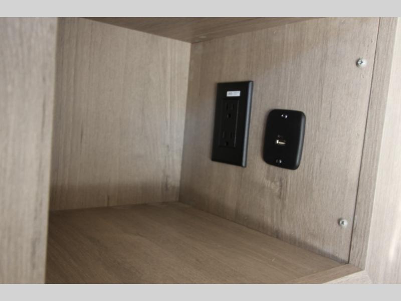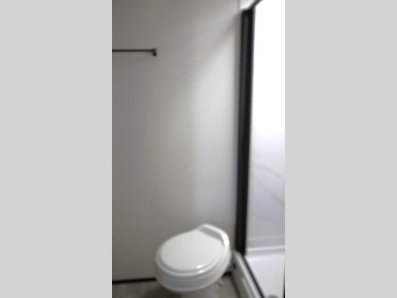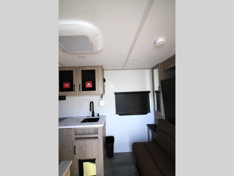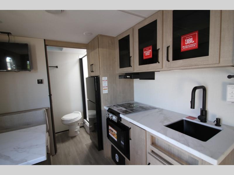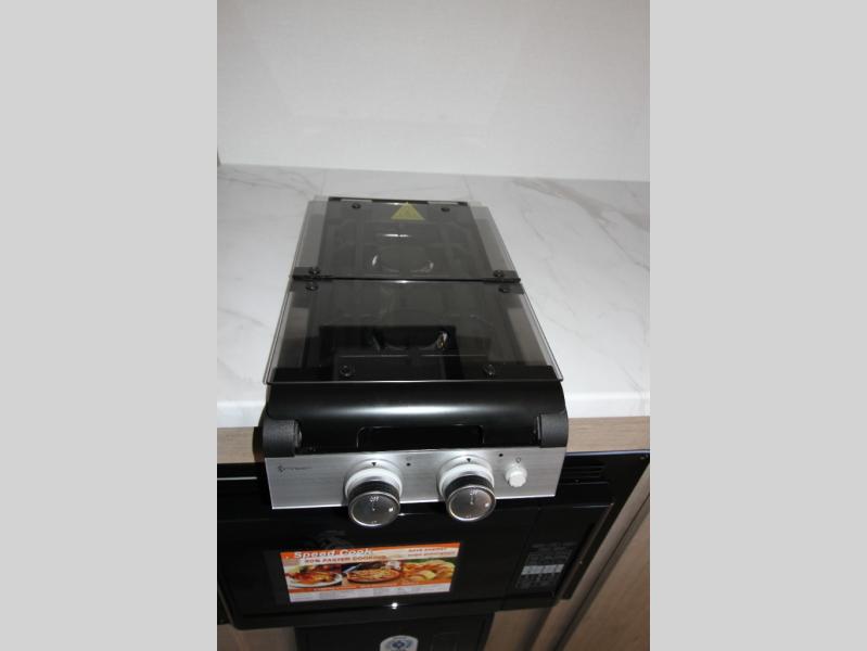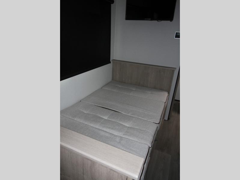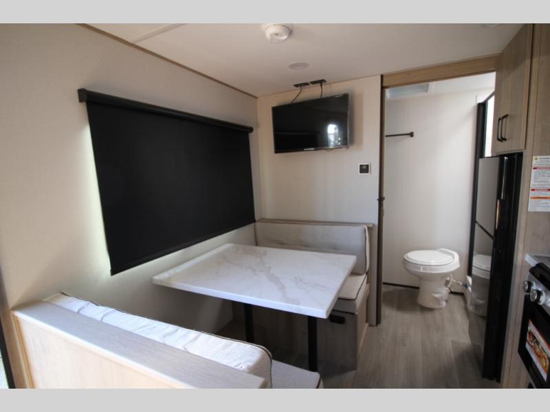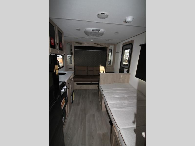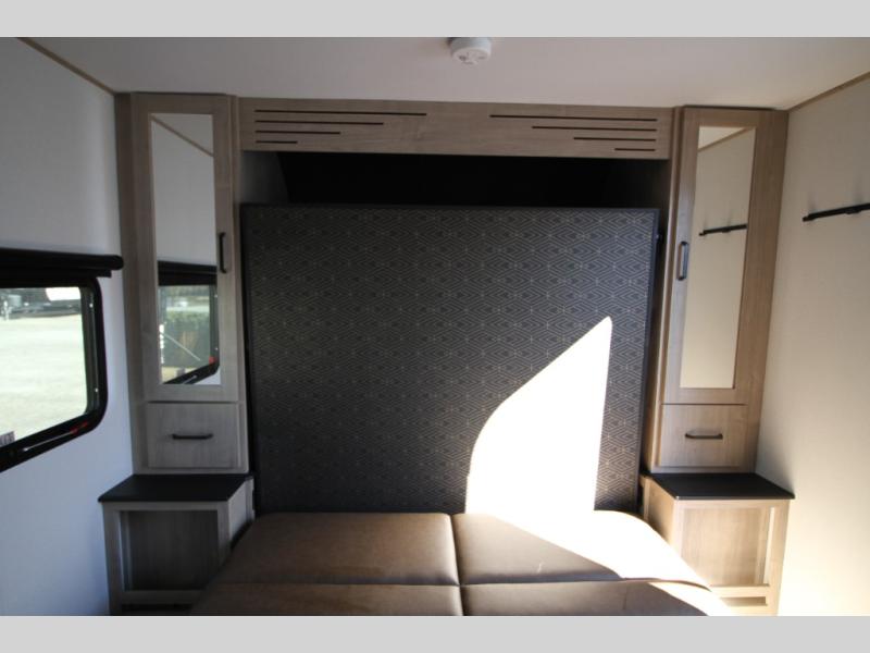 Start looking for your favorite campground to take this travel trailer to! After a fun day at the beach, you can rinse the sand out of your hair with the walk-in shower with a skylight in the full rear bathroom. Depending on what time you enter the unit will determine whether you see the Murphy bed or sofa with shoe storage underneath and wardrobes on either side of it. The booth dinette is not only great for enjoying meals prepared with the two-burner cooktop, but also for transforming into an extra sleeping space!