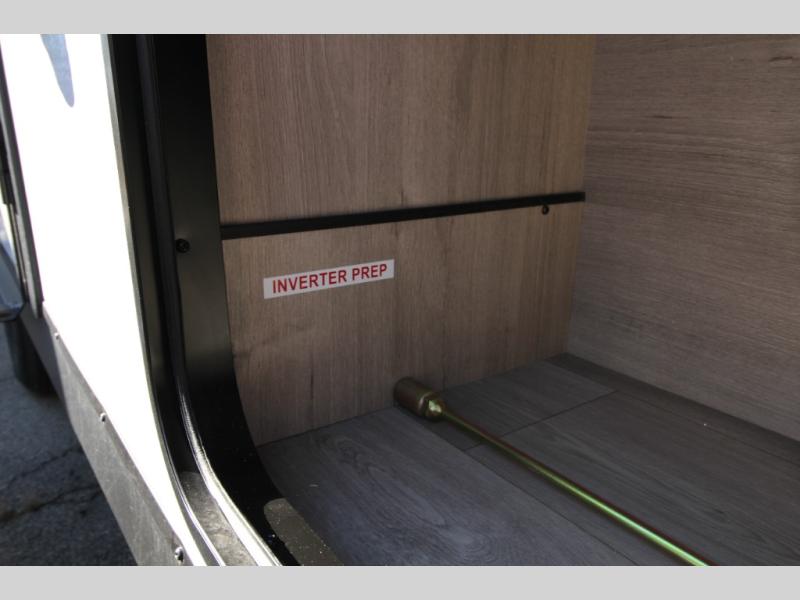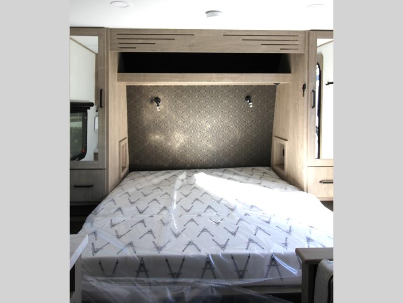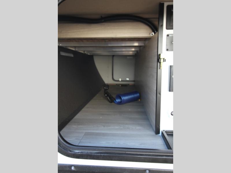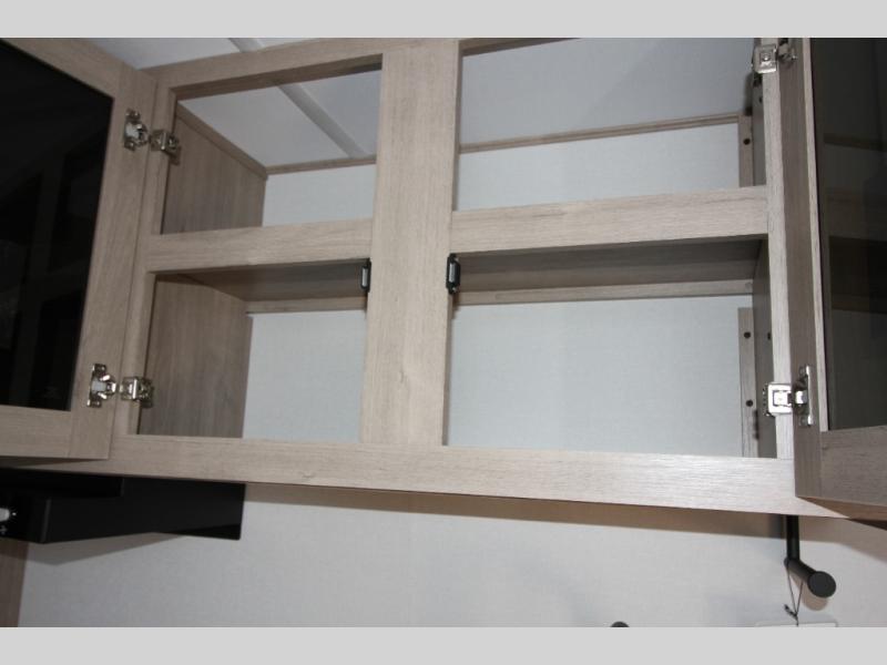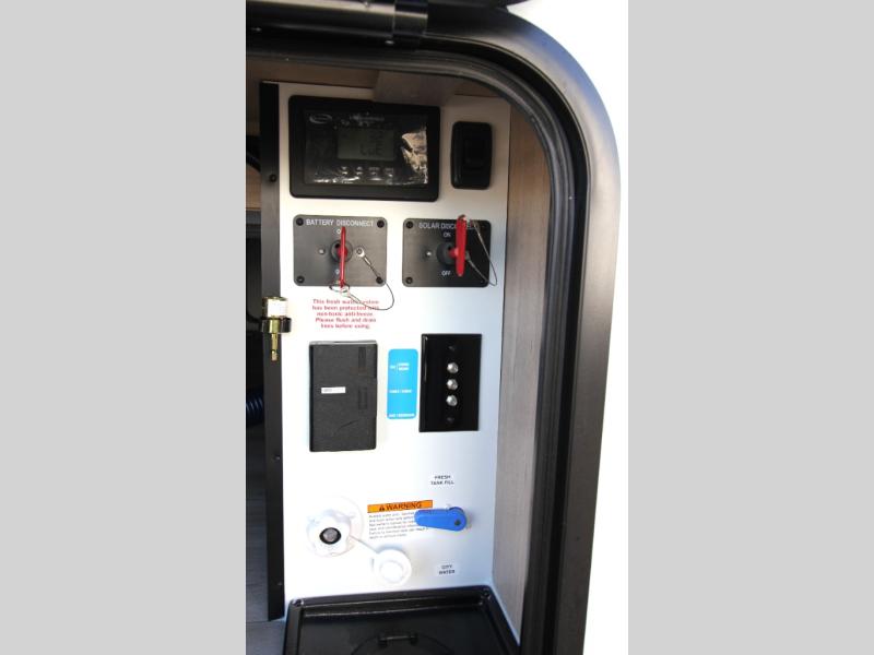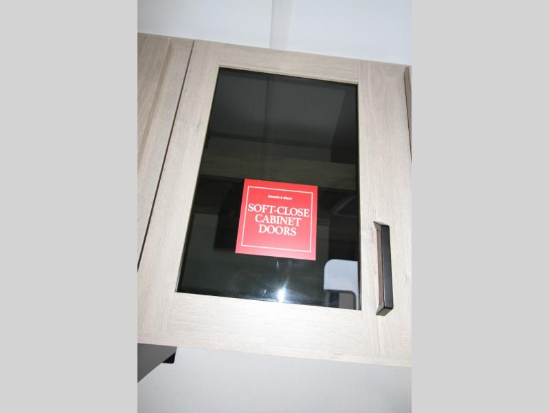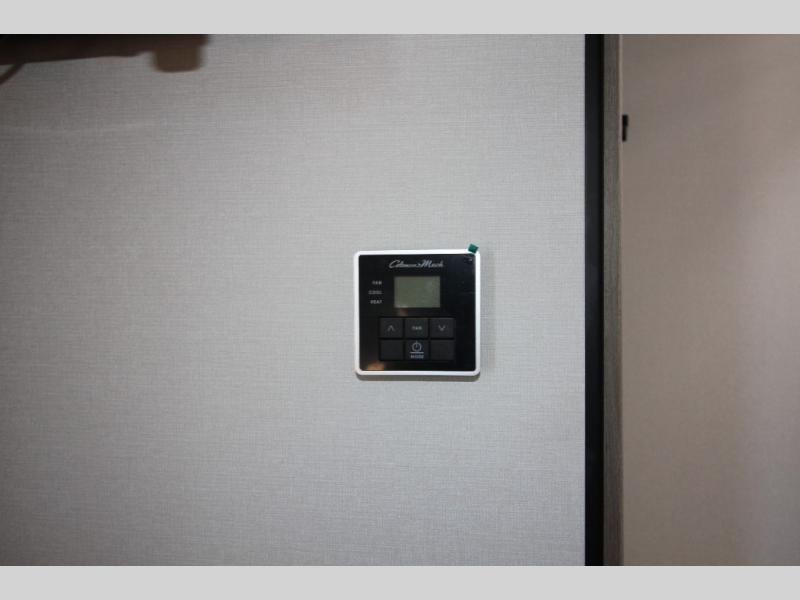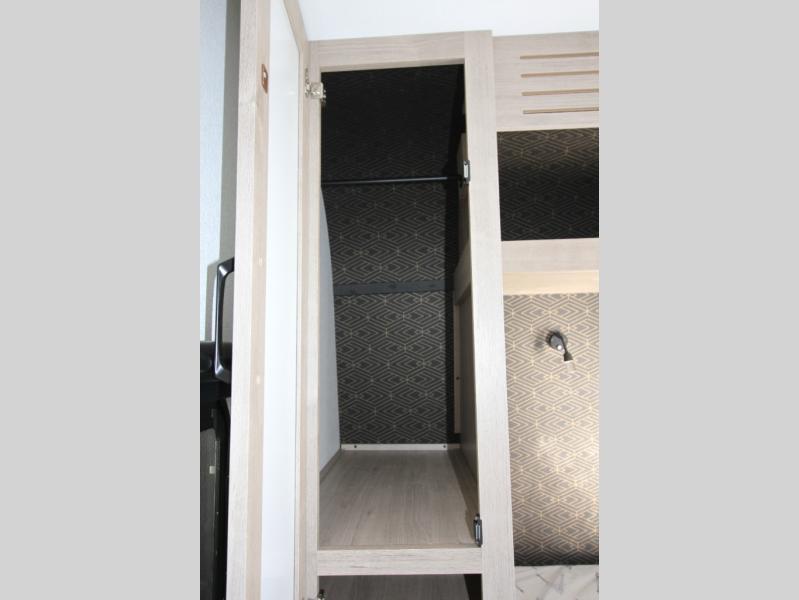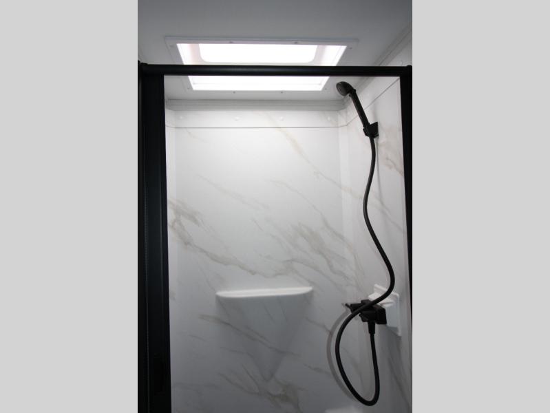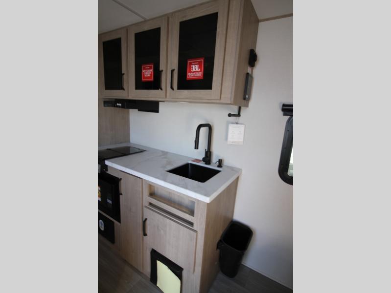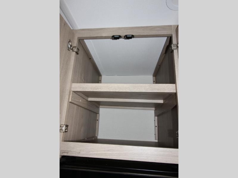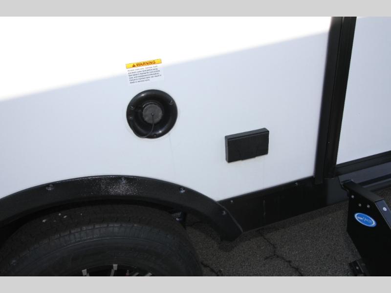 Start looking for your favorite campground to take this travel trailer to! After a fun day at the beach, you can rinse the sand out of your hair with the walk-in shower with a skylight in the full rear bathroom. Depending on what time you enter the unit will determine whether you see the Murphy bed or sofa with shoe storage underneath and wardrobes on either side of it. The booth dinette is not only great for enjoying meals prepared with the two-burner cooktop, but also for transforming into an extra sleeping space!