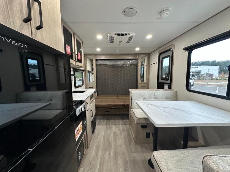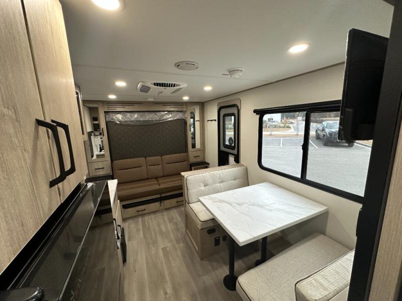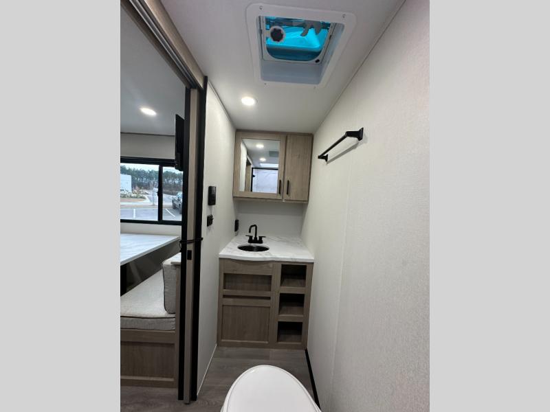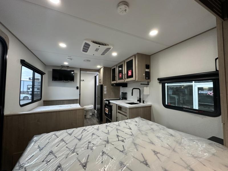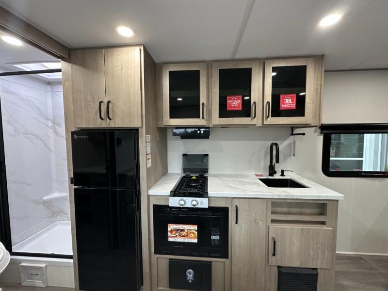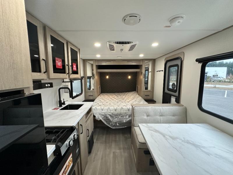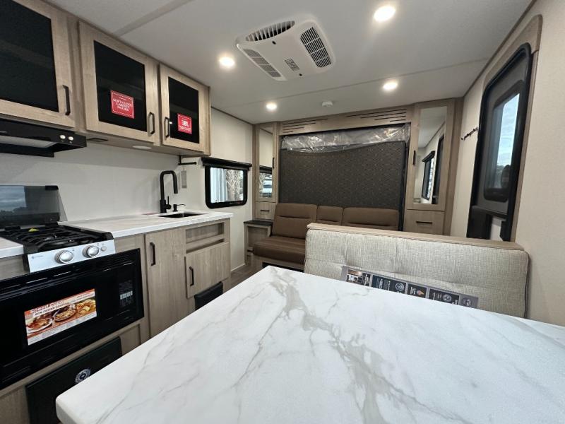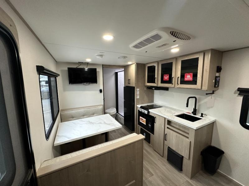 Start looking for your favorite campground to take this travel trailer to! After a fun day at the beach, you can rinse the sand out of your hair with the walk-in shower with a skylight in the full rear bathroom. Depending on what time you enter the unit will determine whether you see the Murphy bed or sofa with shoe storage underneath and wardrobes on either side of it. The booth dinette is not only great for enjoying meals prepared with the two-burner cooktop, but also for transforming into an extra sleeping space!