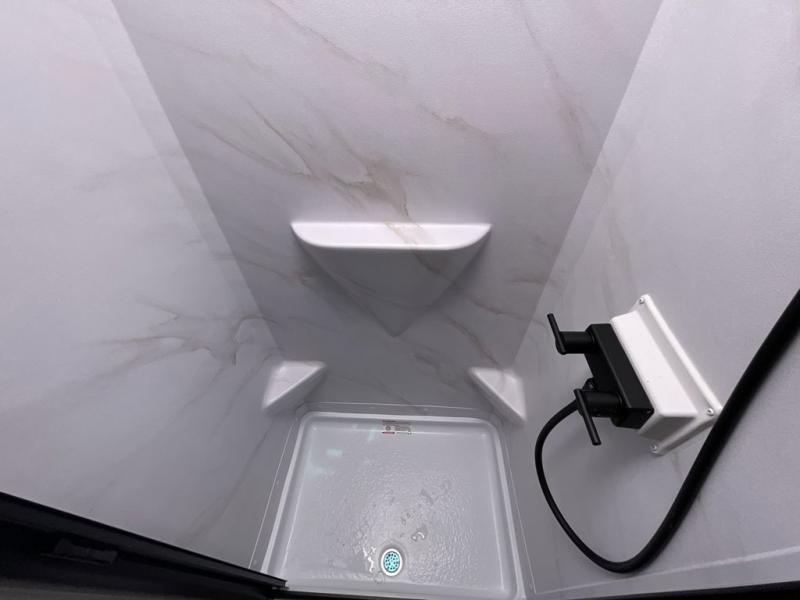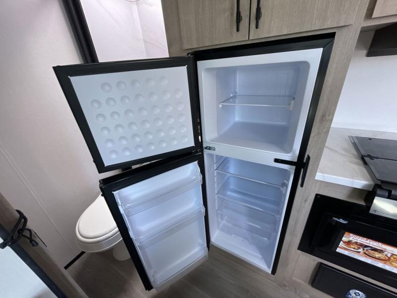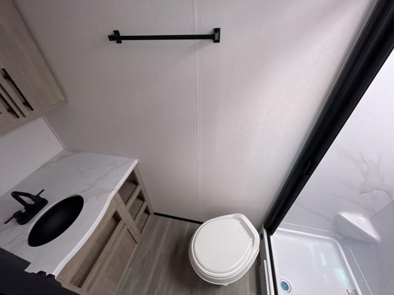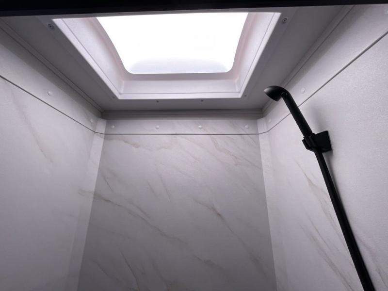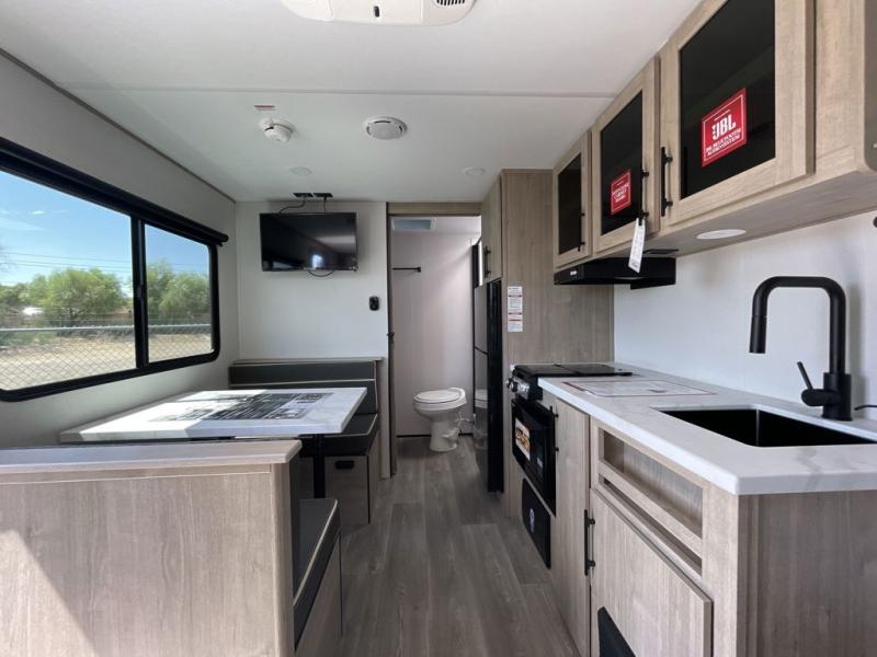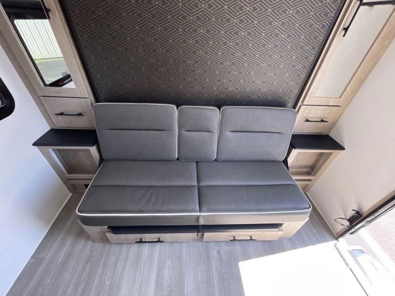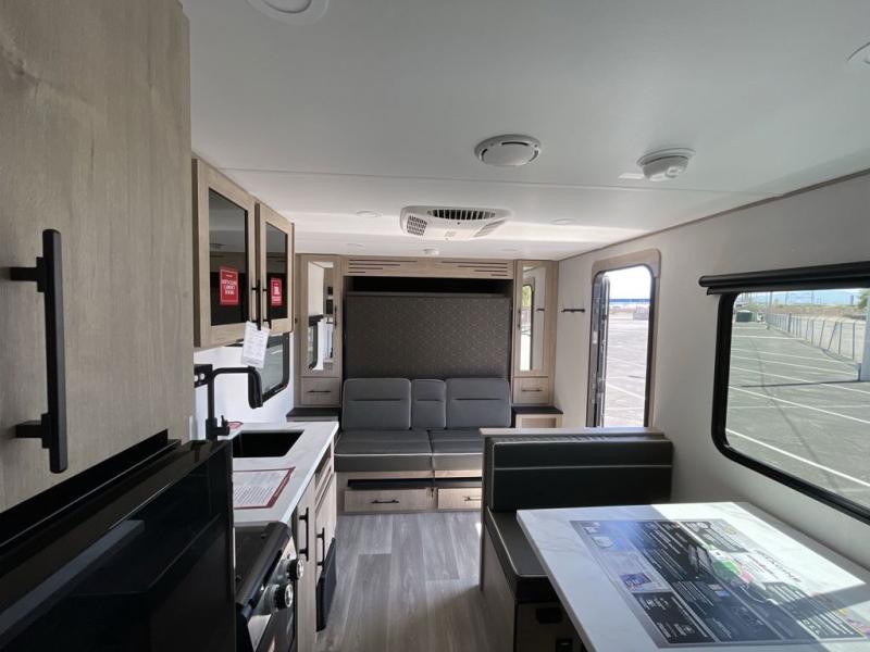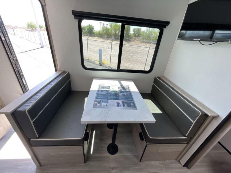 Start looking for your favorite campground to take this travel trailer to! After a fun day at the beach, you can rinse the sand out of your hair with the walk-in shower with a skylight in the full rear bathroom. Depending on what time you enter the unit will determine whether you see the Murphy bed or sofa with shoe storage underneath and wardrobes on either side of it. The booth dinette is not only great for enjoying meals prepared with the two-burner cooktop, but also for transforming into an extra sleeping space!