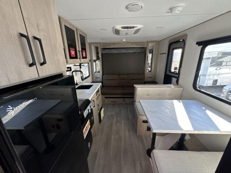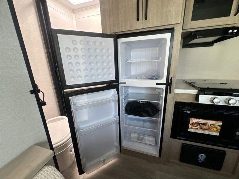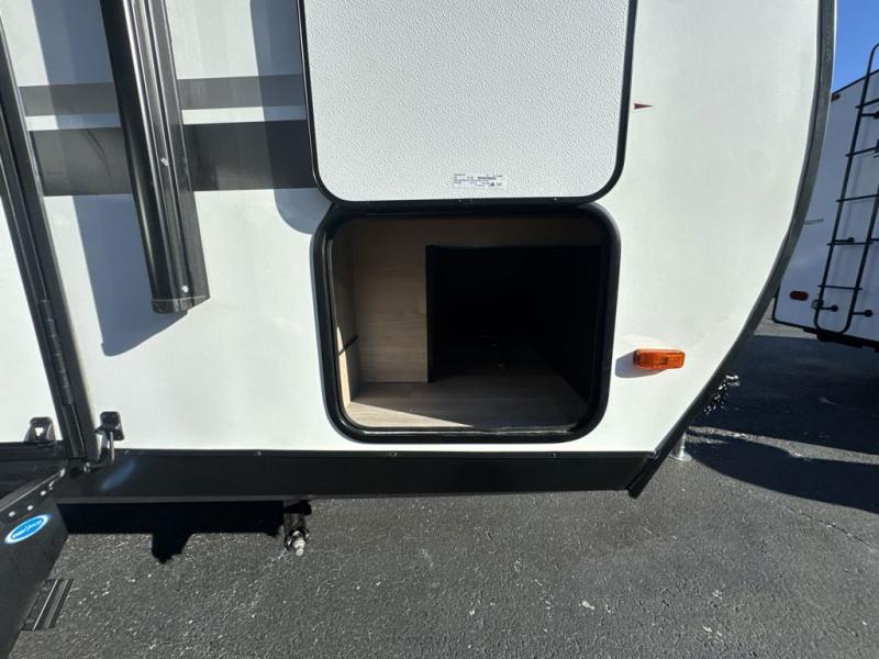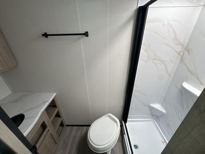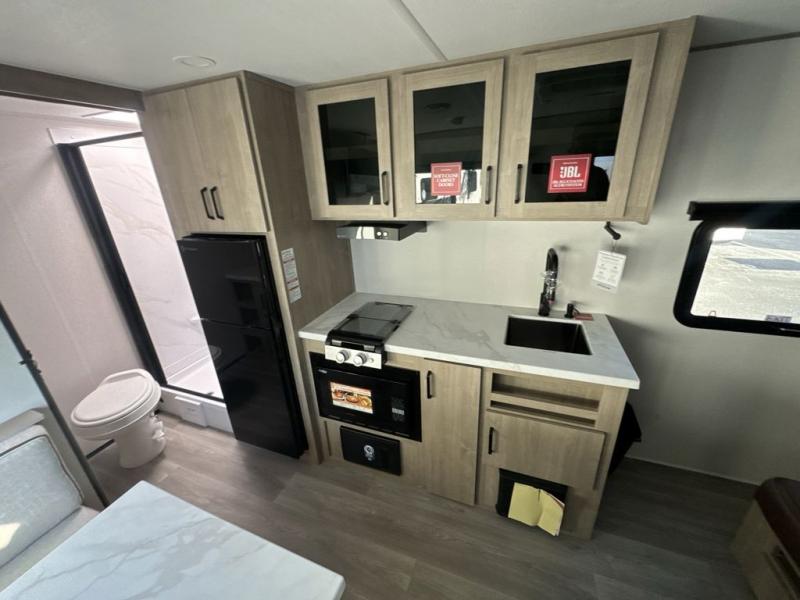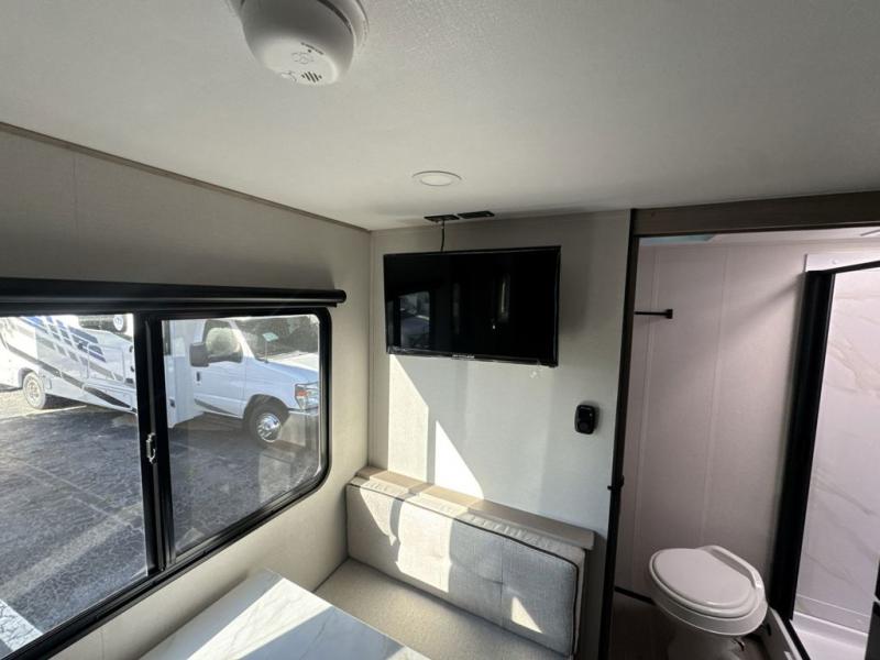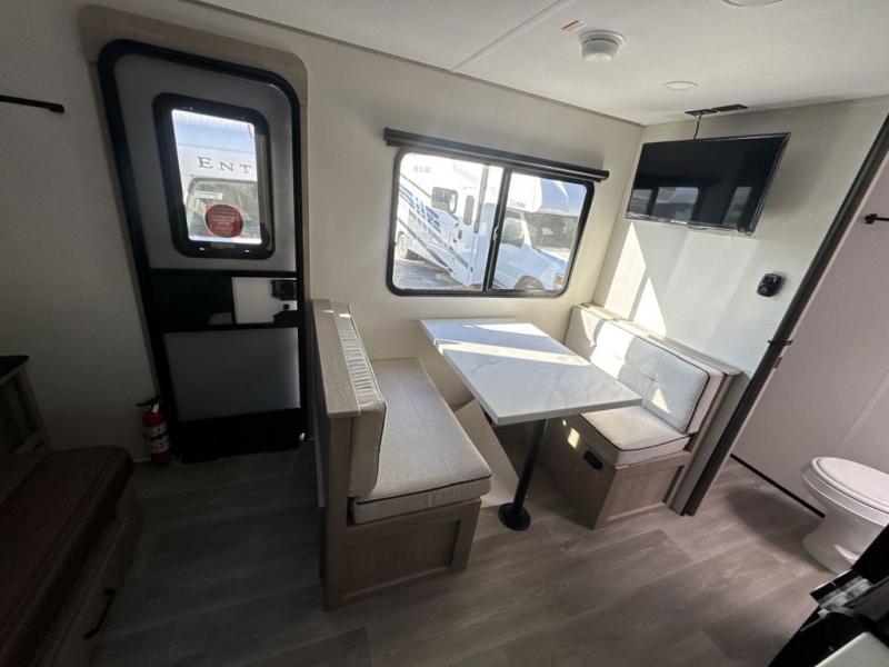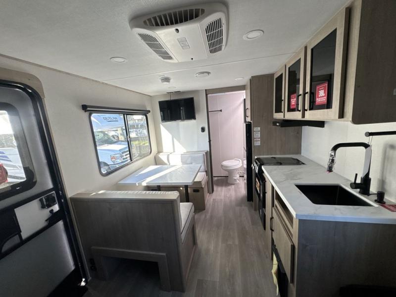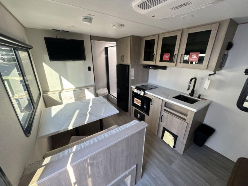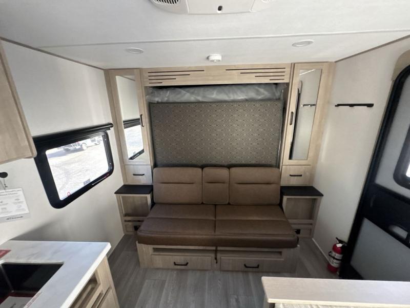 Start looking for your favorite campground to take this travel trailer to! After a fun day at the beach, you can rinse the sand out of your hair with the walk-in shower with a skylight in the full rear bathroom. Depending on what time you enter the unit will determine whether you see the Murphy bed or sofa with shoe storage underneath and wardrobes on either side of it. The booth dinette is not only great for enjoying meals prepared with the two-burner cooktop, but also for transforming into an extra sleeping space!