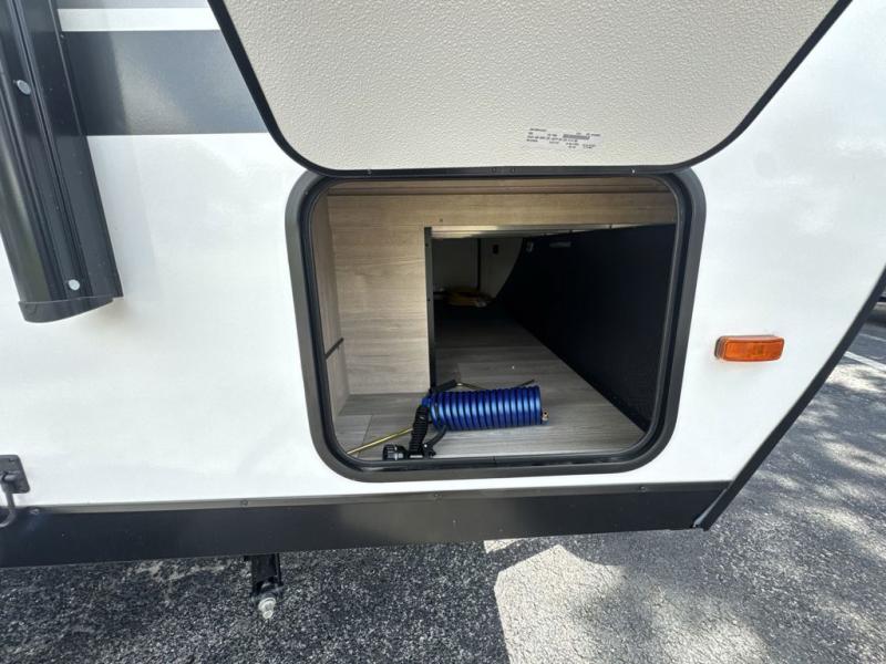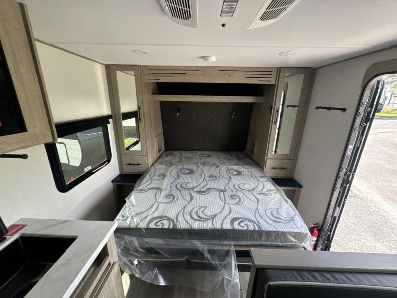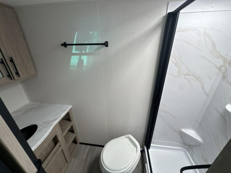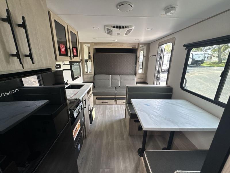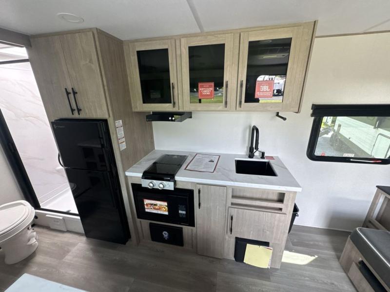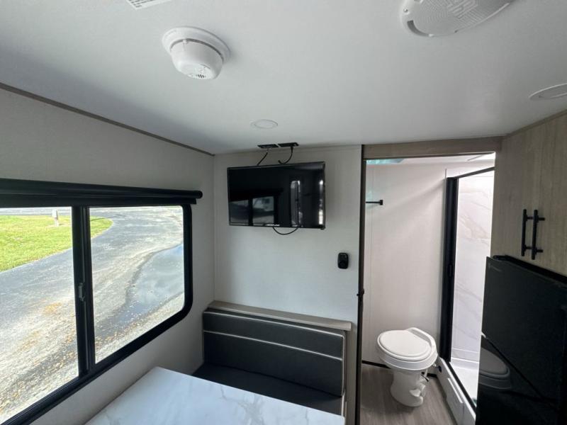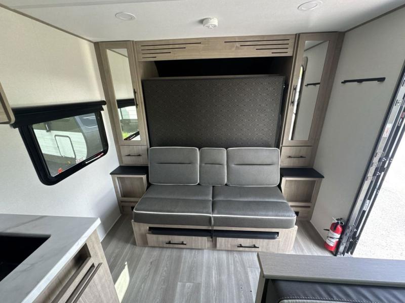 Start looking for your favorite campground to take this travel trailer to! After a fun day at the beach, you can rinse the sand out of your hair with the walk-in shower with a skylight in the full rear bathroom. Depending on what time you enter the unit will determine whether you see the Murphy bed or sofa with shoe storage underneath and wardrobes on either side of it. The booth dinette is not only great for enjoying meals prepared with the two-burner cooktop, but also for transforming into an extra sleeping space!