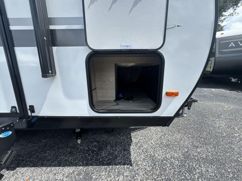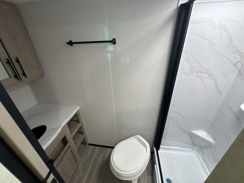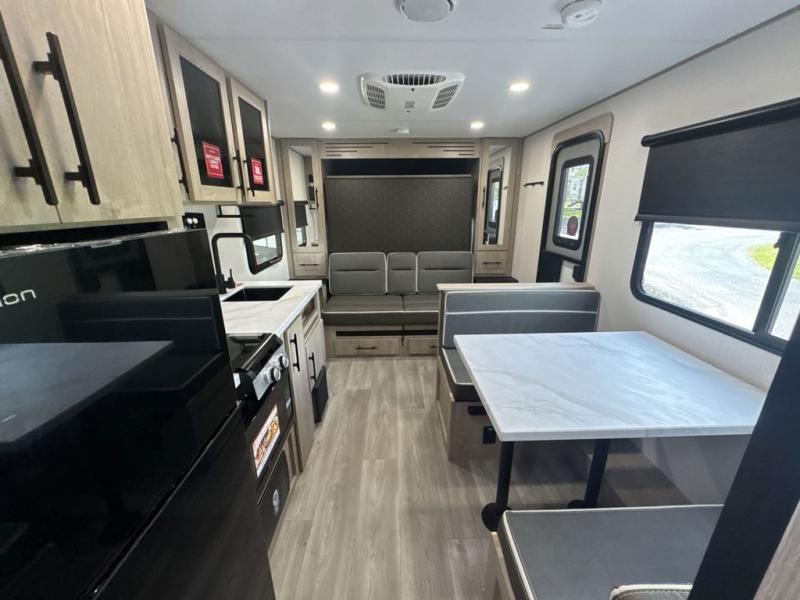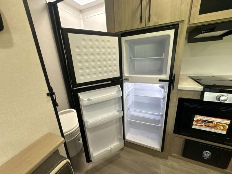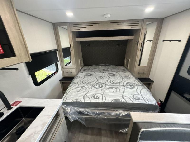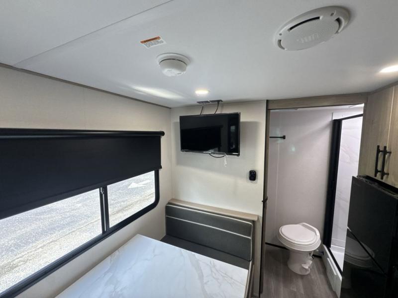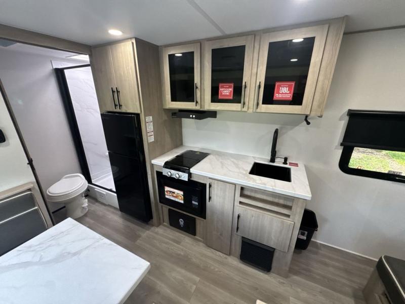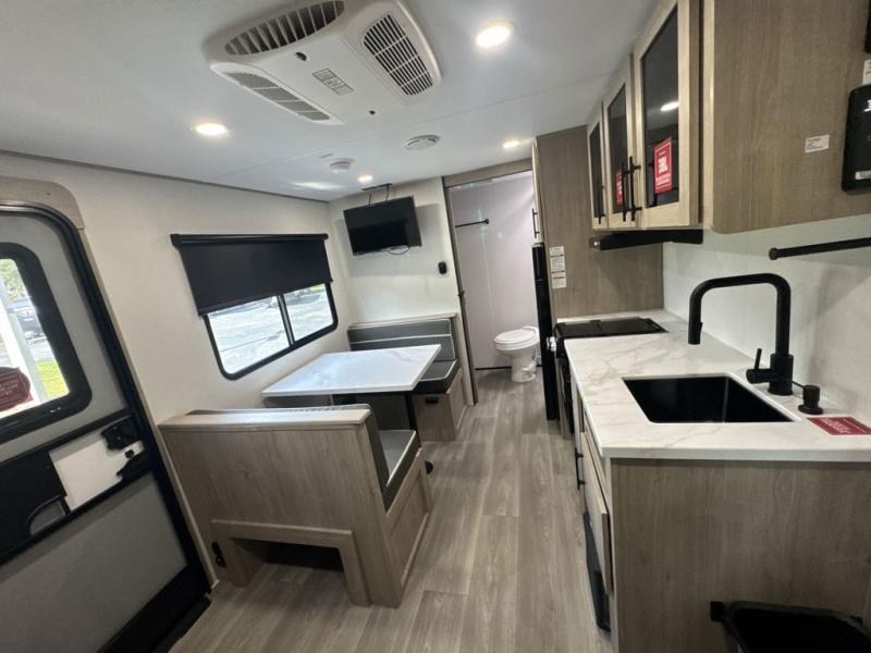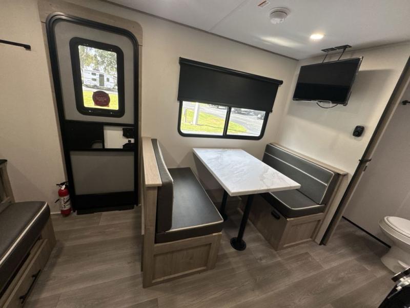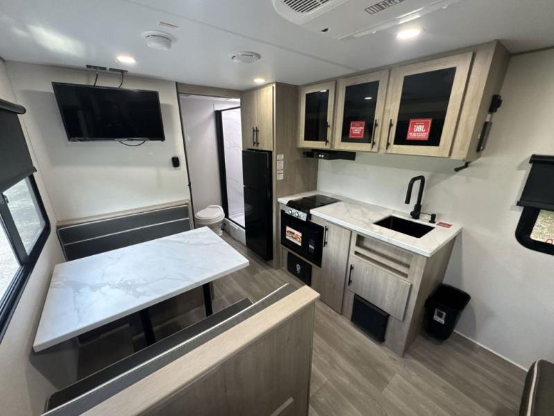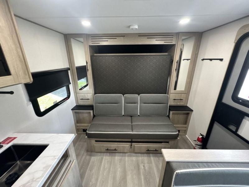 Start looking for your favorite campground to take this travel trailer to! After a fun day at the beach, you can rinse the sand out of your hair with the walk-in shower with a skylight in the full rear bathroom. Depending on what time you enter the unit will determine whether you see the Murphy bed or sofa with shoe storage underneath and wardrobes on either side of it. The booth dinette is not only great for enjoying meals prepared with the two-burner cooktop, but also for transforming into an extra sleeping space!