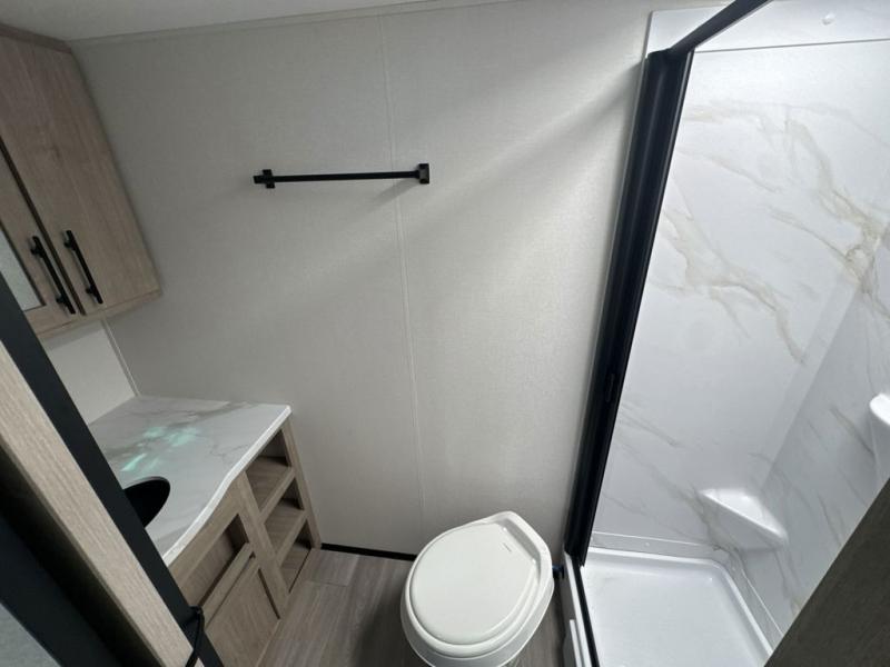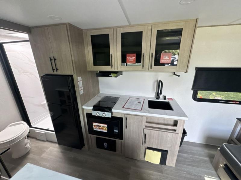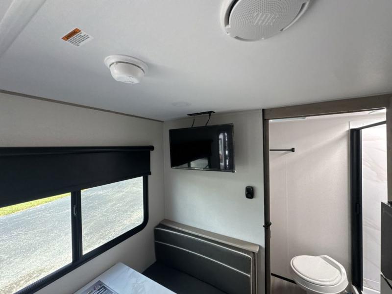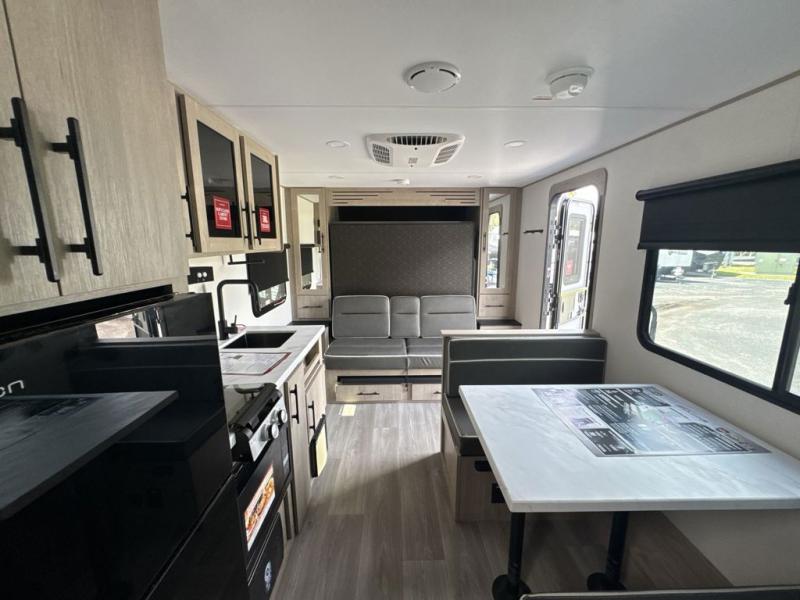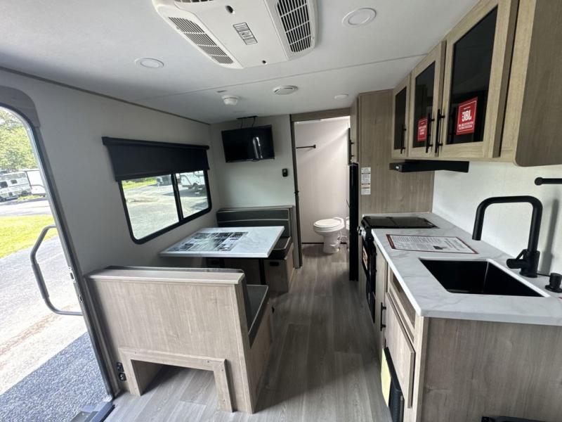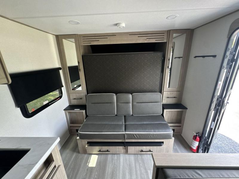 Start looking for your favorite campground to take this travel trailer to! After a fun day at the beach, you can rinse the sand out of your hair with the walk-in shower with a skylight in the full rear bathroom. Depending on what time you enter the unit will determine whether you see the Murphy bed or sofa with shoe storage underneath and wardrobes on either side of it. The booth dinette is not only great for enjoying meals prepared with the two-burner cooktop, but also for transforming into an extra sleeping space!