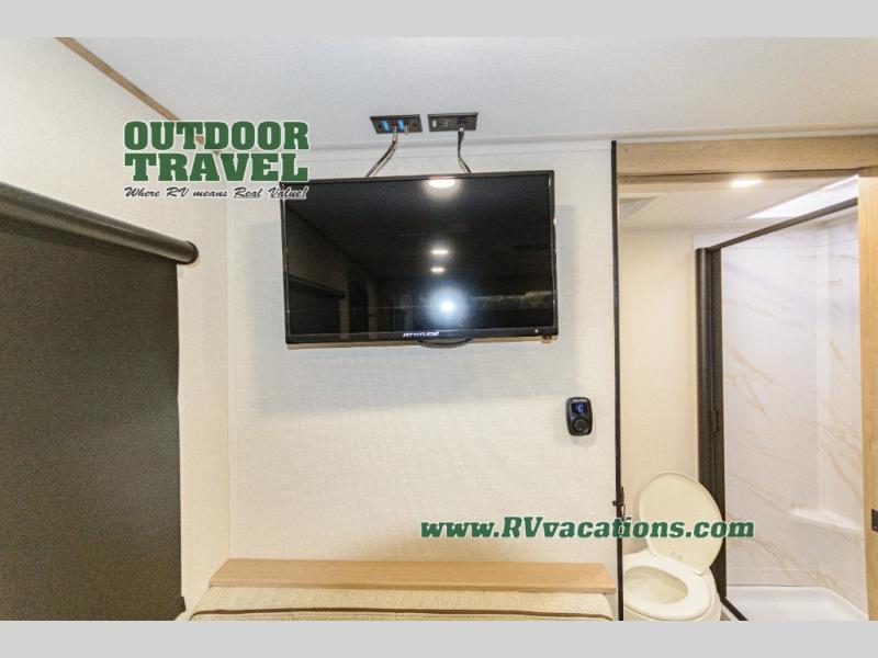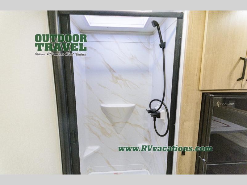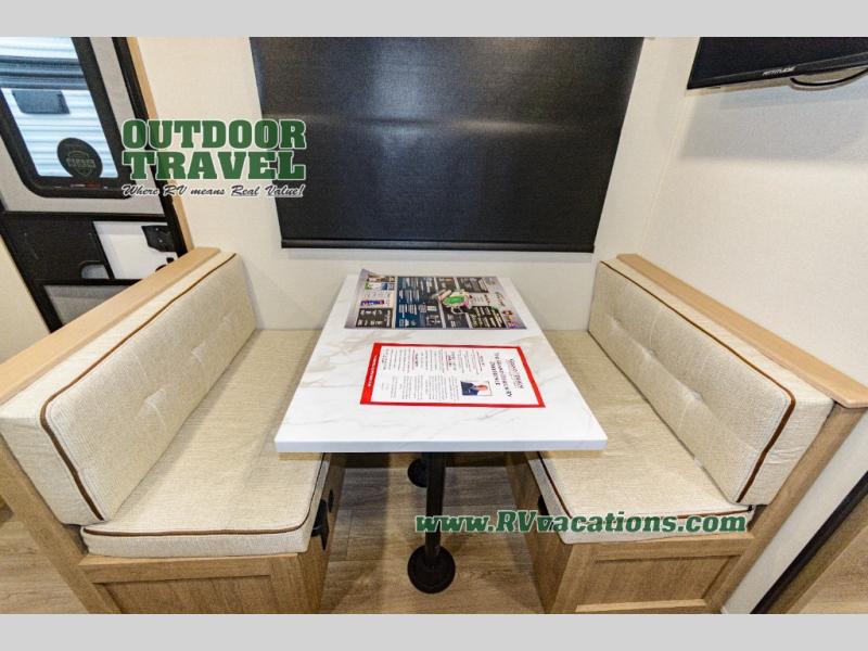 Start looking for your favorite campground to take this travel trailer to! After a fun day at the beach, you can rinse the sand out of your hair with the walk-in shower with a skylight in the full rear bathroom. Depending on what time you enter the unit will determine whether you see the Murphy bed or sofa with shoe storage underneath and wardrobes on either side of it. The booth dinette is not only great for enjoying meals prepared with the two-burner cooktop, but also for transforming into an extra sleeping space!