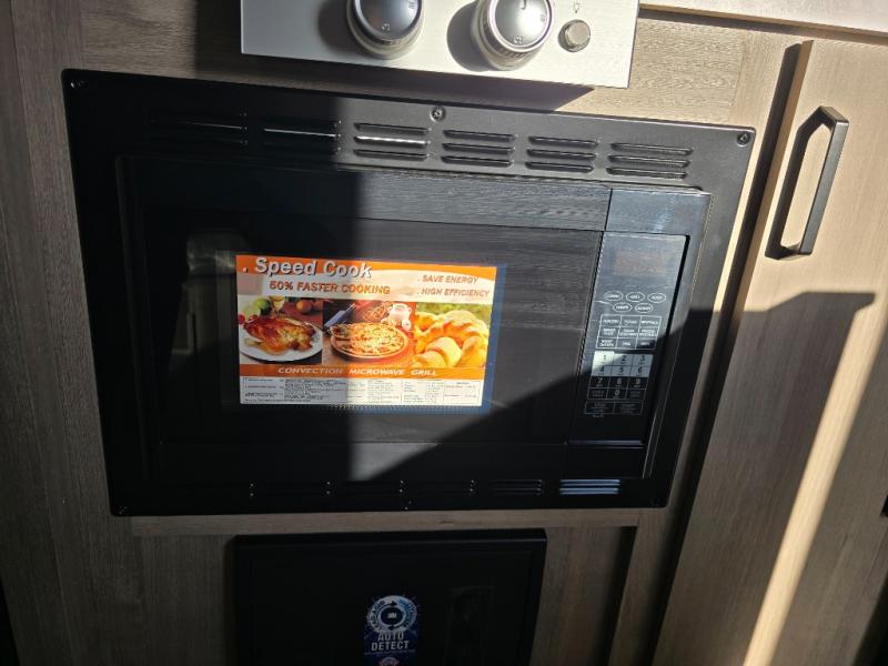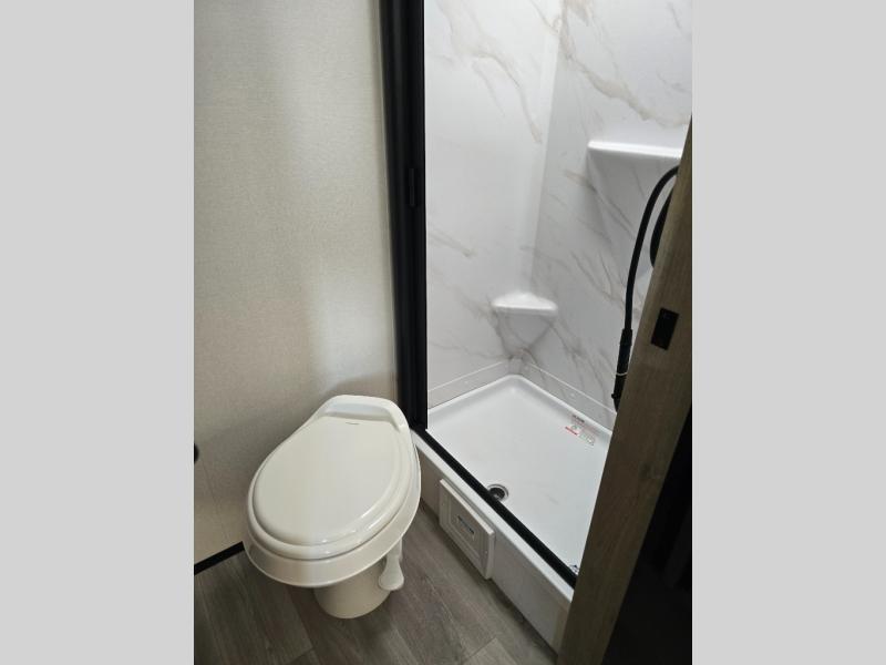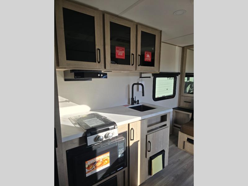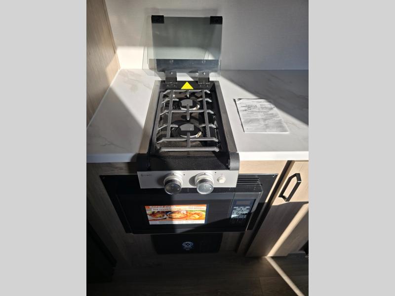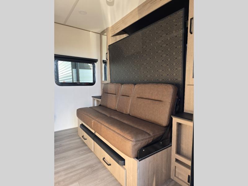 Start looking for your favorite campground to take this travel trailer to! After a fun day at the beach, you can rinse the sand out of your hair with the walk-in shower with a skylight in the full rear bathroom. Depending on what time you enter the unit will determine whether you see the Murphy bed or sofa with shoe storage underneath and wardrobes on either side of it. The booth dinette is not only great for enjoying meals prepared with the two-burner cooktop, but also for transforming into an extra sleeping space!