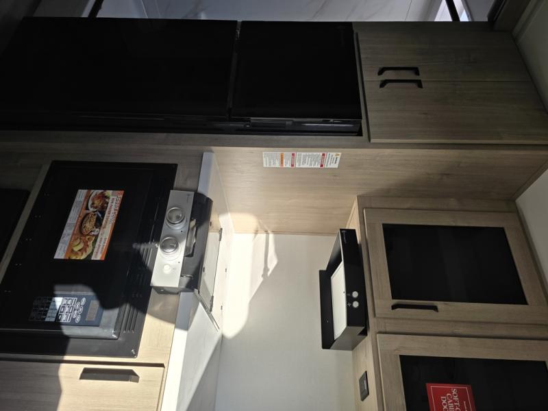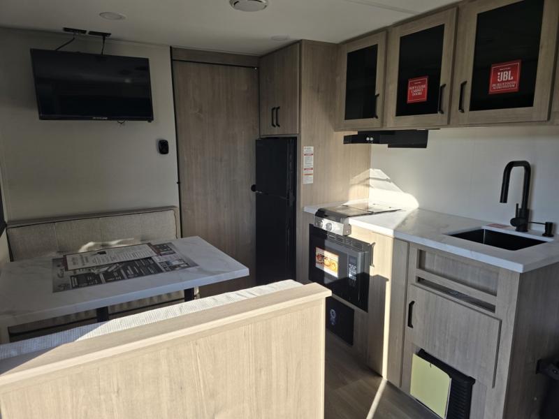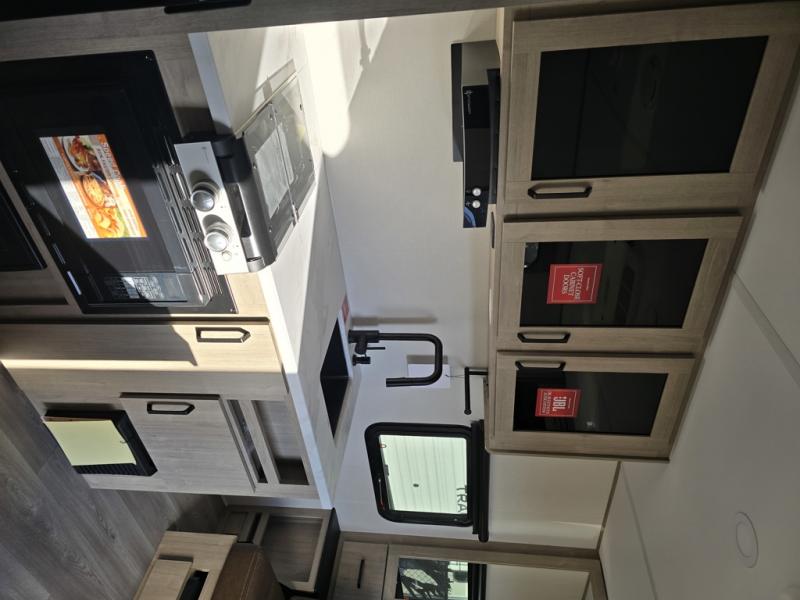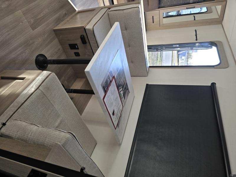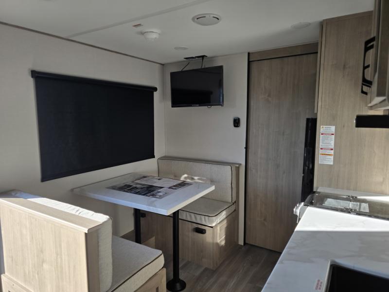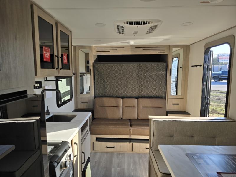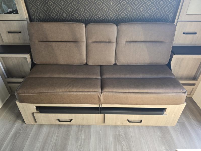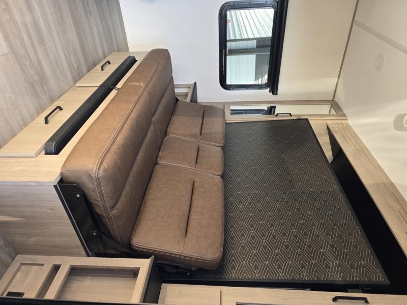 Start looking for your favorite campground to take this travel trailer to! After a fun day at the beach, you can rinse the sand out of your hair with the walk-in shower with a skylight in the full rear bathroom. Depending on what time you enter the unit will determine whether you see the Murphy bed or sofa with shoe storage underneath and wardrobes on either side of it. The booth dinette is not only great for enjoying meals prepared with the two-burner cooktop, but also for transforming into an extra sleeping space!
