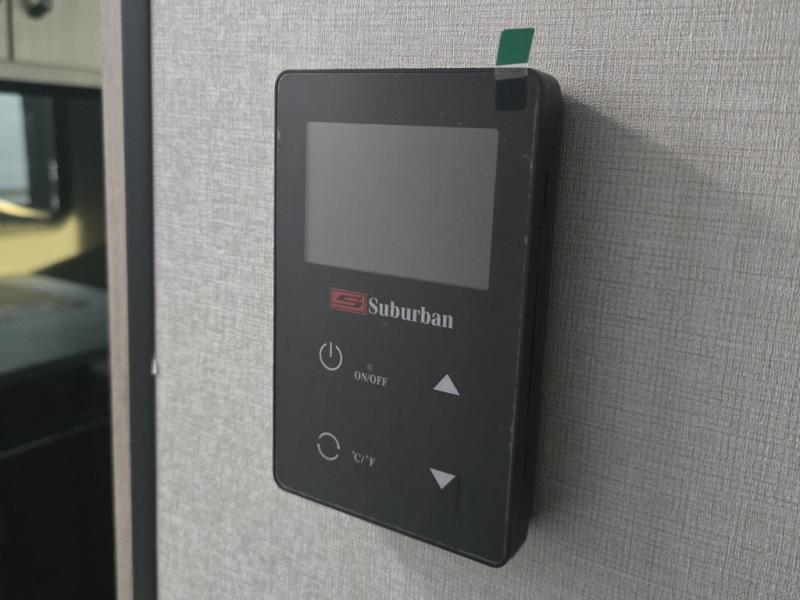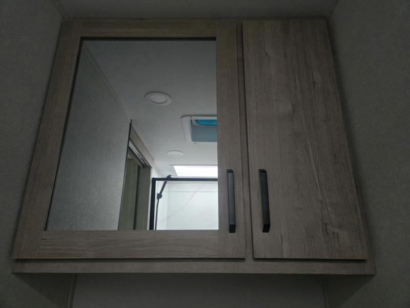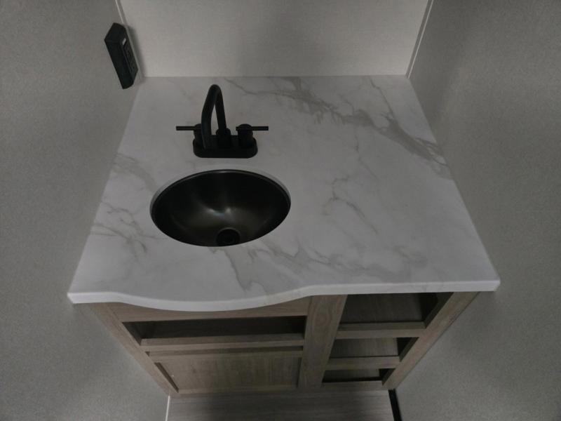 Start looking for your favorite campground to take this travel trailer to! After a fun day at the beach, you can rinse the sand out of your hair with the walk-in shower with a skylight in the full rear bathroom. Depending on what time you enter the unit will determine whether you see the Murphy bed or sofa with shoe storage underneath and wardrobes on either side of it. The booth dinette is not only great for enjoying meals prepared with the two-burner cooktop, but also for transforming into an extra sleeping space!