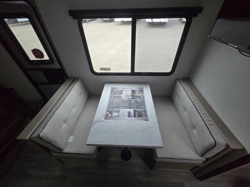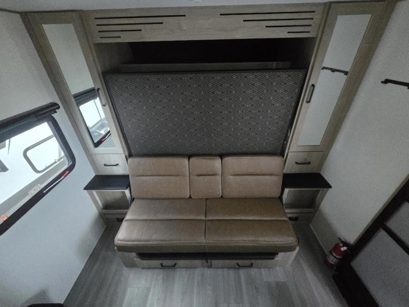 Start looking for your favorite campground to take this travel trailer to! After a fun day at the beach, you can rinse the sand out of your hair with the walk-in shower with a skylight in the full rear bathroom. Depending on what time you enter the unit will determine whether you see the Murphy bed or sofa with shoe storage underneath and wardrobes on either side of it. The booth dinette is not only great for enjoying meals prepared with the two-burner cooktop, but also for transforming into an extra sleeping space!