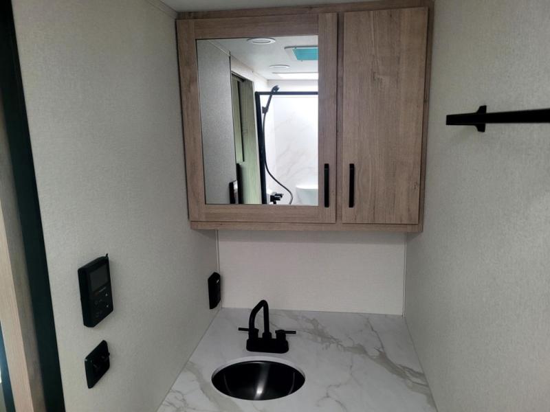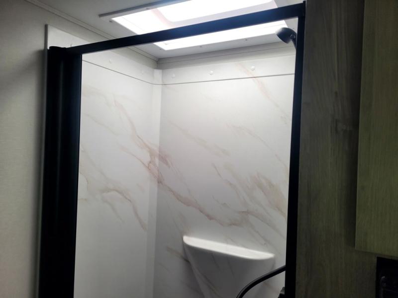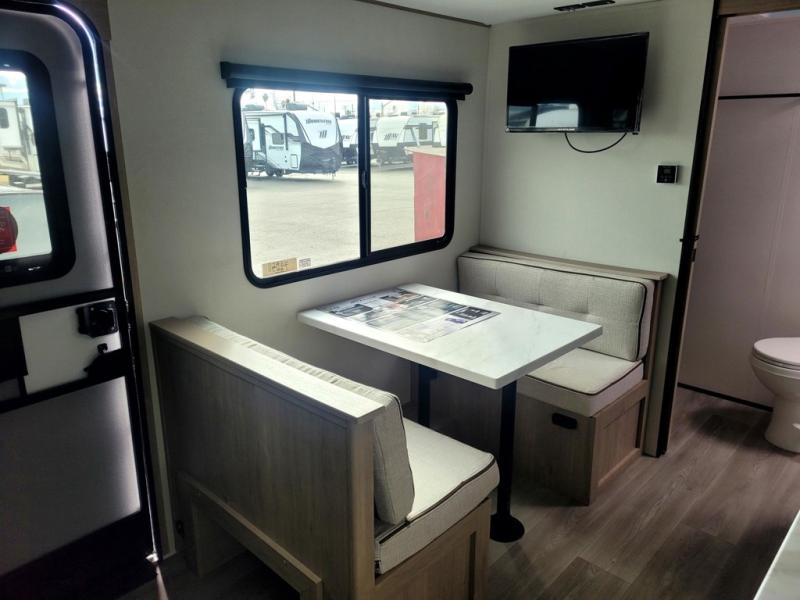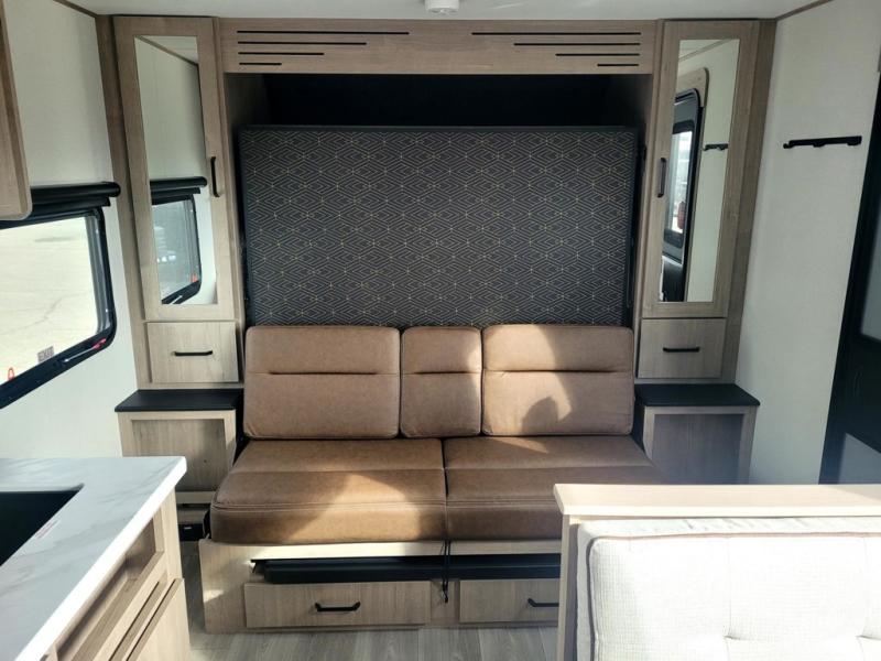 Start looking for your favorite campground to take this travel trailer to! After a fun day at the beach, you can rinse the sand out of your hair with the walk-in shower with a skylight in the full rear bathroom. Depending on what time you enter the unit will determine whether you see the Murphy bed or sofa with shoe storage underneath and wardrobes on either side of it. The booth dinette is not only great for enjoying meals prepared with the two-burner cooktop, but also for transforming into an extra sleeping space!