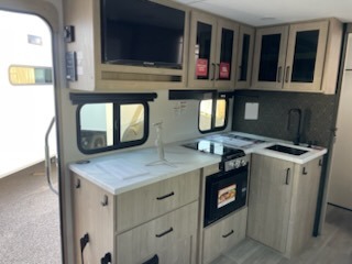 Pack your bags and head out on a fun camping trip in this travel trailer! The front queen bed offers a comfortable place to sleep at night, as well as the roll-over sleeper sofa slide with shoe storage. You can make meals on the cooktop or in the convection microwave. The full rear bathroom has a walk-in shower with an oversized vanity to easily get ready each day. Outside, you'll find a spray port, an unobstructed pass-thru storage, and an interior/exterior table to use at your convenience.