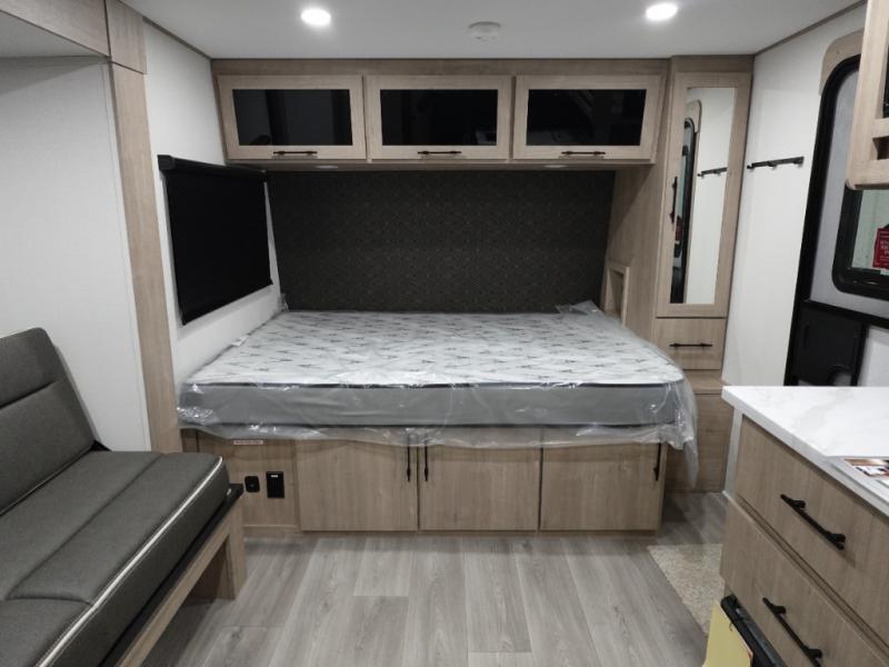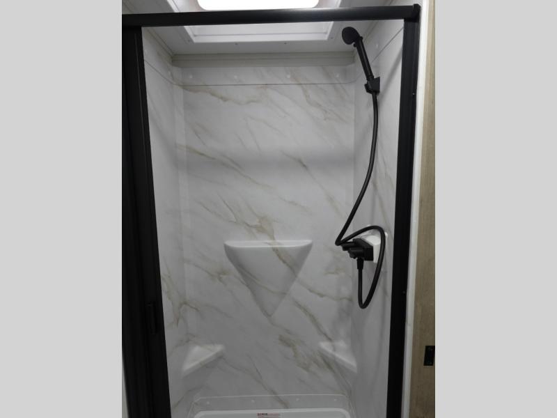 Pack your bags and head out on a fun camping trip in this travel trailer! The front queen bed offers a comfortable place to sleep at night, as well as the roll-over sleeper sofa slide with drawers for storage. You can make meals on the cooktop or in the convection microwave. The full rear bathroom has a walk-in shower with an oversized vanity to easily get ready each day. Outside, you'll find a spray port, an unobstructed pass-thru storage, and an interior/exterior table to use at your convenience.