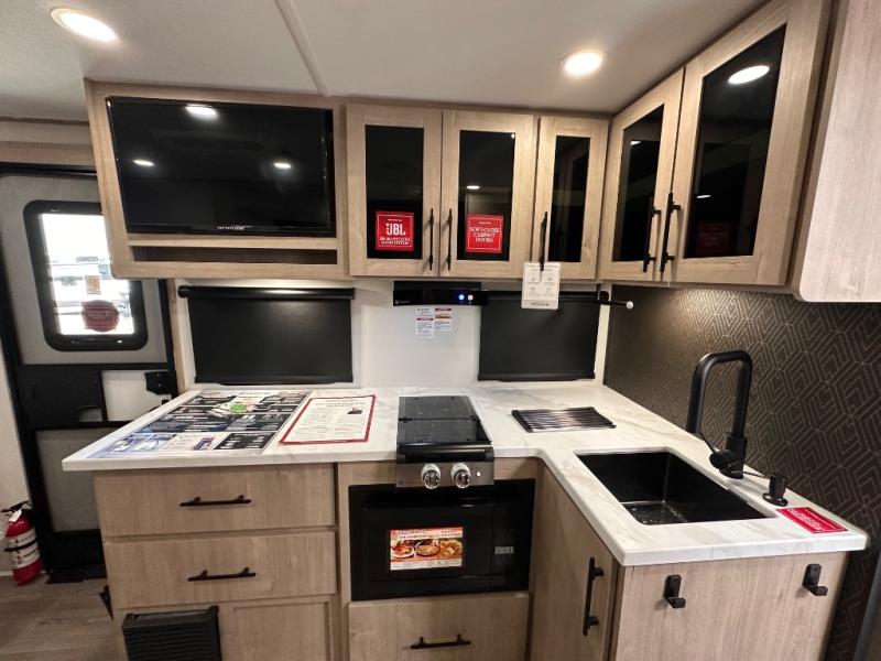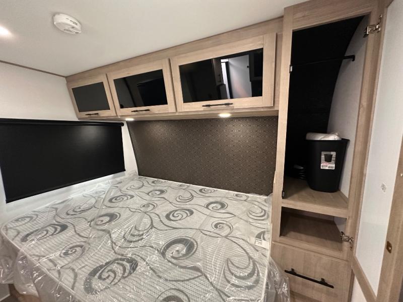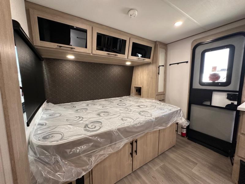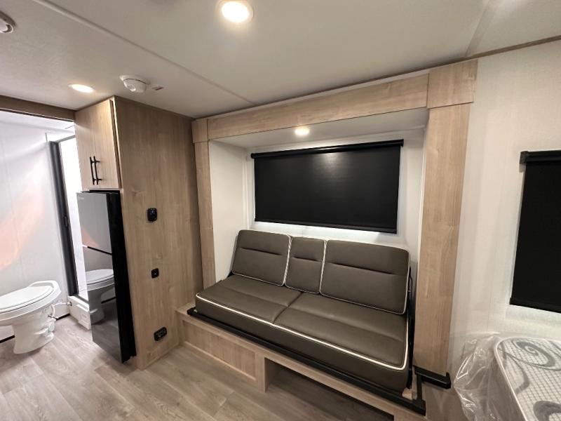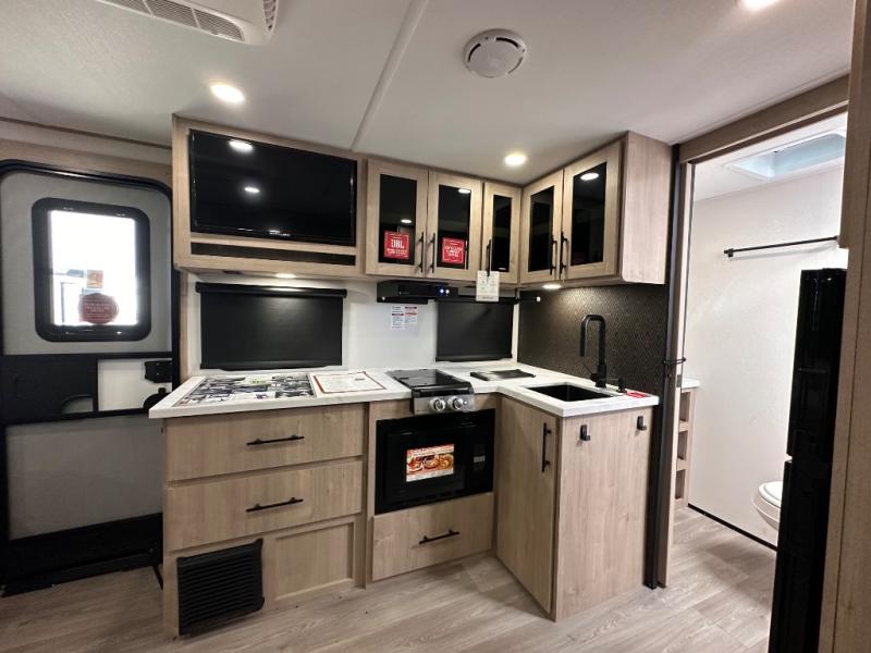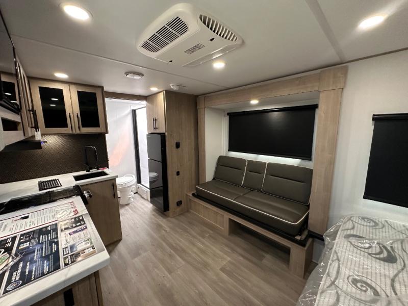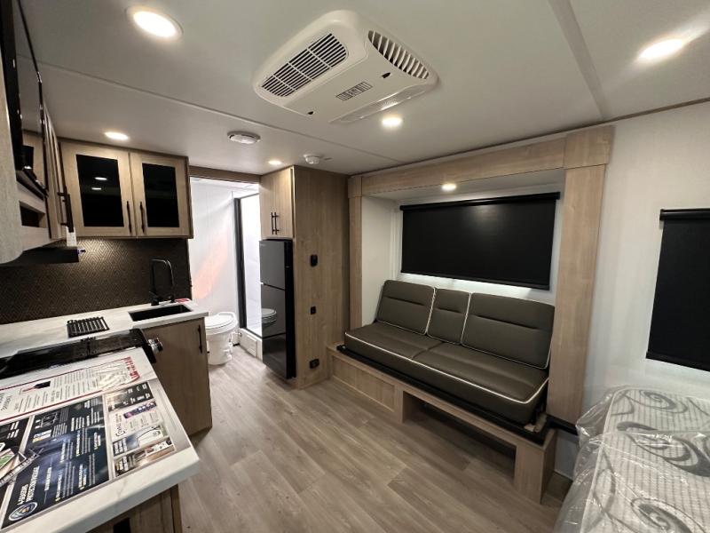 Pack your bags and head out on a fun camping trip in this travel trailer! The front queen bed offers a comfortable place to sleep at night, as well as the roll-over sleeper sofa slide with drawers for storage. You can make meals on the cooktop or in the convection microwave. The full rear bathroom has a walk-in shower with an oversized vanity to easily get ready each day. Outside, you'll find a spray port, an unobstructed pass-thru storage, and an interior/exterior table to use at your convenience.