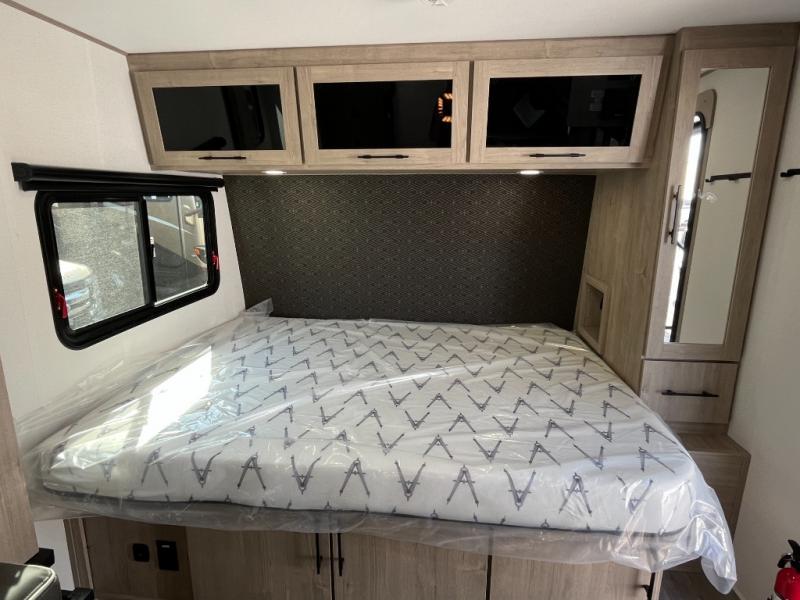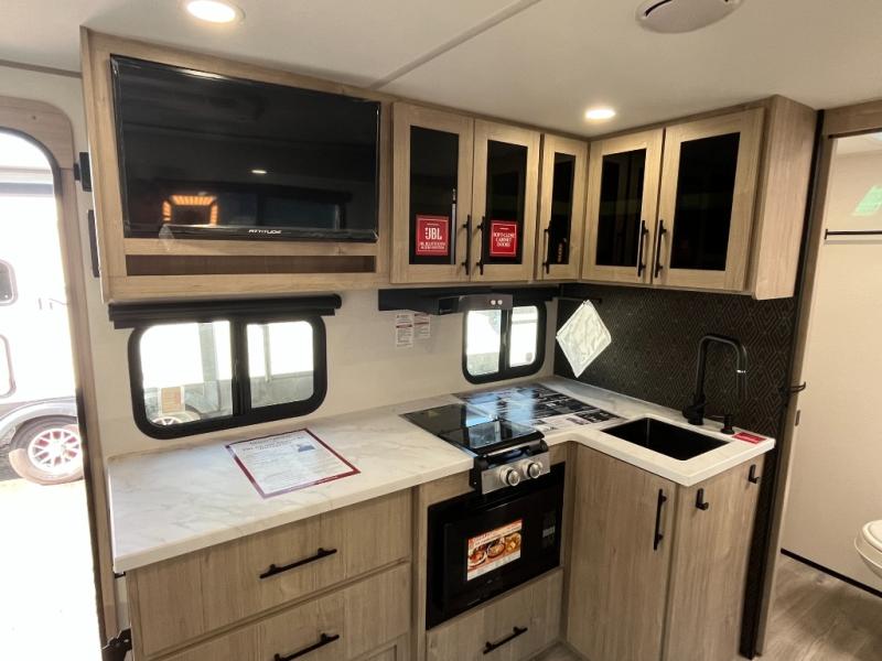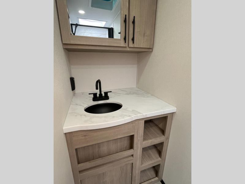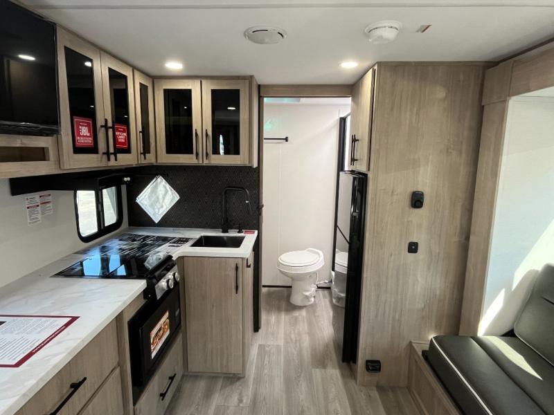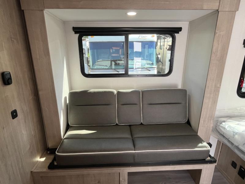 Pack your bags and head out on a fun camping trip in this travel trailer! The front queen bed offers a comfortable place to sleep at night, as well as the roll-over sleeper sofa slide with drawers for storage. You can make meals on the cooktop or in the convection microwave. The full rear bathroom has a walk-in shower with an oversized vanity to easily get ready each day. Outside, you'll find a spray port, an unobstructed pass-thru storage, and an interior/exterior table to use at your convenience.