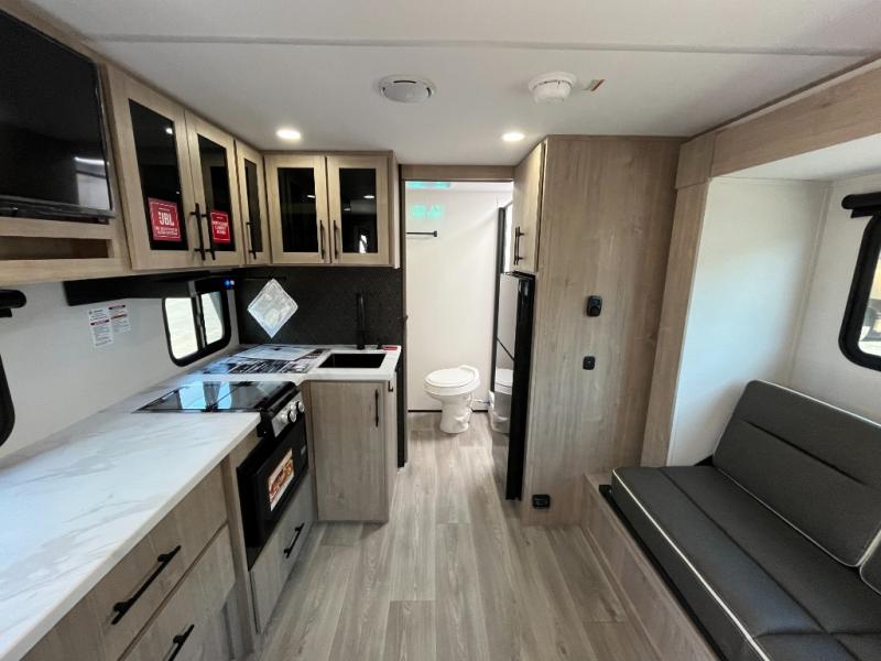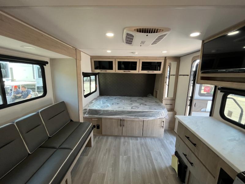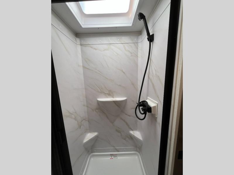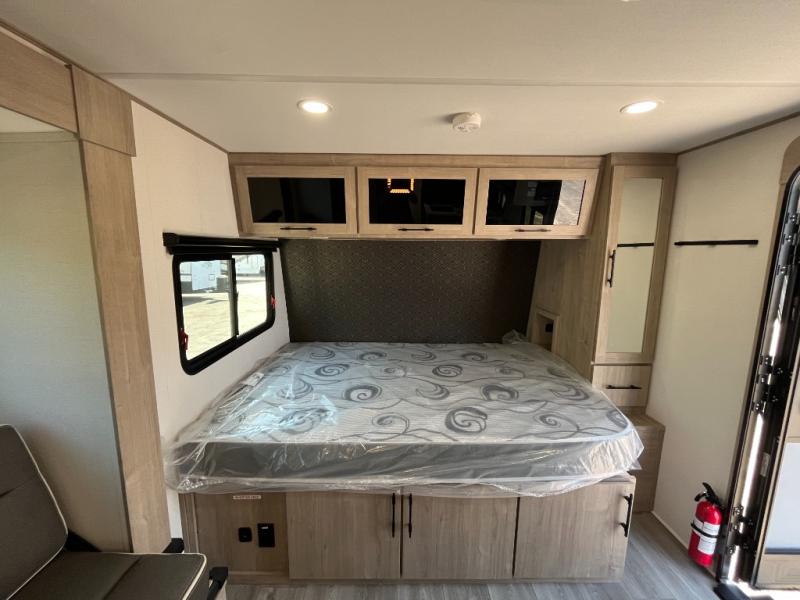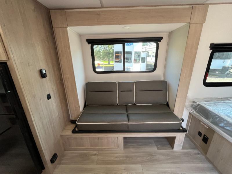 Pack your bags and head out on a fun camping trip in this travel trailer! The front queen bed offers a comfortable place to sleep at night, as well as the roll-over sleeper sofa slide with drawers for storage. You can make meals on the cooktop or in the convection microwave. The full rear bathroom has a walk-in shower with an oversized vanity to easily get ready each day. Outside, you'll find a spray port, an unobstructed pass-thru storage, and an interior/exterior table to use at your convenience.