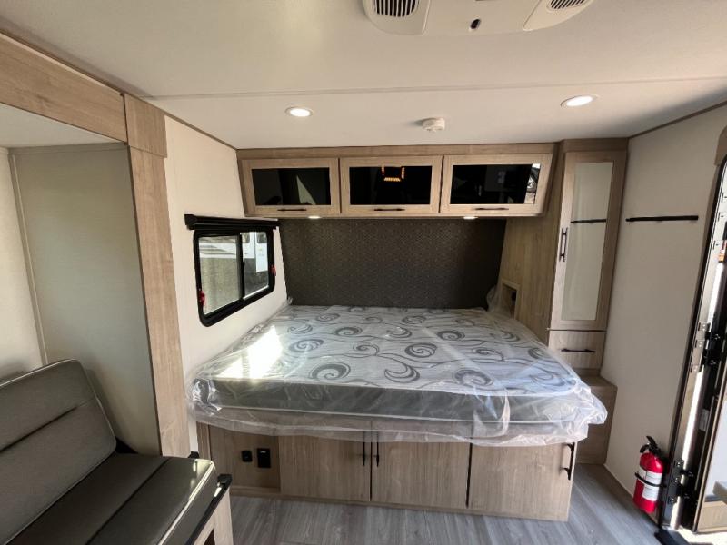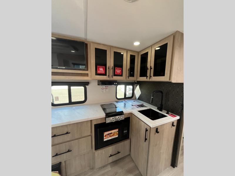 Pack your bags and head out on a fun camping trip in this travel trailer! The front queen bed offers a comfortable place to sleep at night, as well as the roll-over sleeper sofa slide with drawers for storage. You can make meals on the cooktop or in the convection microwave. The full rear bathroom has a walk-in shower with an oversized vanity to easily get ready each day. Outside, you'll find a spray port, an unobstructed pass-thru storage, and an interior/exterior table to use at your convenience.