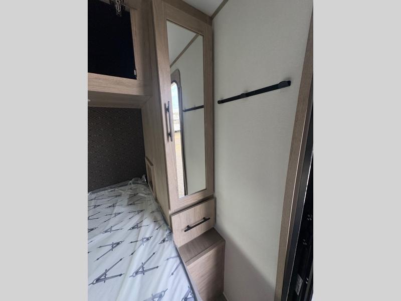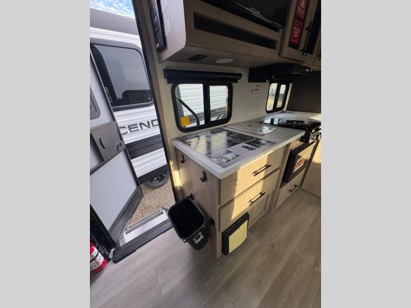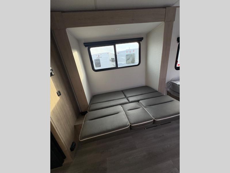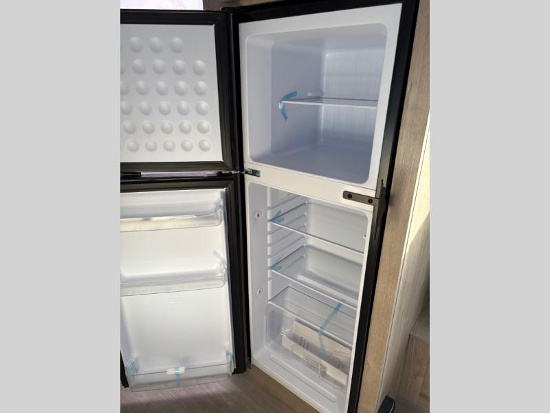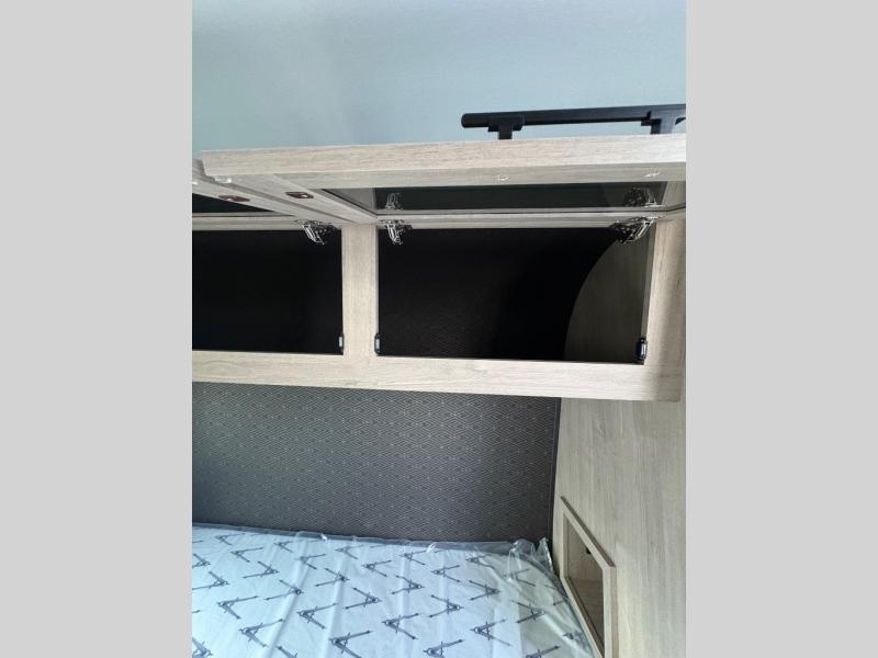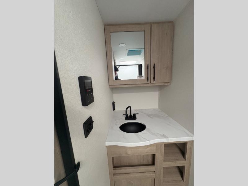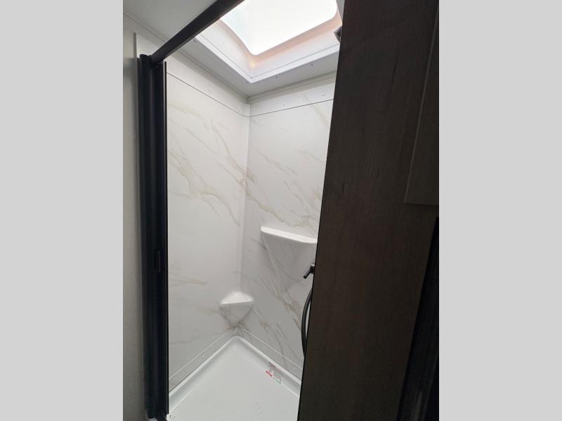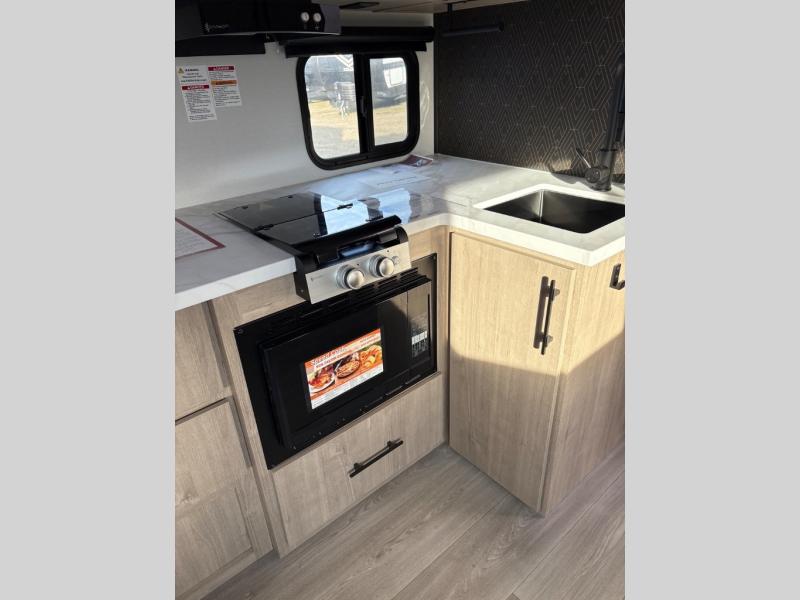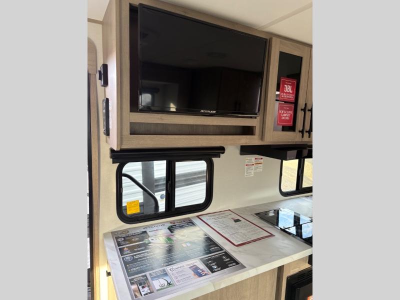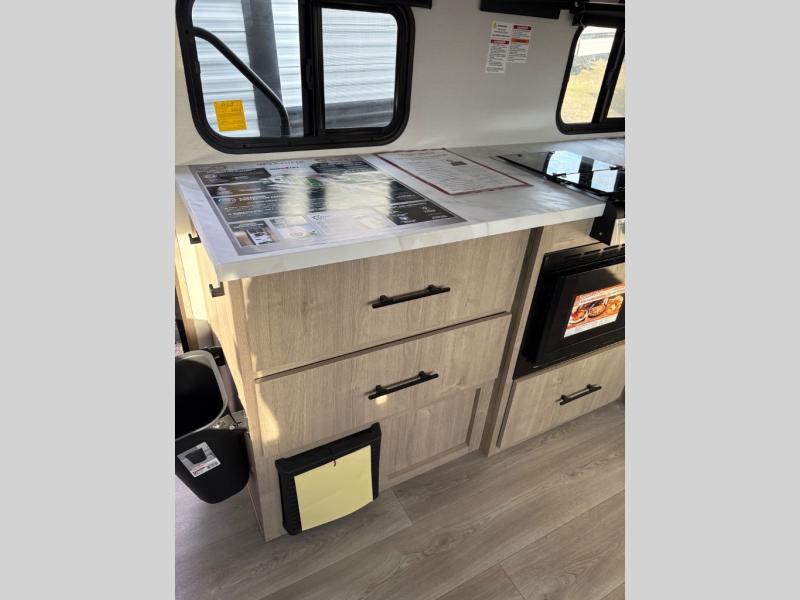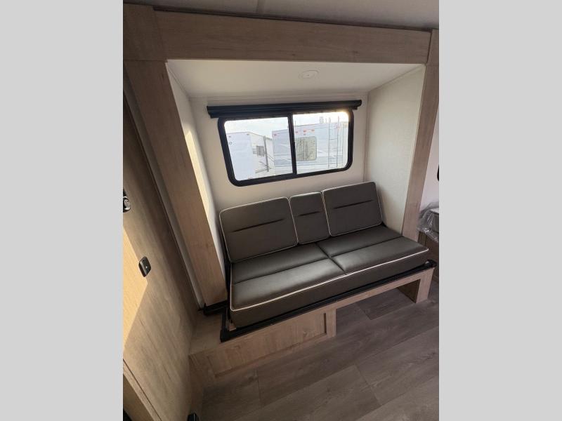 Pack your bags and head out on a fun camping trip in this travel trailer! The front queen bed offers a comfortable place to sleep at night, as well as the roll-over sleeper sofa slide with drawers for storage. You can make meals on the cooktop or in the convection microwave. The full rear bathroom has a walk-in shower with an oversized vanity to easily get ready each day. Outside, you'll find a spray port, an unobstructed pass-thru storage, and an interior/exterior table to use at your convenience.