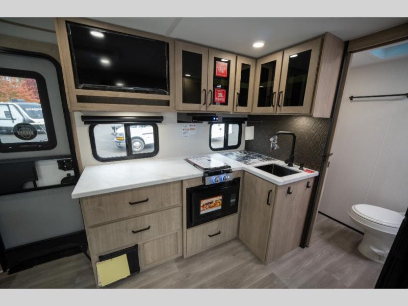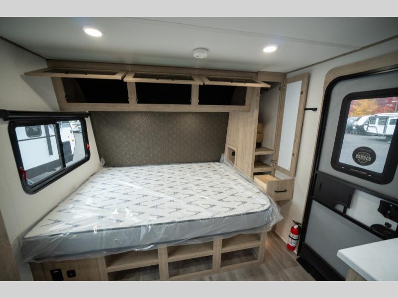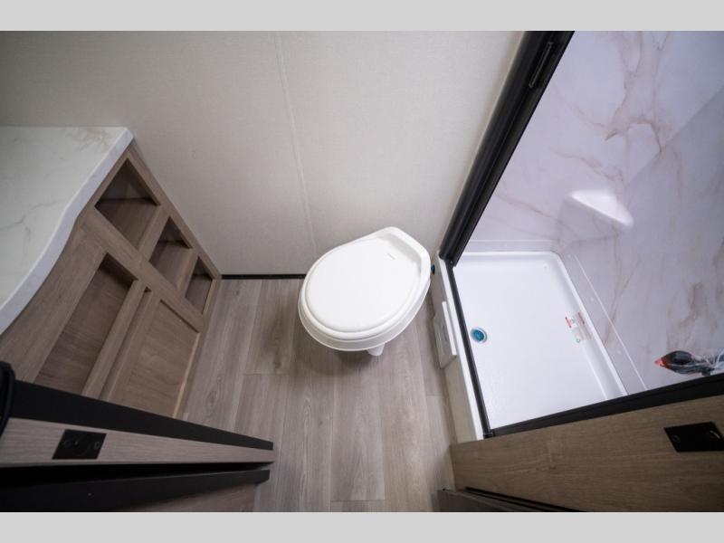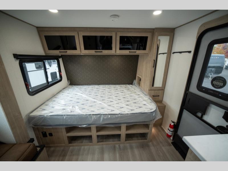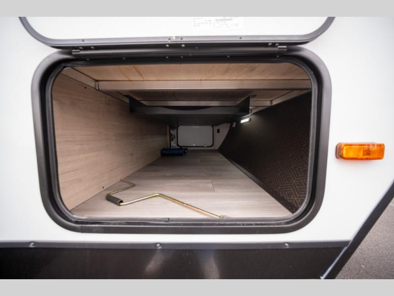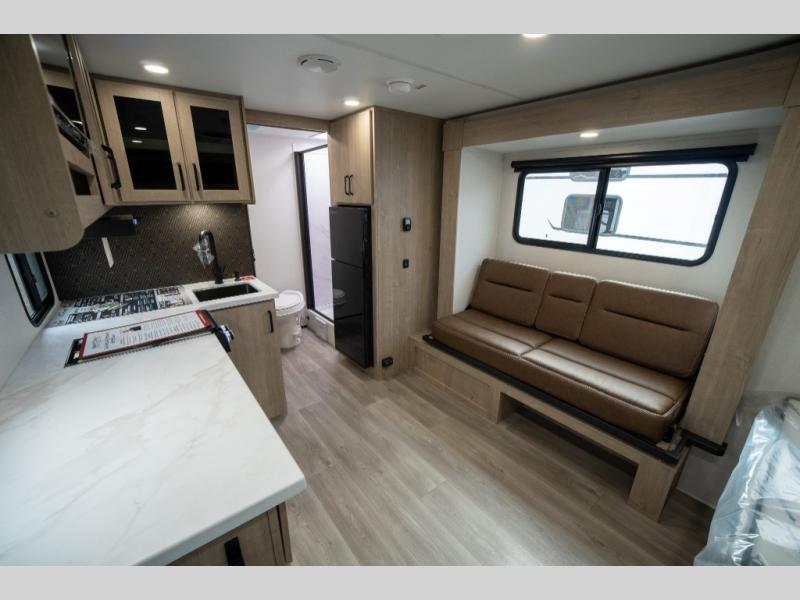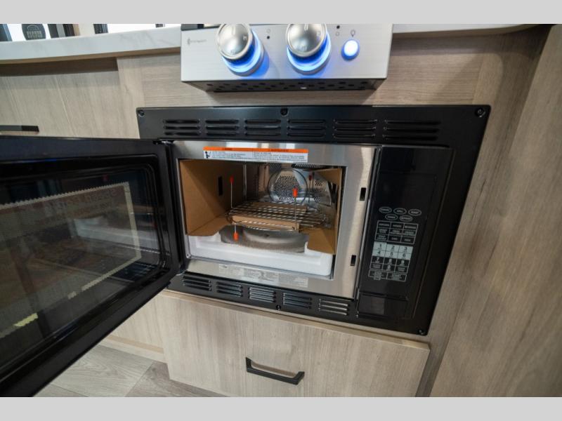Pack your bags and head out on a fun camping trip in this travel trailer! The front queen bed offers a comfortable place to sleep at night, as well as the roll-over sleeper sofa slide with shoe storage. You can make meals on the cooktop or in the convection microwave. The full rear bathroom has a walk-in shower with an oversized vanity to easily get ready each day. Outside, you'll find a spray port, an unobstructed pass-thru storage, and an interior/exterior table to use at your convenience.