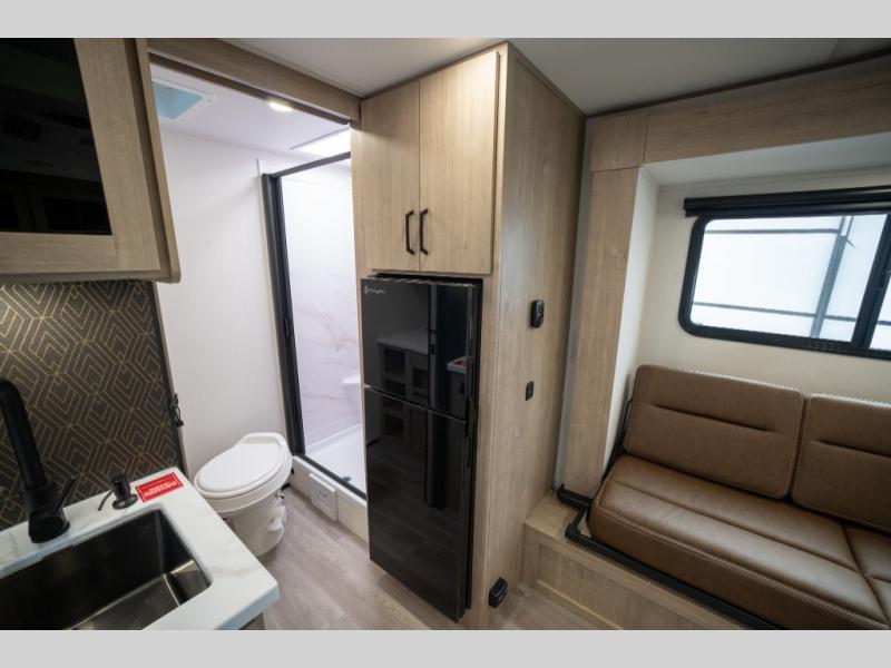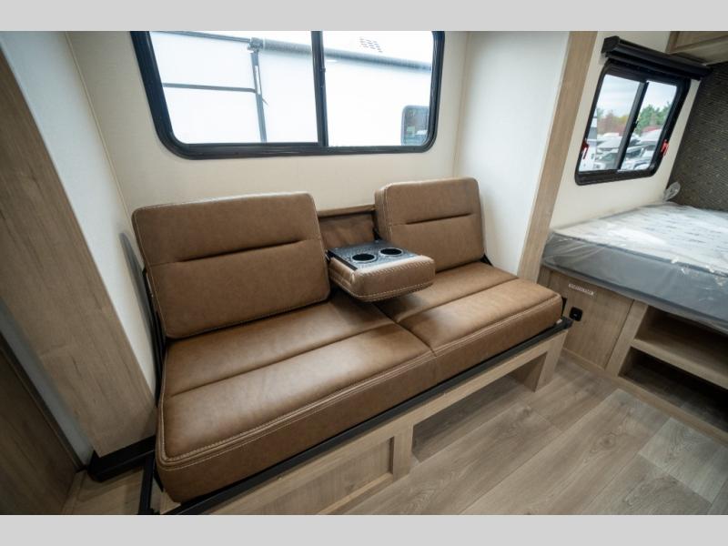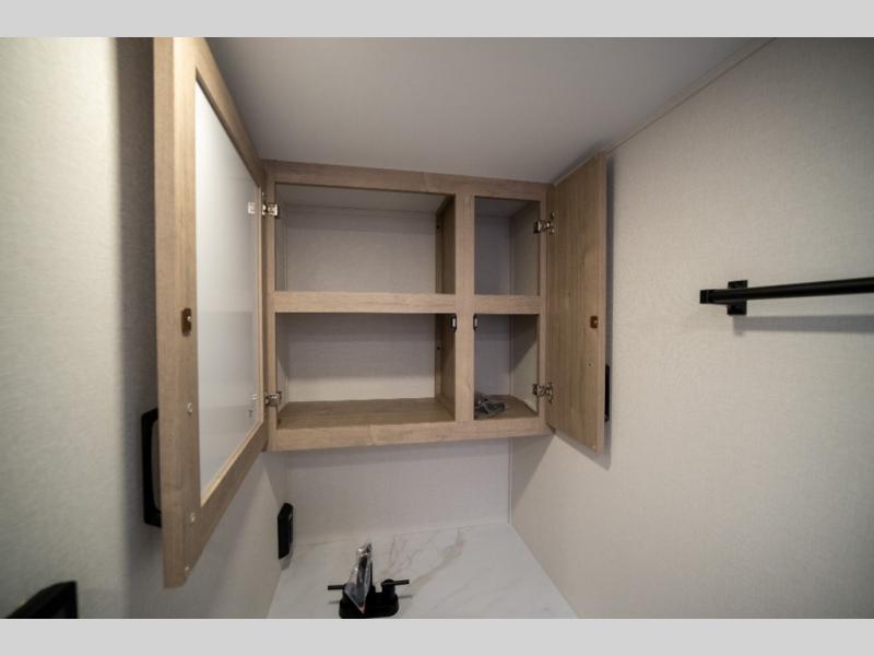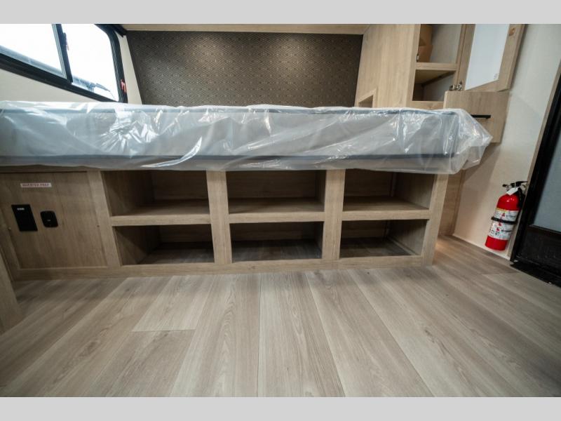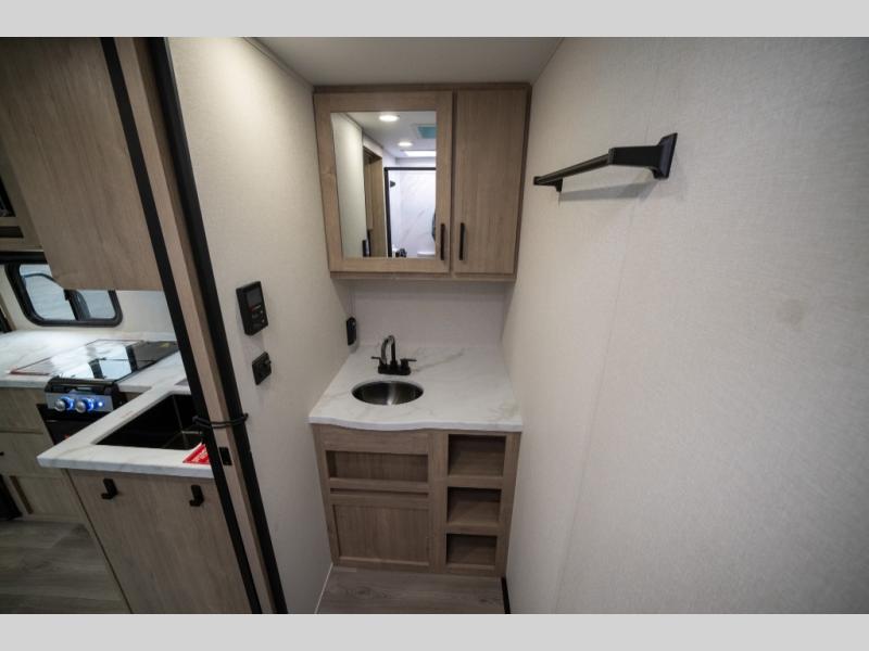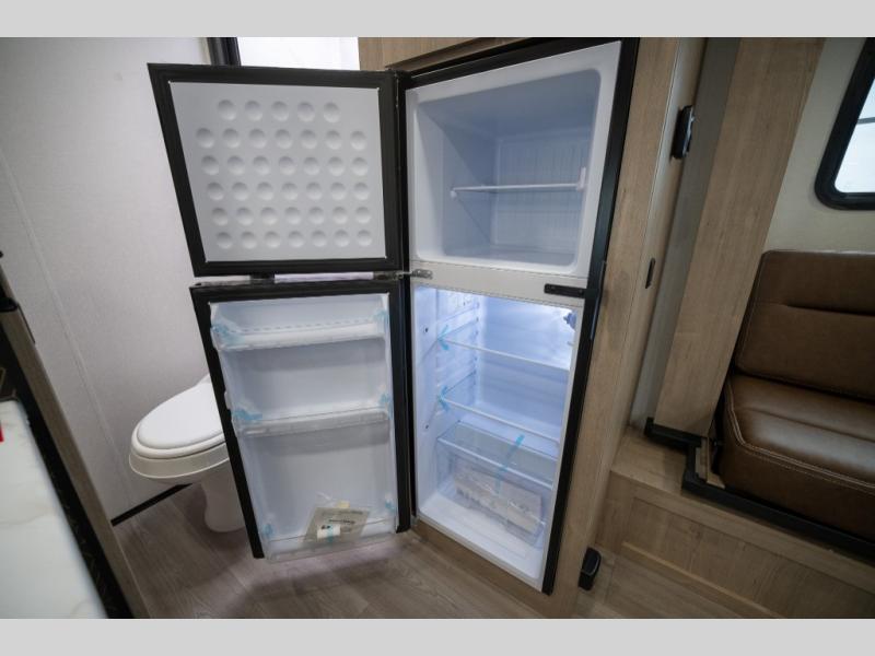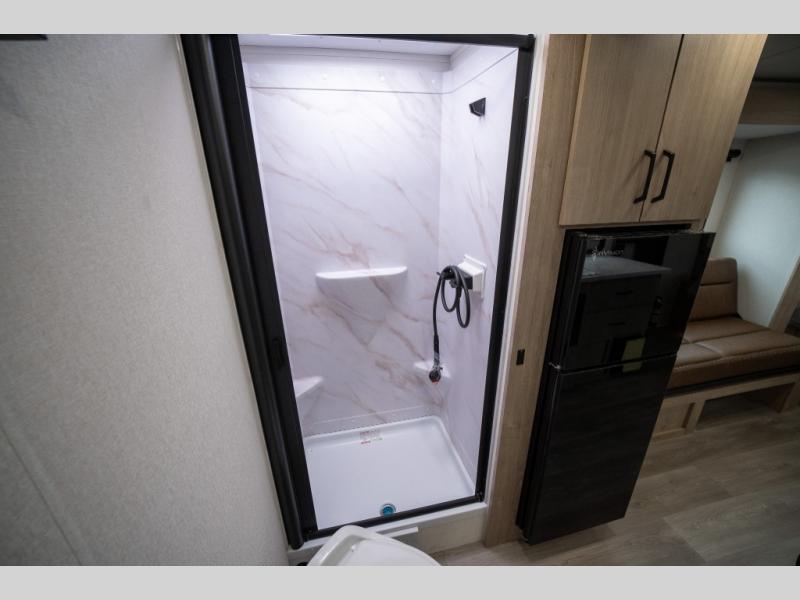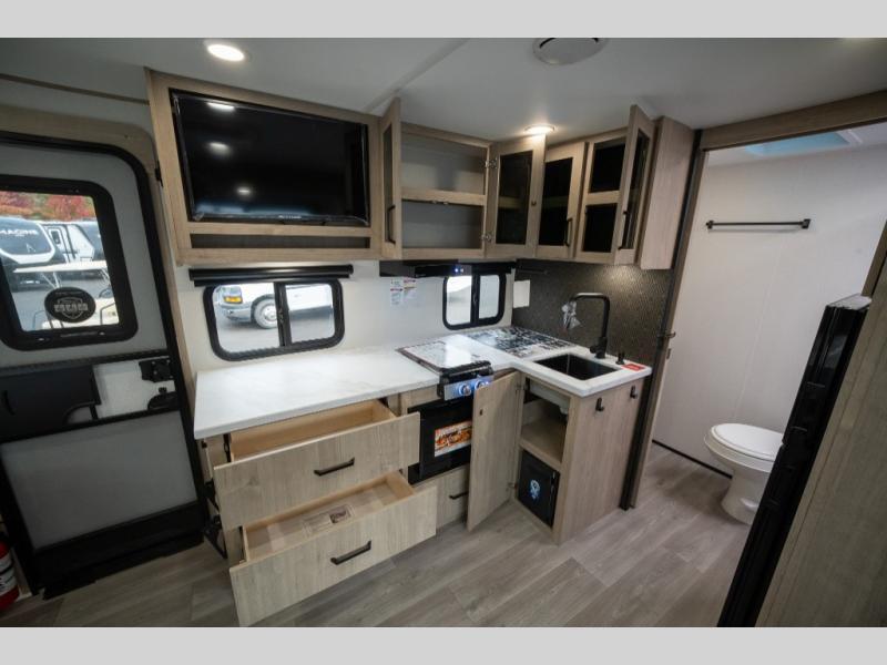 Pack your bags and head out on a fun camping trip in this travel trailer! The front queen bed offers a comfortable place to sleep at night, as well as the roll-over sleeper sofa slide with shoe storage. You can make meals on the cooktop or in the convection microwave. The full rear bathroom has a walk-in shower with an oversized vanity to easily get ready each day. Outside, you'll find a spray port, an unobstructed pass-thru storage, and an interior/exterior table to use at your convenience.