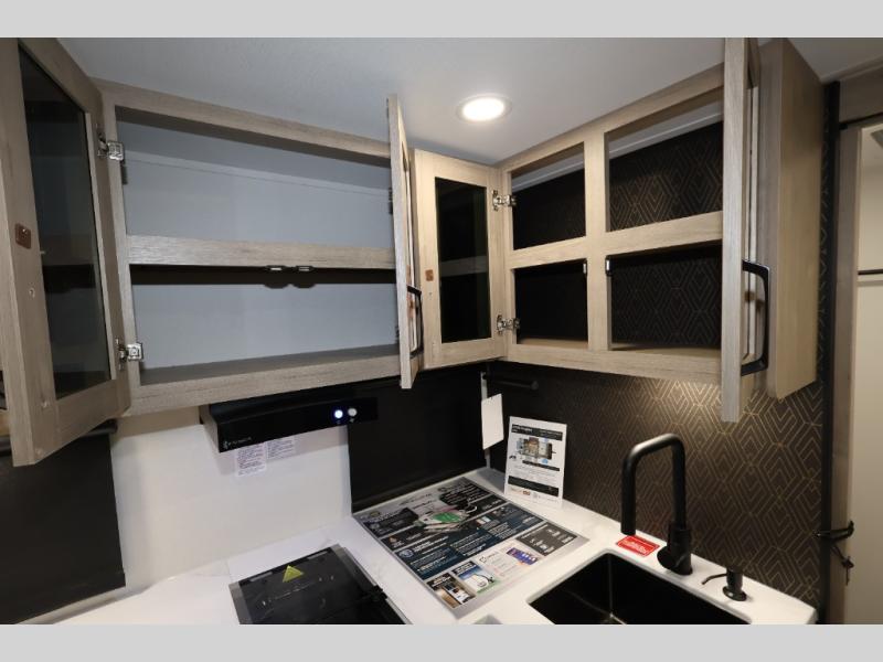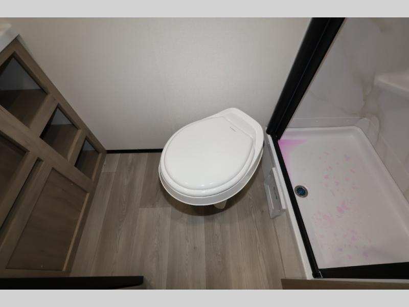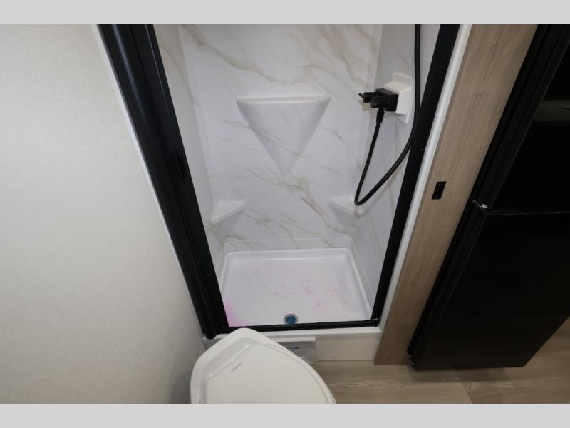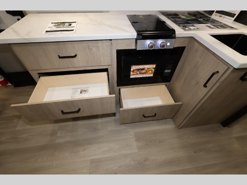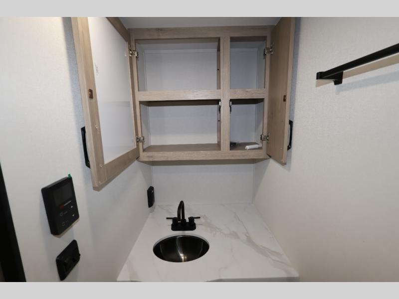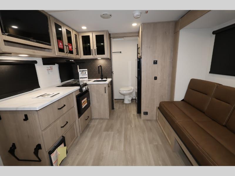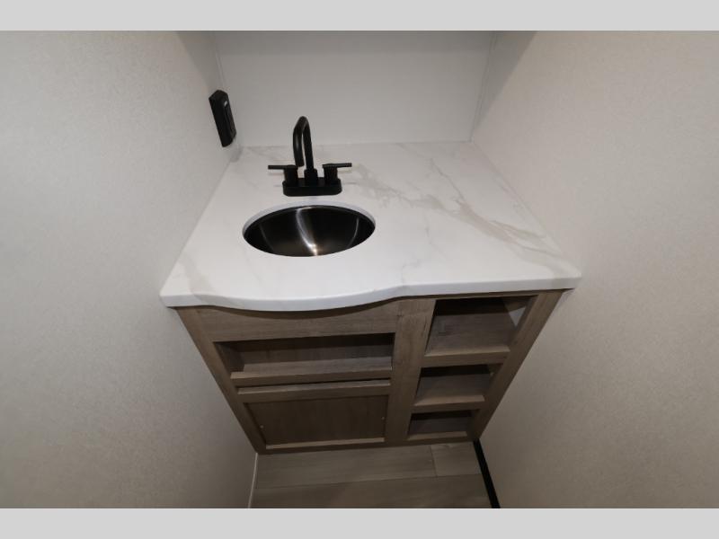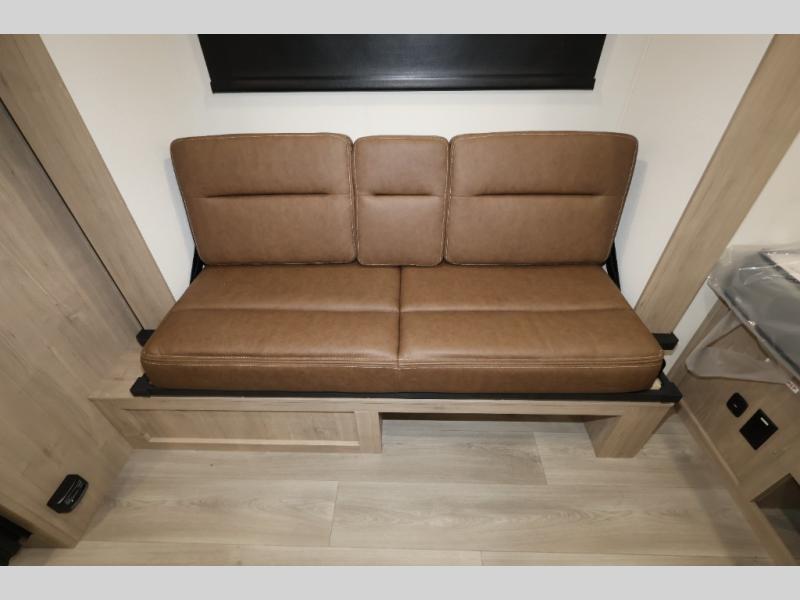 Pack your bags and head out on a fun camping trip in this travel trailer! The front queen bed offers a comfortable place to sleep at night, as well as the roll-over sleeper sofa slide with shoe storage. You can make meals on the cooktop or in the convection microwave. The full rear bathroom has a walk-in shower with an oversized vanity to easily get ready each day. Outside, you'll find a spray port, an unobstructed pass-thru storage, and an interior/exterior table to use at your convenience.