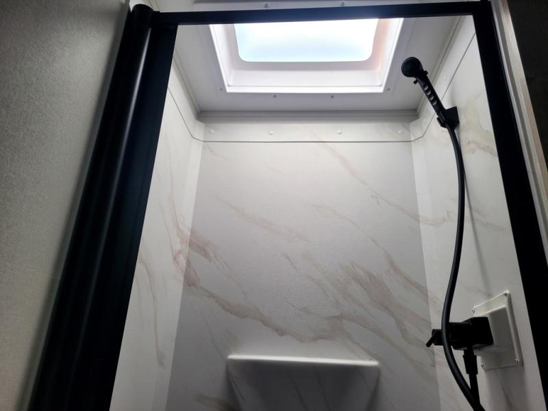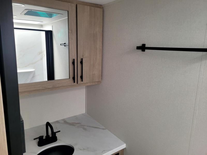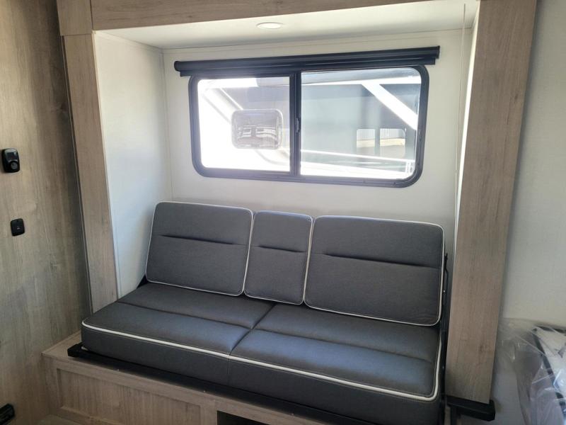 Pack your bags and head out on a fun camping trip in this travel trailer! The front queen bed offers a comfortable place to sleep at night, as well as the roll-over sleeper sofa slide with shoe storage. You can make meals on the cooktop or in the convection microwave. The full rear bathroom has a walk-in shower with an oversized vanity to easily get ready each day. Outside, you'll find a spray port, an unobstructed pass-thru storage, and an interior/exterior table to use at your convenience.