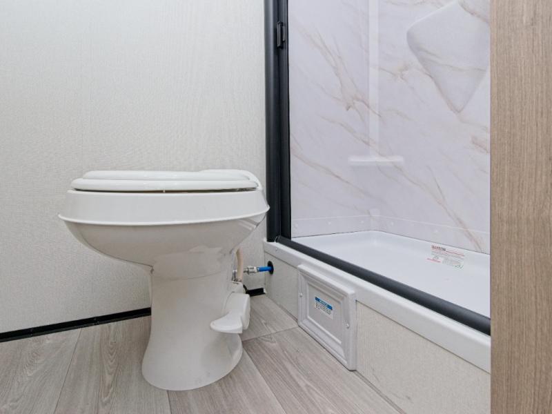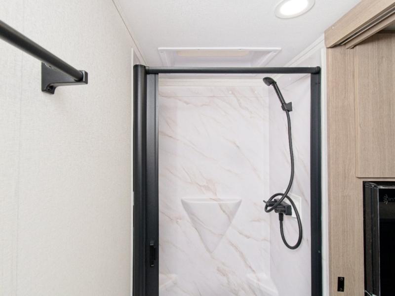 The full rear bathroom provides a refreshing retreat with its spacious walk-in shower and oversized vanity—ideal for getting ready without feeling cramped.