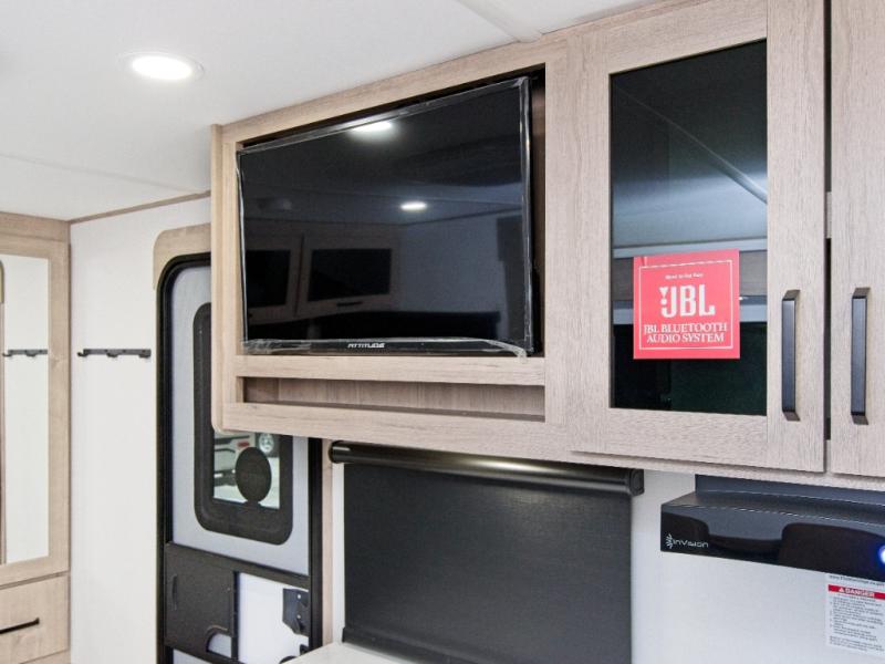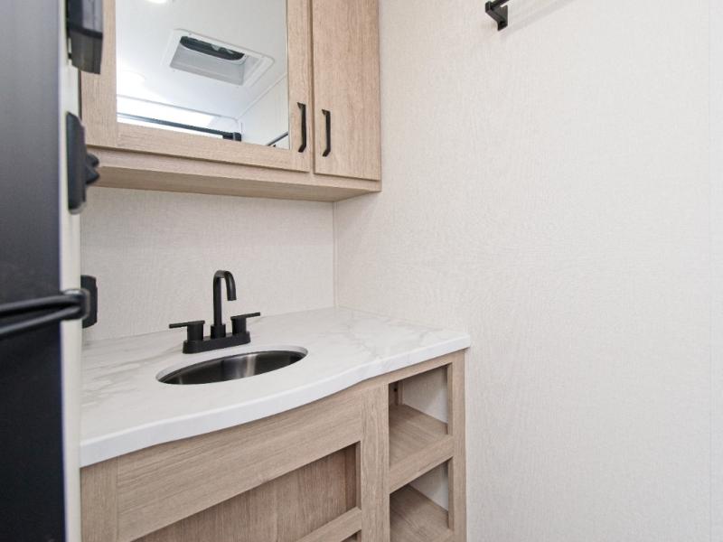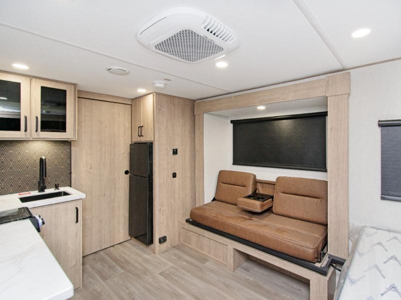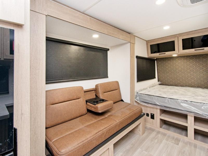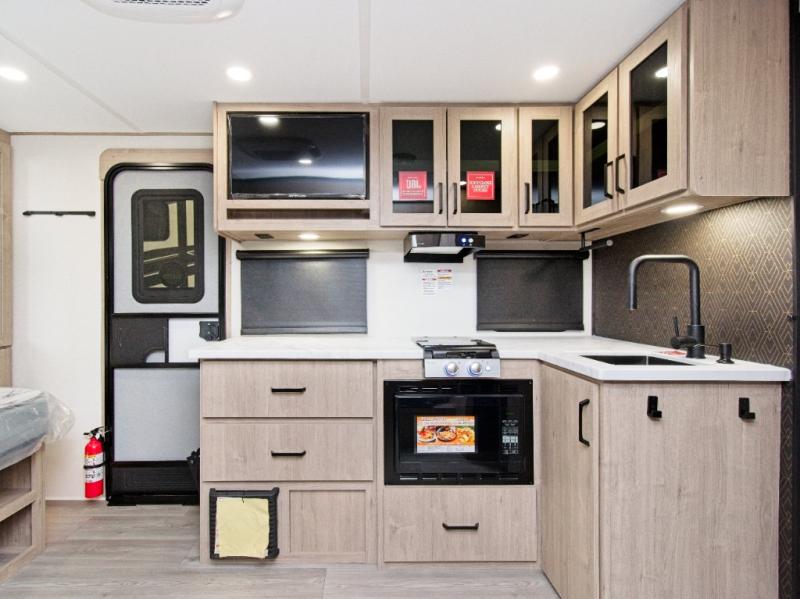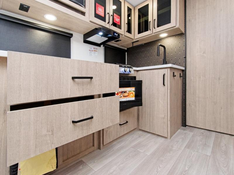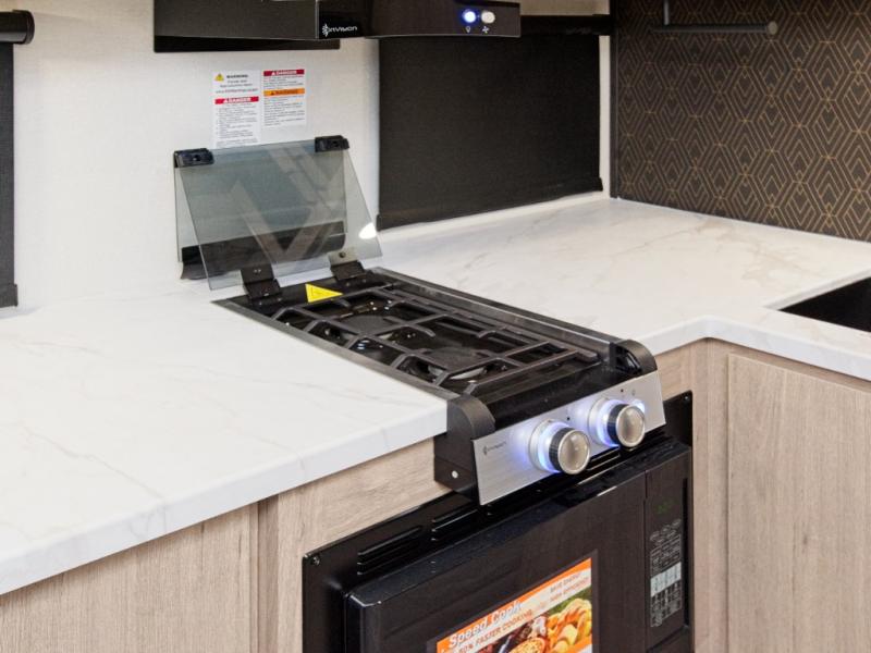 At the front, you’ll find a cozy queen bed paired with a roll-over sleeper sofa slide, complete with hidden shoe storage to keep your space tidy. Whip up meals easily using the cooktop or convection microwave, perfect for fast prep on busy travel days.