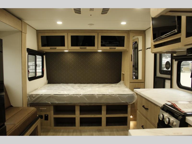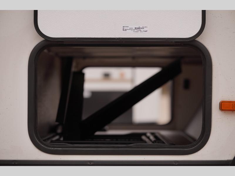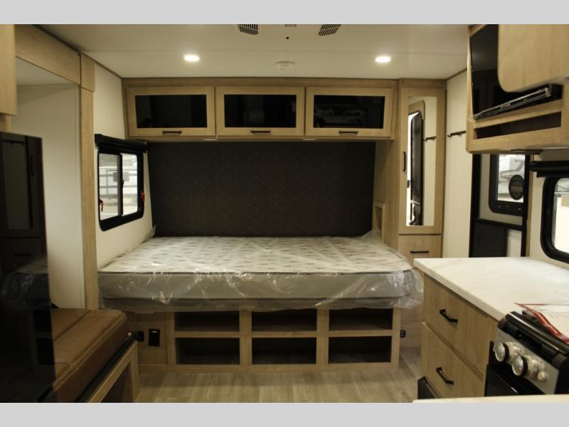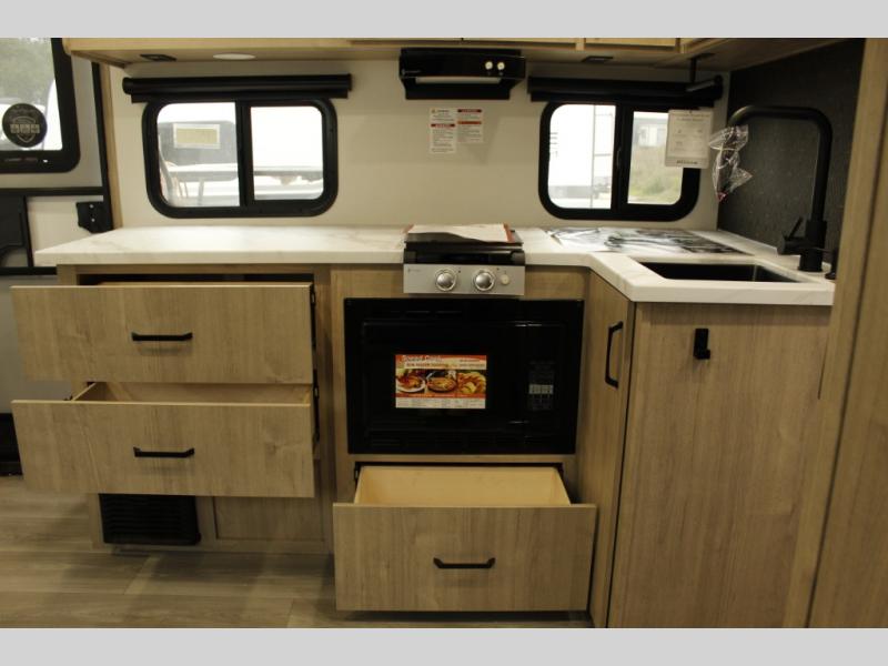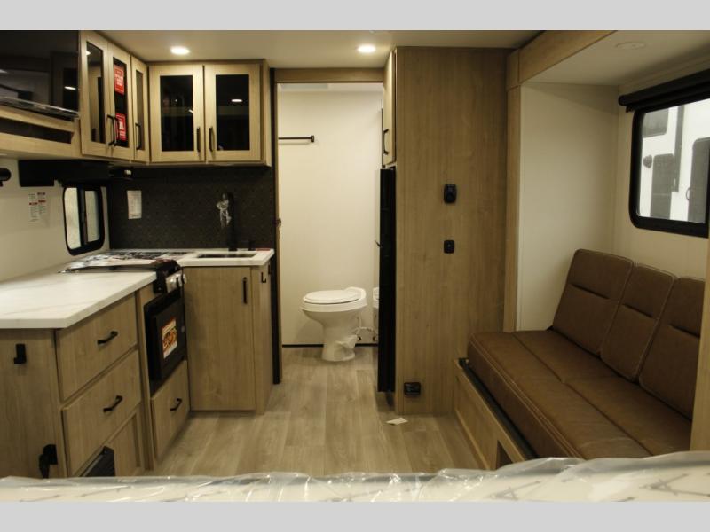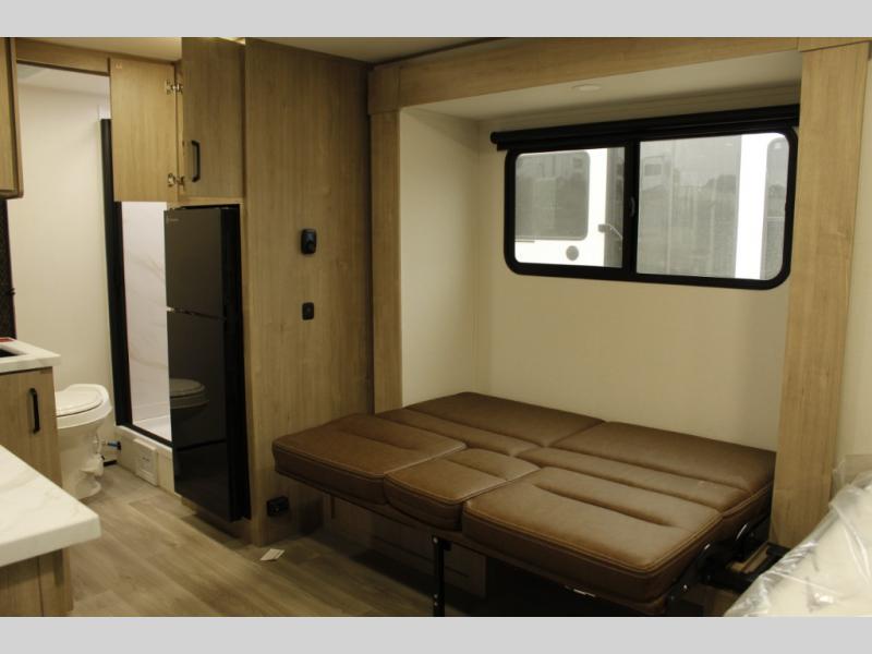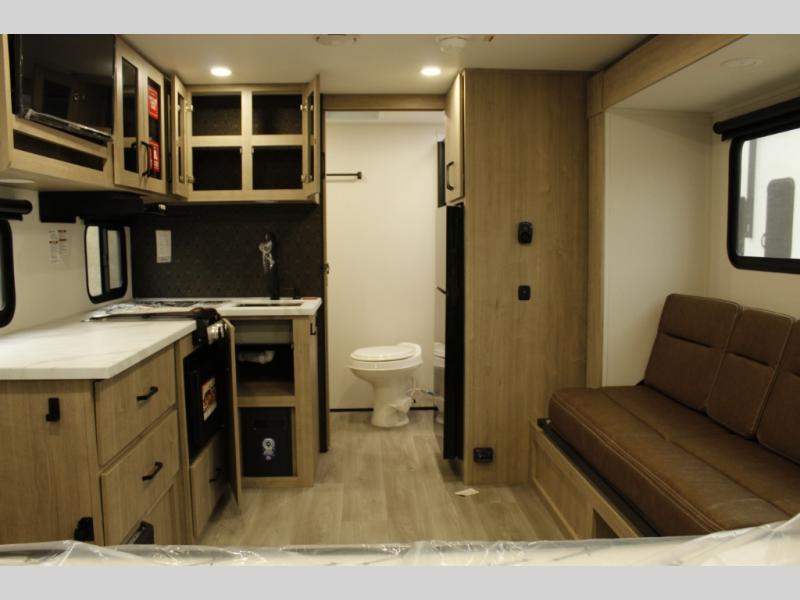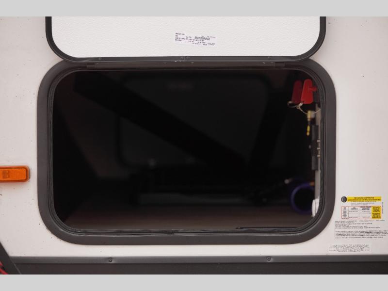 Pack your bags and head out on a fun camping trip in this travel trailer! The front queen bed offers a comfortable place to sleep at night, as well as the roll-over sleeper sofa slide with shoe storage. You can make meals on the cooktop or in the convection microwave. The full rear bathroom has a walk-in shower with an oversized vanity to easily get ready each day. Outside, you'll find a spray port, an unobstructed pass-thru storage, and an interior/exterior table to use at your convenience.
