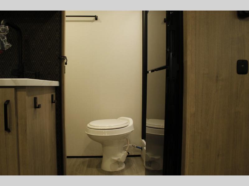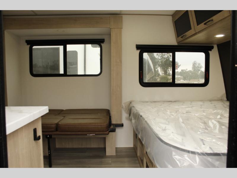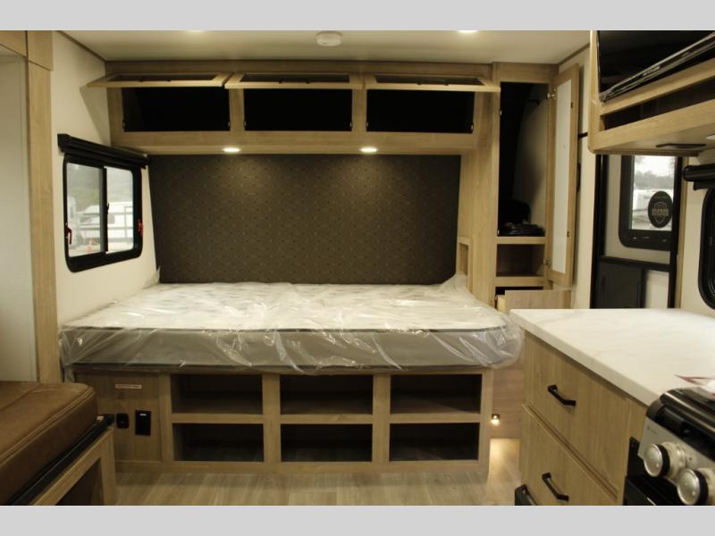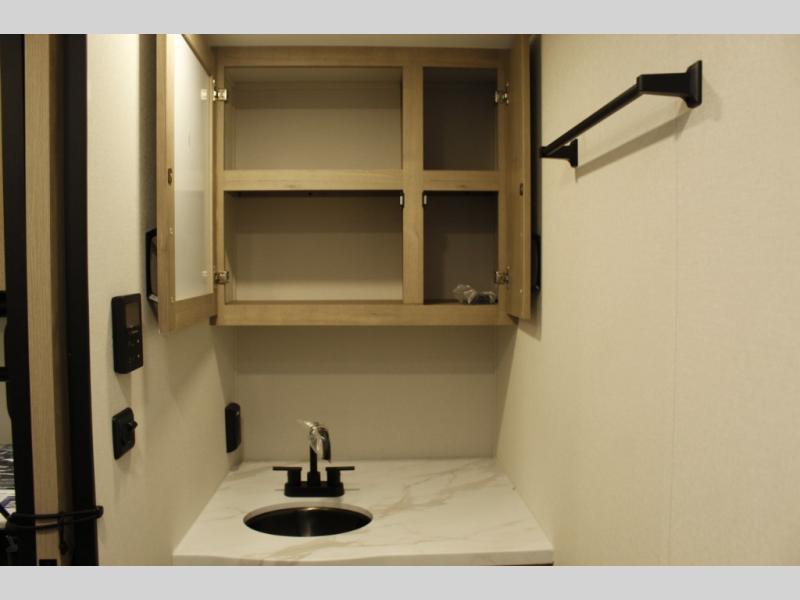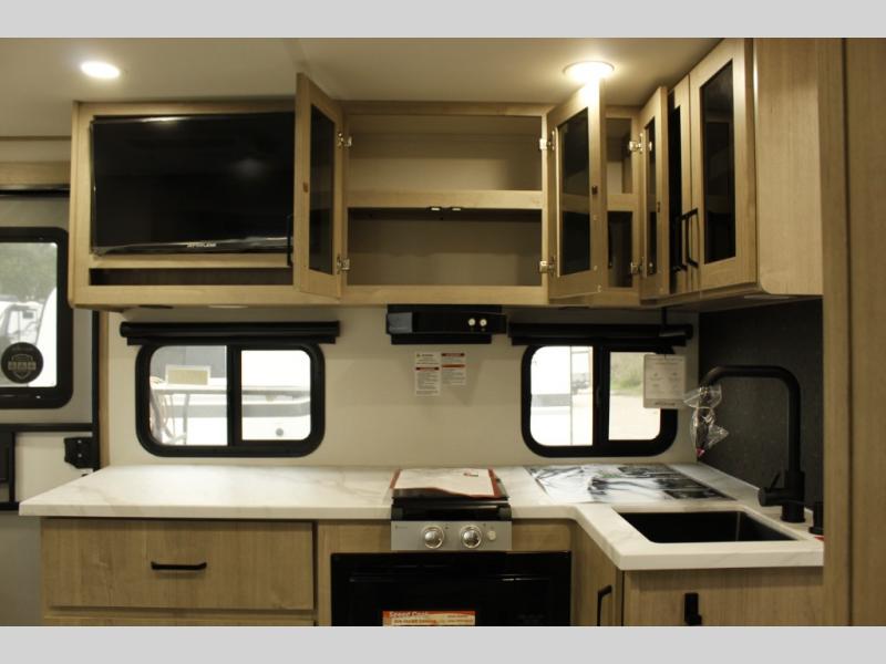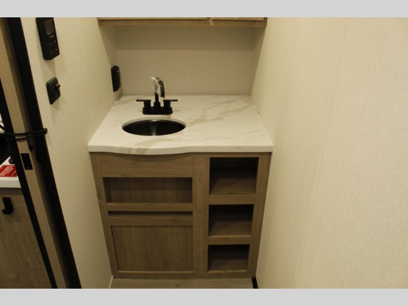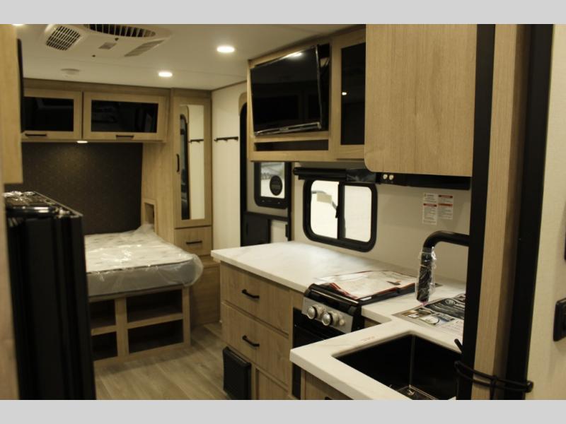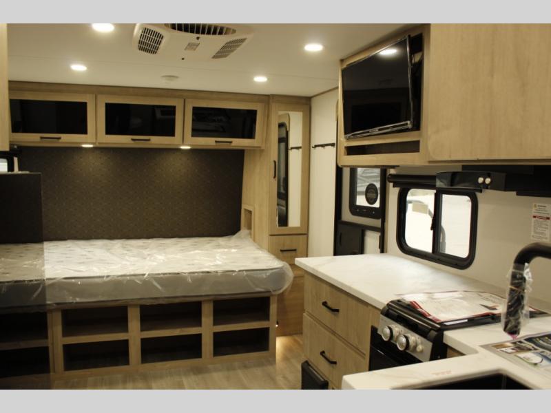 Pack your bags and head out on a fun camping trip in this travel trailer! The front queen bed offers a comfortable place to sleep at night, as well as the roll-over sleeper sofa slide with shoe storage. You can make meals on the cooktop or in the convection microwave. The full rear bathroom has a walk-in shower with an oversized vanity to easily get ready each day. Outside, you'll find a spray port, an unobstructed pass-thru storage, and an interior/exterior table to use at your convenience.