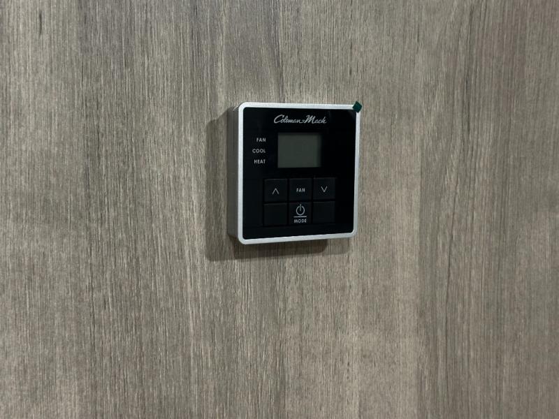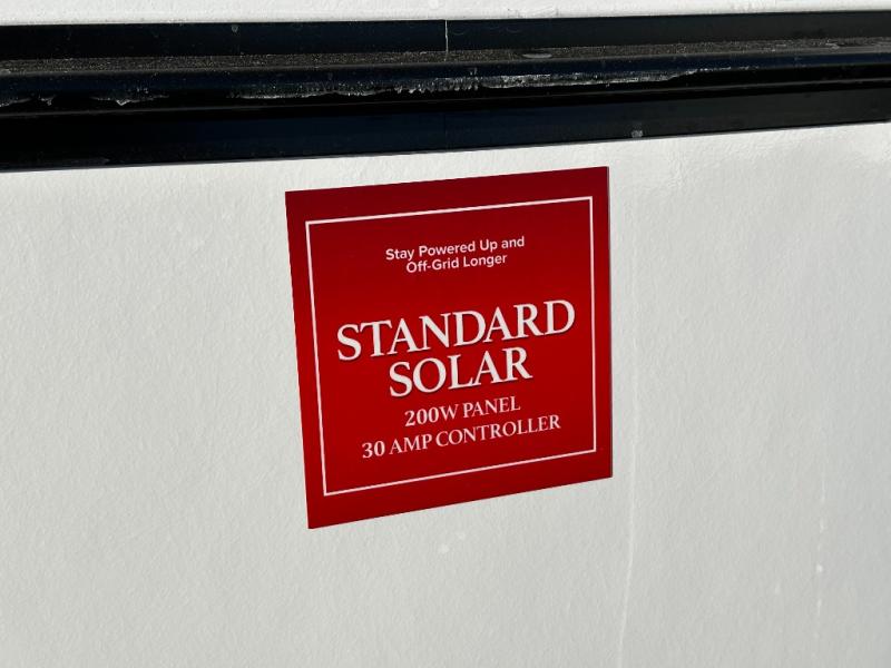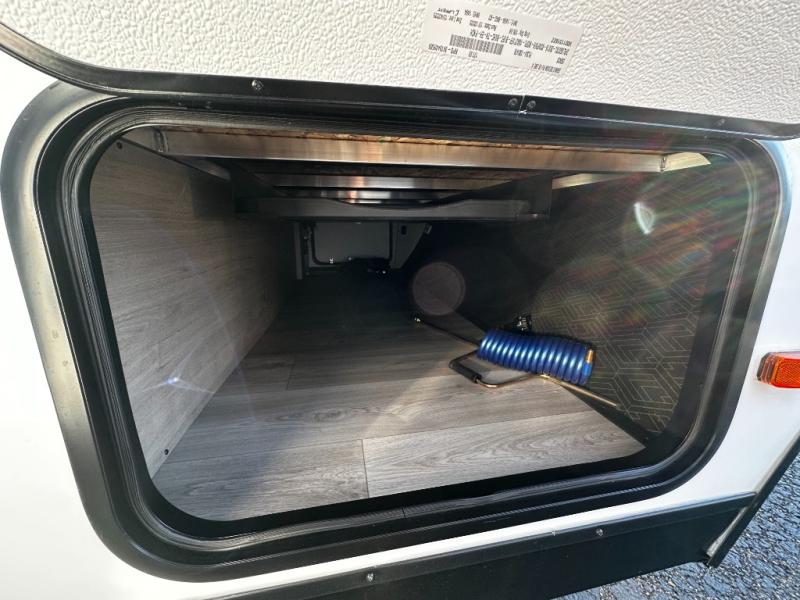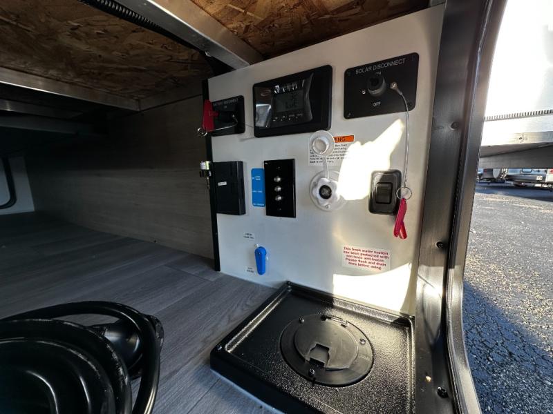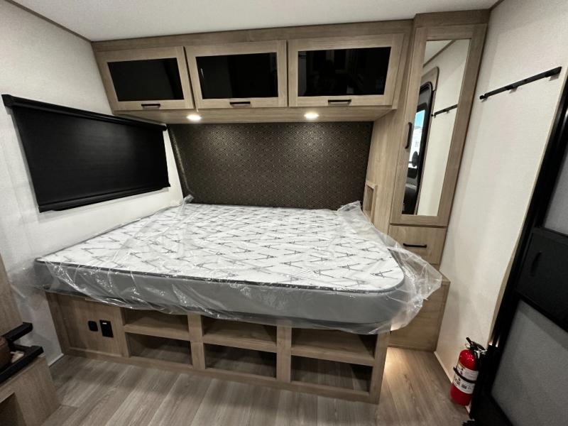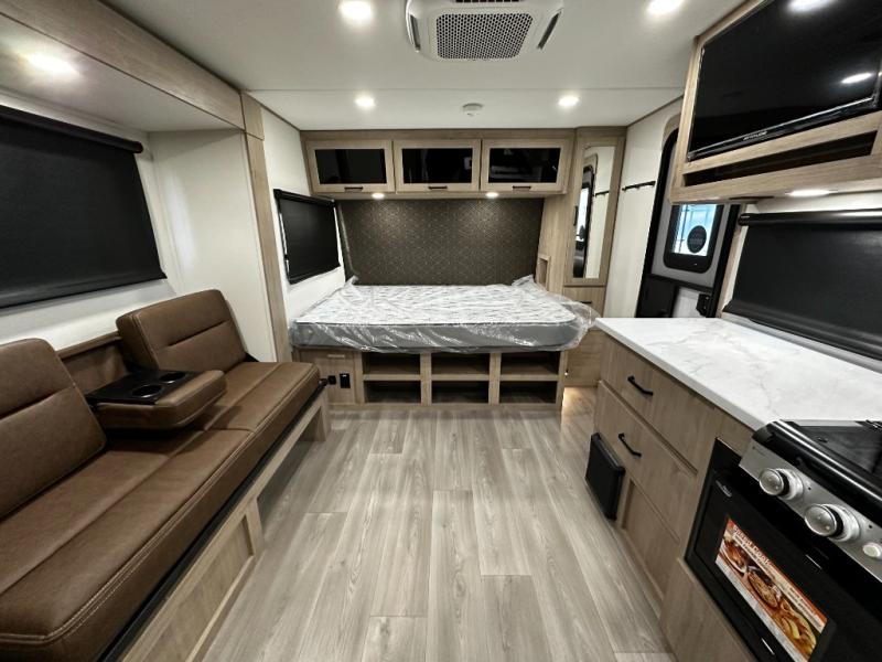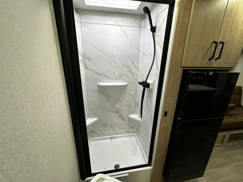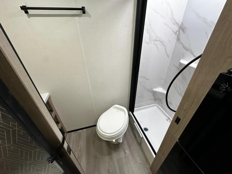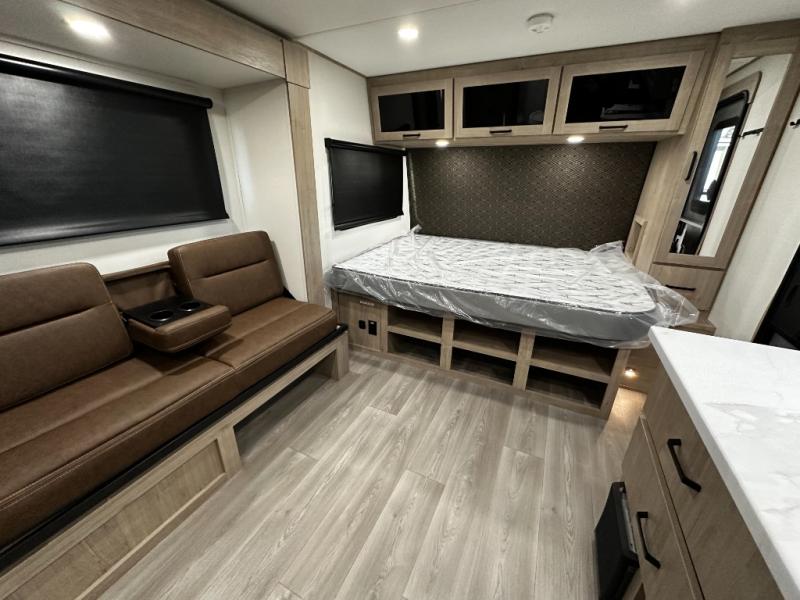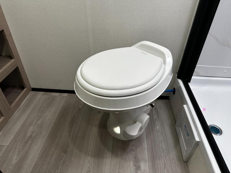 The private front sleeping area offers a comfortable bed with overhead storage, giving you a peaceful retreat at the end of the day. A well-designed bathroom includes a shower, vanity, and toilet, providing all the conveniences of home while on the road.