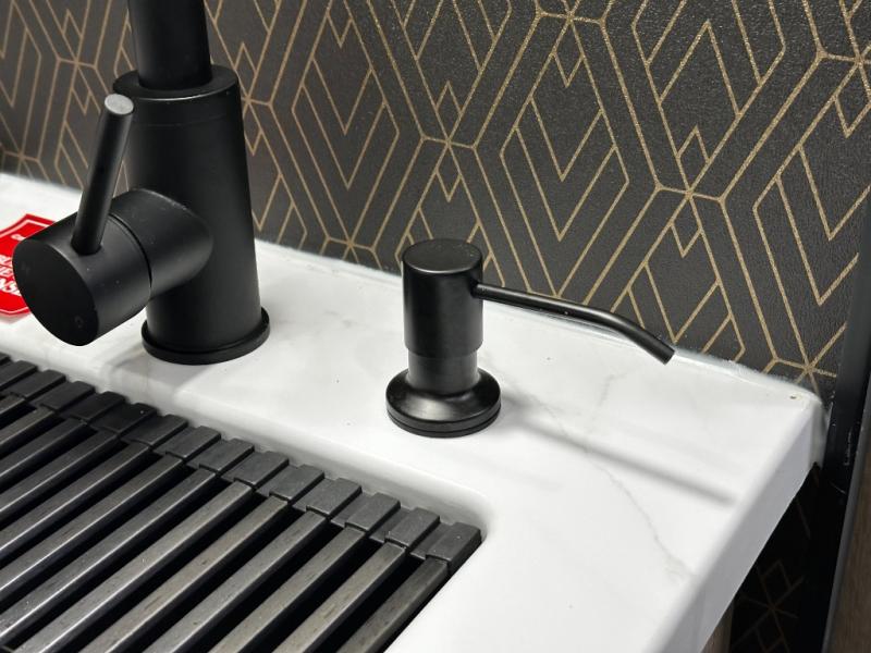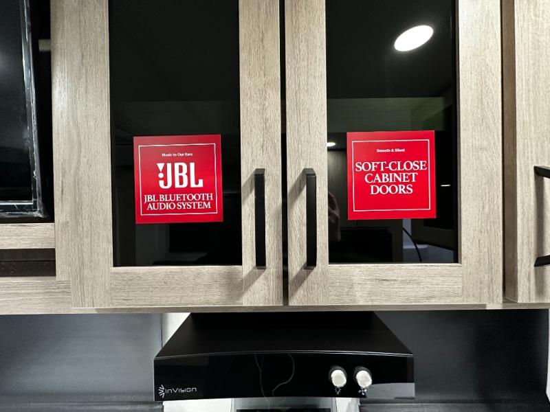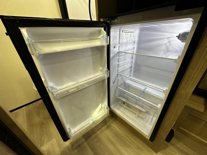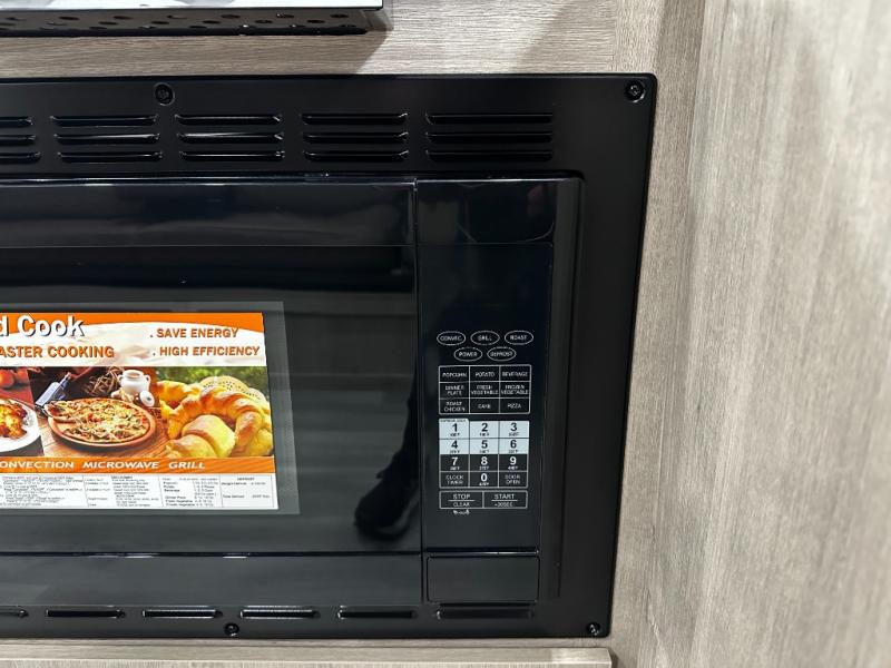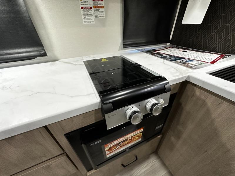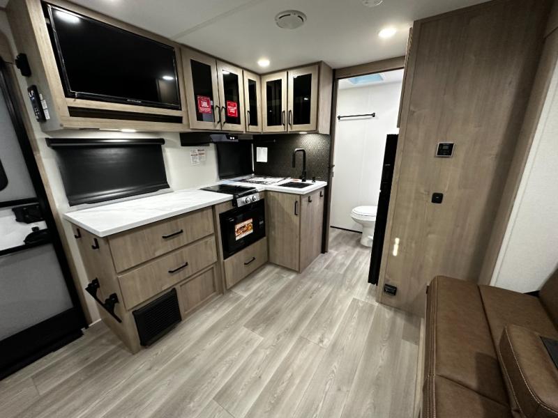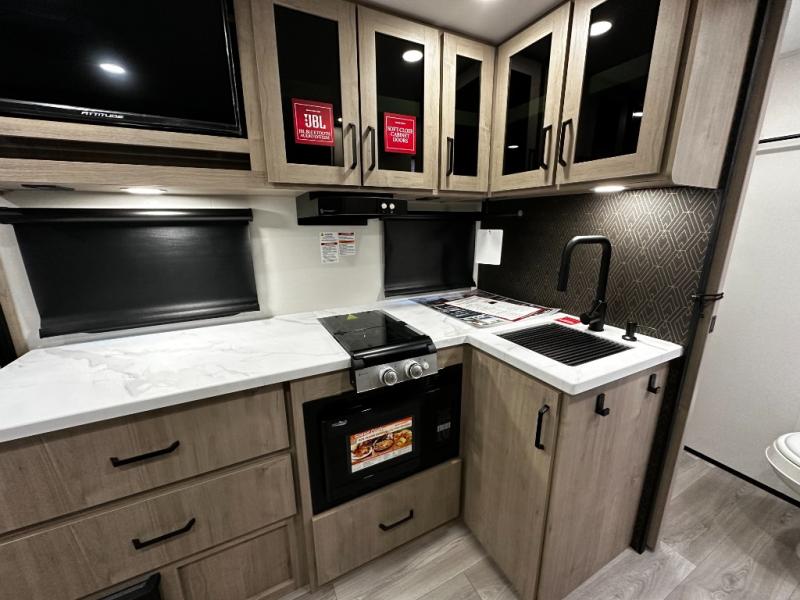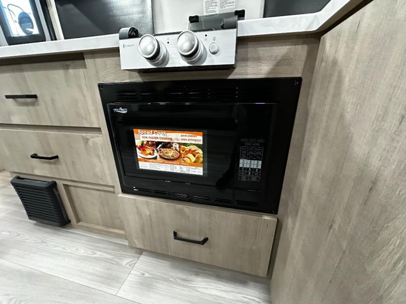The kitchen is efficient and well-equipped, featuring solid-surface countertops, a two-burner cooktop, microwave, refrigerator, and ample storage for essentials. Smart cabinetry and countertop space make meal prep simple, while the dinette provides a cozy place to dine or convert into additional sleeping space as needed.